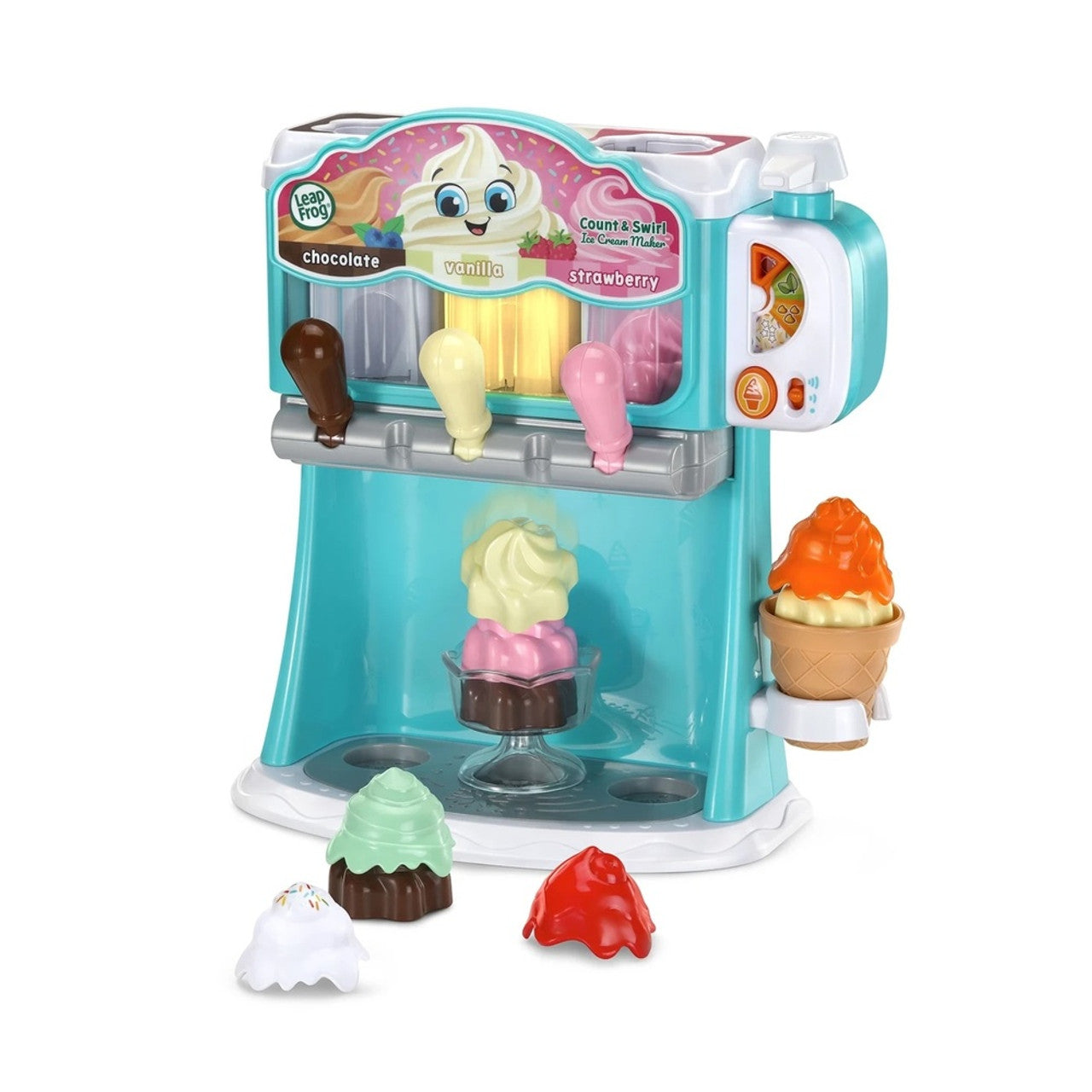 Serve up a sundae treat any day of the week with this three-flavor ice cream maker. Sort the chocolate, vanilla and strawberry ice cream swirls into the machine and it's ready to serve. Have an ice cream social or open a shop to complete customer orders and practice listening skills. Choose a cup or a cone and pull the levers to dispense favorite flavors. Satisfy that sweet tooth! Top the tasty treats with whipped cream, caramel, cherry or mint sauces. Press the pump to practice counting for a sweet way to learn numbers.