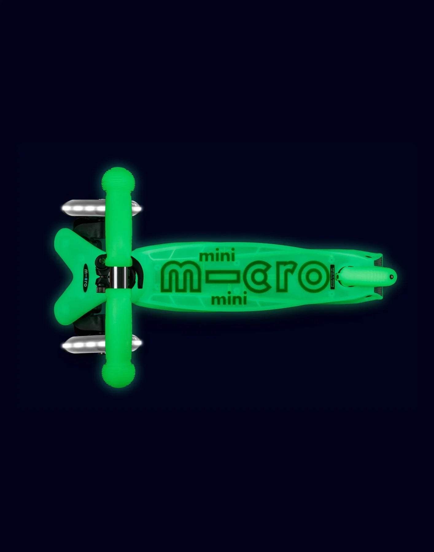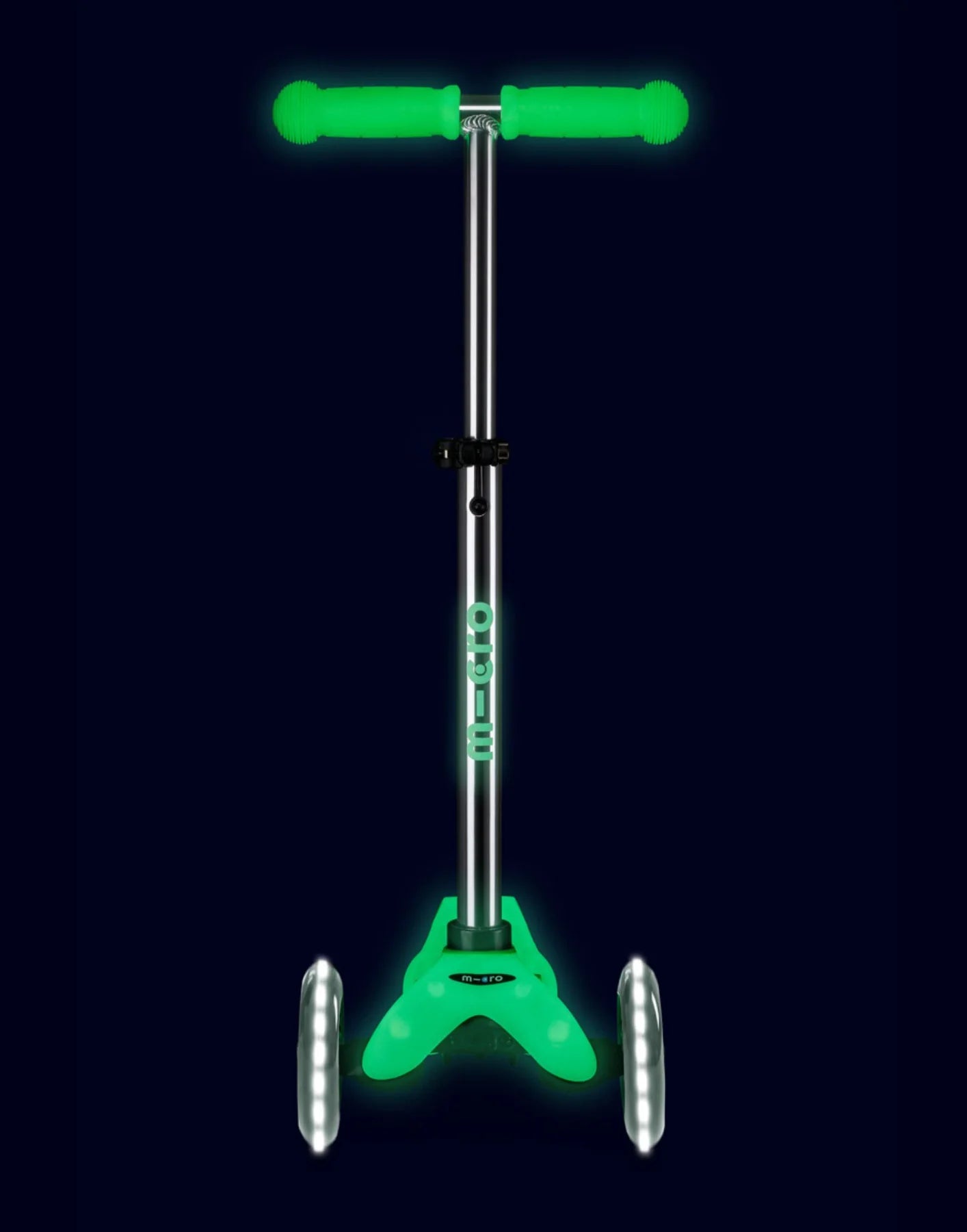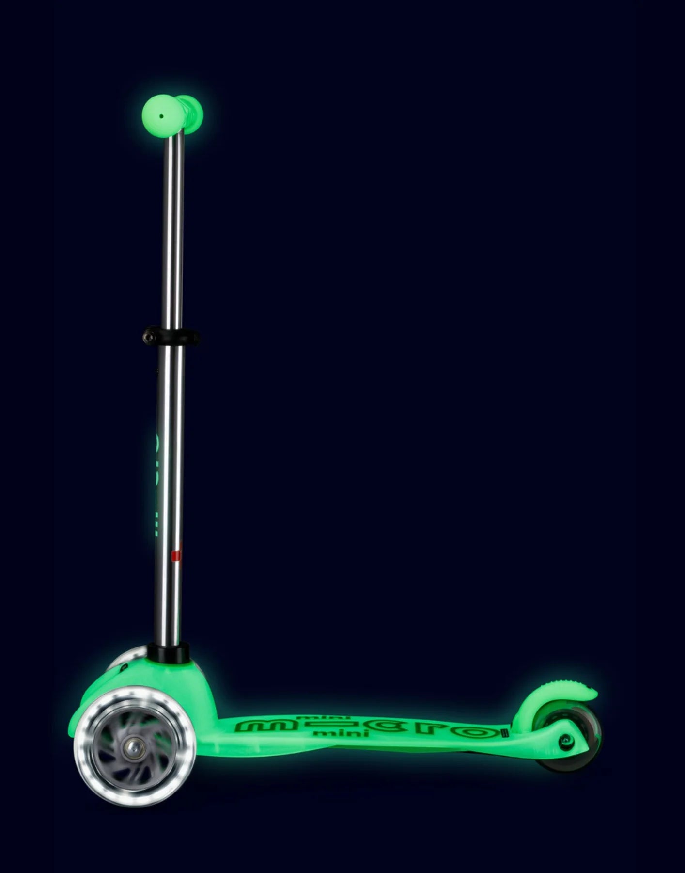 The ultimate Micro three-wheel scooter just got even cooler... Introducing the Mini Deluxe Glow LED Scooter! With its sleek glow-in-the-dark features, this scooter is sure to light up every ride.