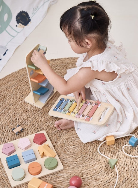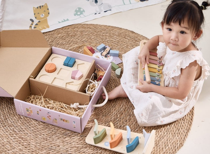The grow with me colour crafters box offers new challenges in rhythm, finger dexterity, colour and shape sorting and cause and effect, as well as early introduction to physics.