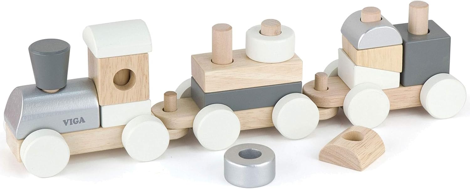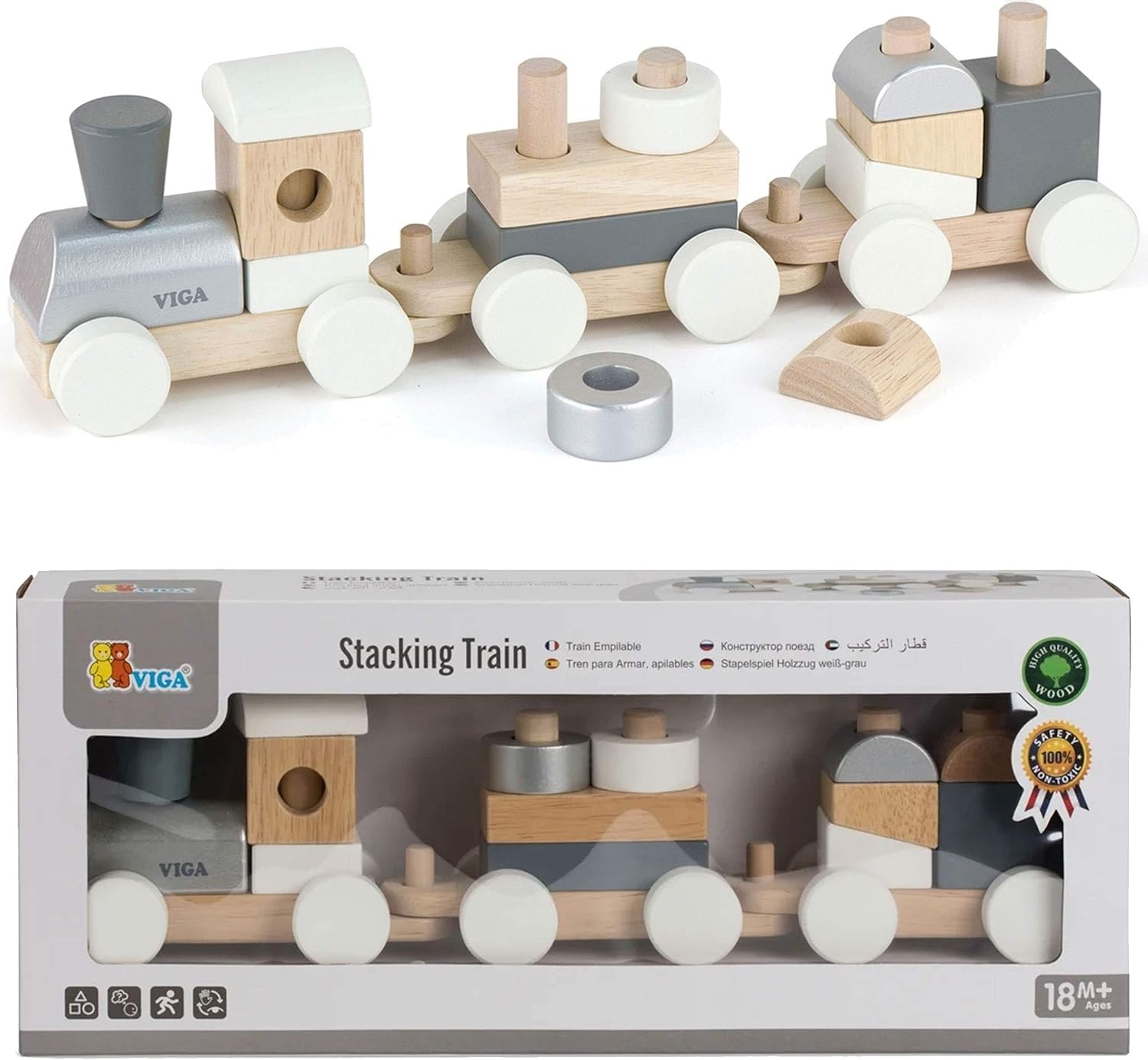 VIGA Stacking Train is made of high-quality beech wood and is designed in Scandinavian style. The train has 14 easy-to-grasp wooden blocks that slot onto rods on the front and back of the train. The blocks can be stacked in different ways to create different shapes and patterns. The train also has three platforms on wheels that can be used to carry additional blocks.