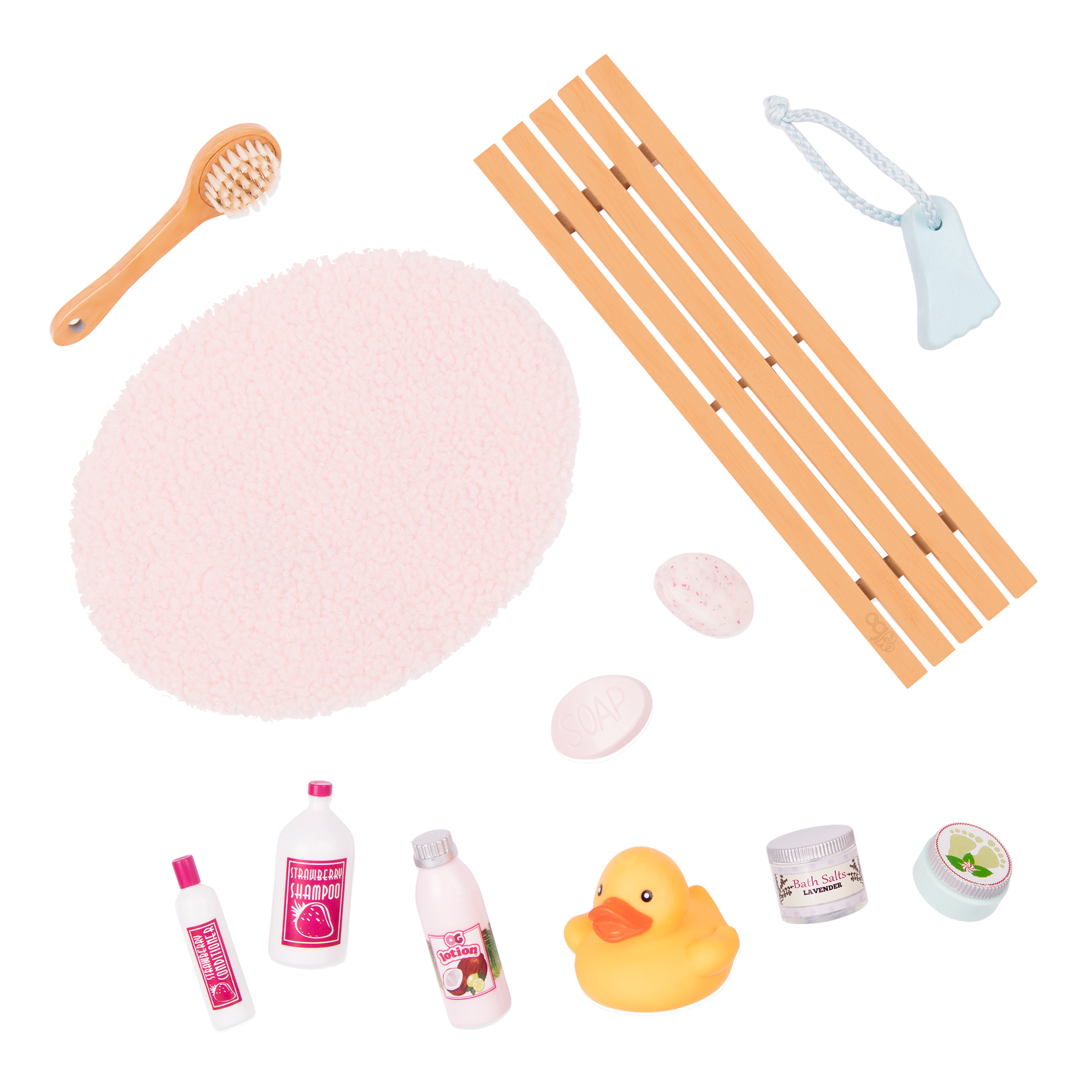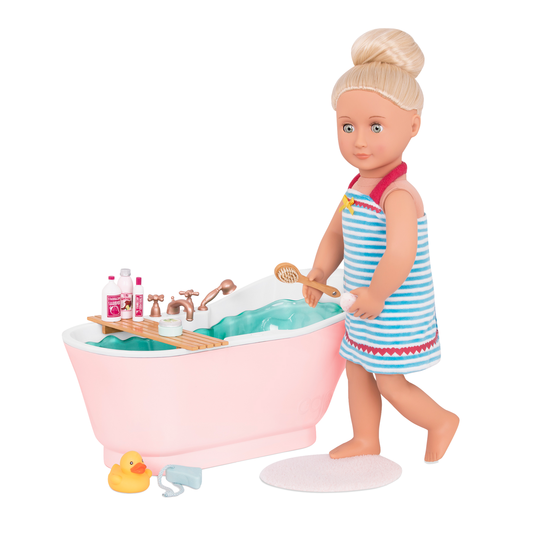 Splish-splash in the bath with the 13-piece Our Generation Bath and Bubbles set for 18-inch dolls! Turn the taps in this modern tub and use the extendable handheld faucet for those hard-to-reach spots. Push the button to hear real water sounds as you get ready for your bath. Put your favorite book or your beauty products on the wooden bath tray, and use the beauty items to get your doll squeaky clean. Don’t forget the rubber ducky – your best bath time pal! (Dolls sold separately)