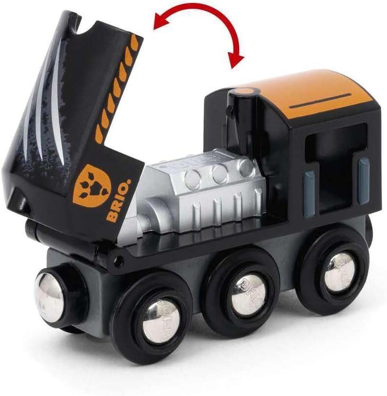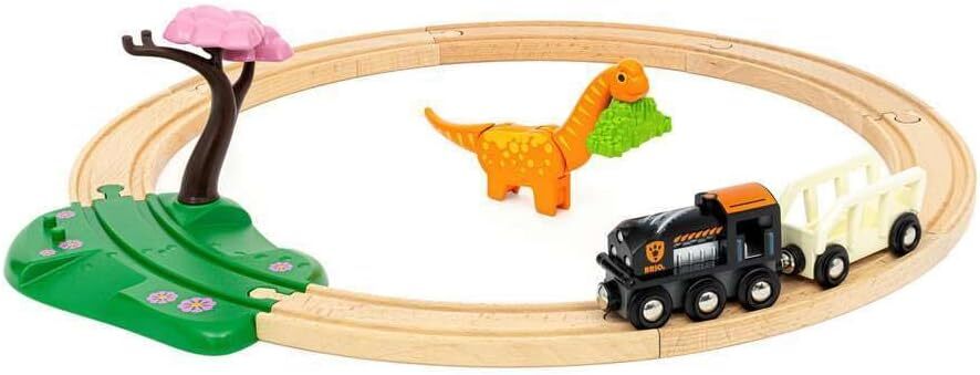 Roar! There's a dinosaur on the track in the BRIO Dinosaur Circle Set. This 12-piece dinosaur-themed train set includes a train with wagon, dinosaur figure, grassy meadow crossing and wooden tracks to complete the circle layout. Be careful as the train approaches the crossing as this colourful dinosaur loves to eat the leaves from the tree. Use its tail to raise and lower the dinosaurs head, then grab accessories with the classic BRIO magnet.