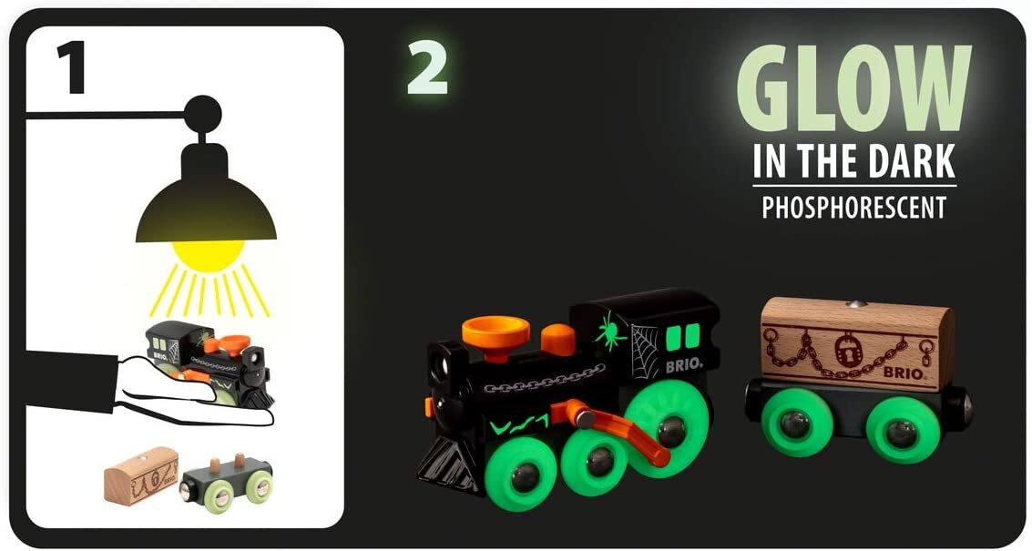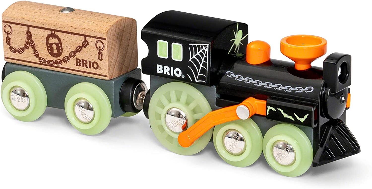 Something spooky is creeping along the train tracks. The BRIO Ghost Train comes with glow in the dark details and wooden casket in tow – but what could be inside? Featuring BRIO magnetic connections, this ghostly steam train is ready to connect to other vehicles and wagons and haunt BRIO World.