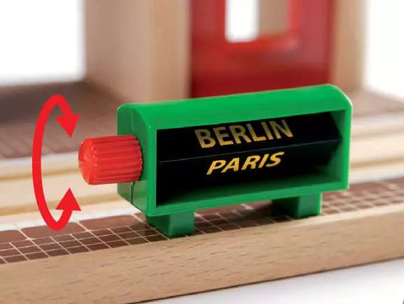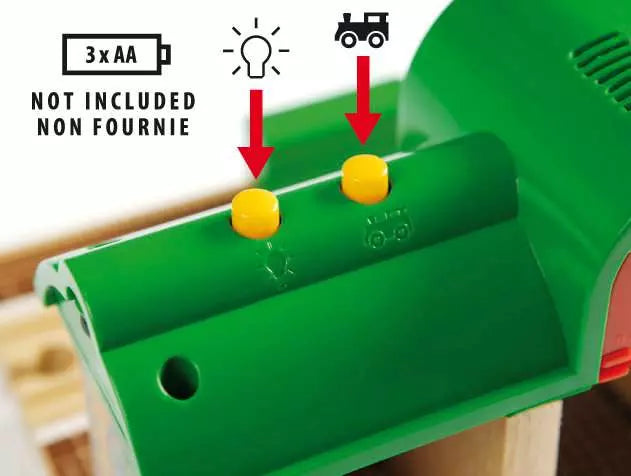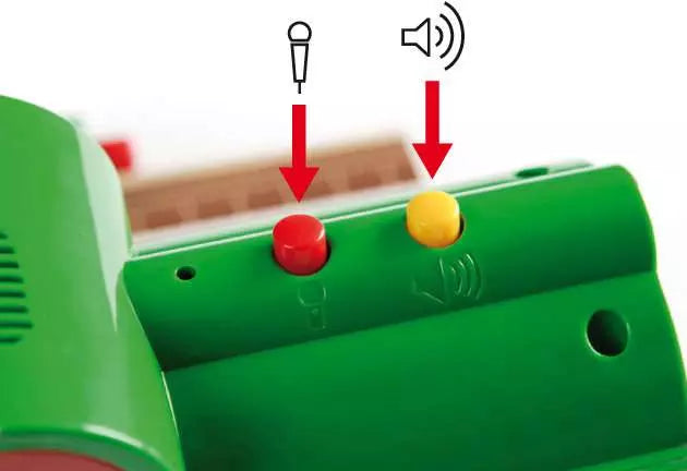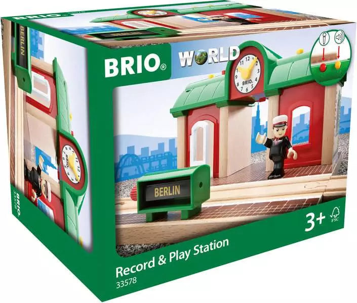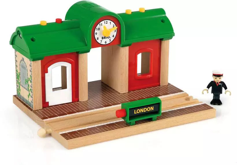 Record your own railway announcements! This interactive station features buttons for recording and playing messages. It also features pre-recorded engine sounds, a station light and rotating destination sign. Includes poseable station figure.