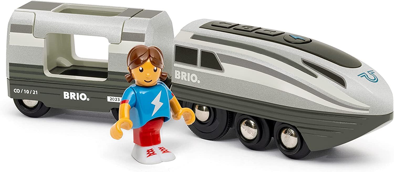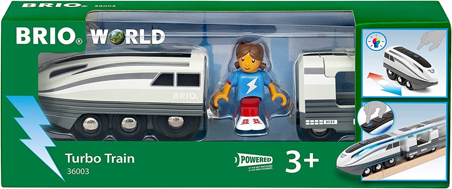 Crank up the speed with the BRIO Turbo Train. Simply press the big turbo button and this battery-operated toy train doubles its speed, making it the fastest train in BRIO World. The turbo boost lasts for 5 seconds and as it runs at top speed, the white lights along the sides of the engine change to a cool blue. This futuristically designed engine also includes a passenger wagon with enough space for one lucky passenger to enjoy an exhilarating ride to remember.