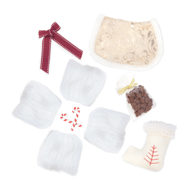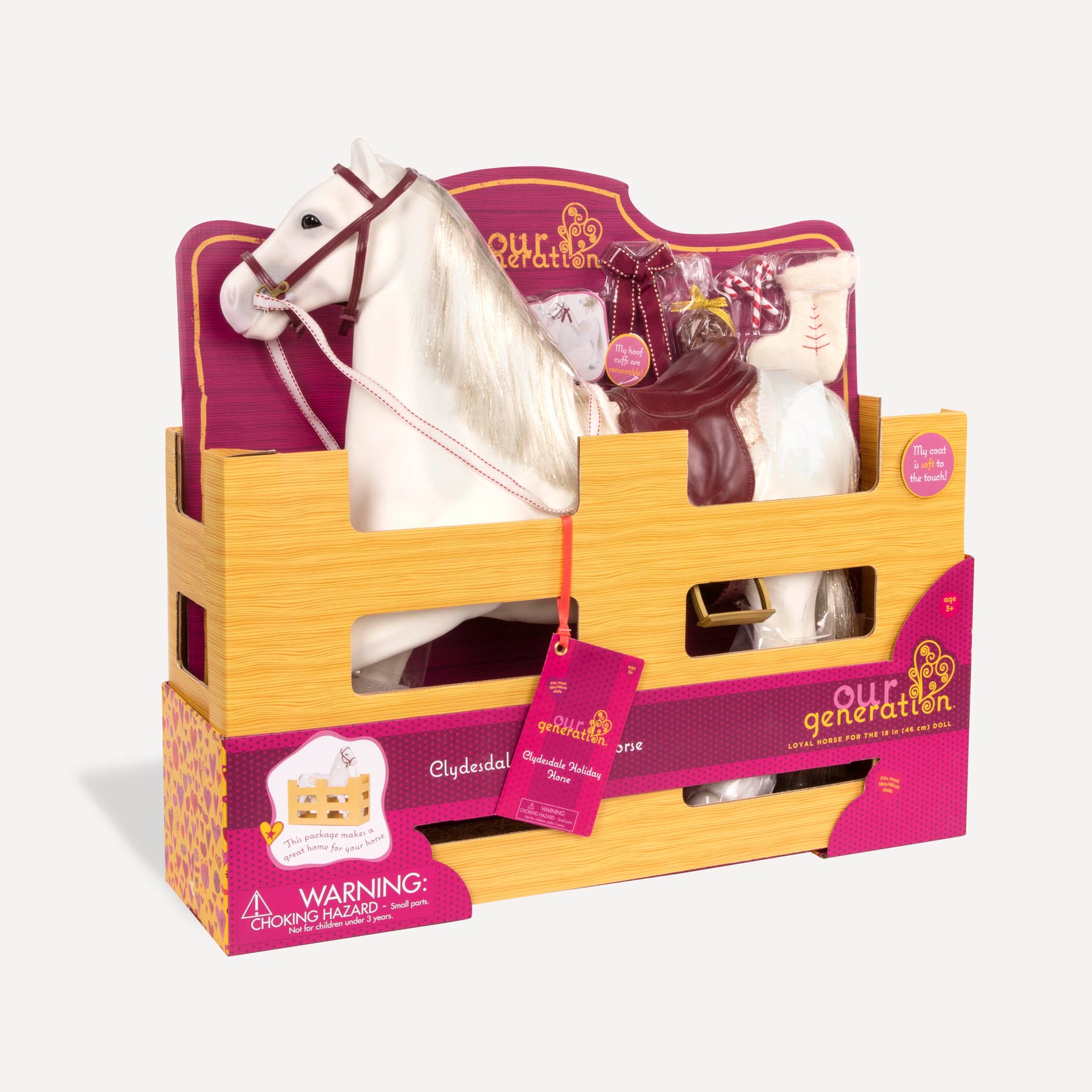 Surprise and delight your 18-inch doll horse fans with the Our Generation Clydesdale horse and create festive celebrations together! This shimmering 20-inch toy horse makes the perfect equestrian friend. Saddle up with the comfy blanket and add the 4 fluffy, faux-fur hoof covers to dash through the snow with your doll riders! The Clydesdale horse features a beautiful white coat with a long, sparkly white mane and tail that's fun to style. It also comes with adorable holiday accessories like a stocking, hair ribbon, 2 candy canes, and a treat bag. Compatible with most 18-inch dolls, horse toys, and accessories. Dolls sold separately.