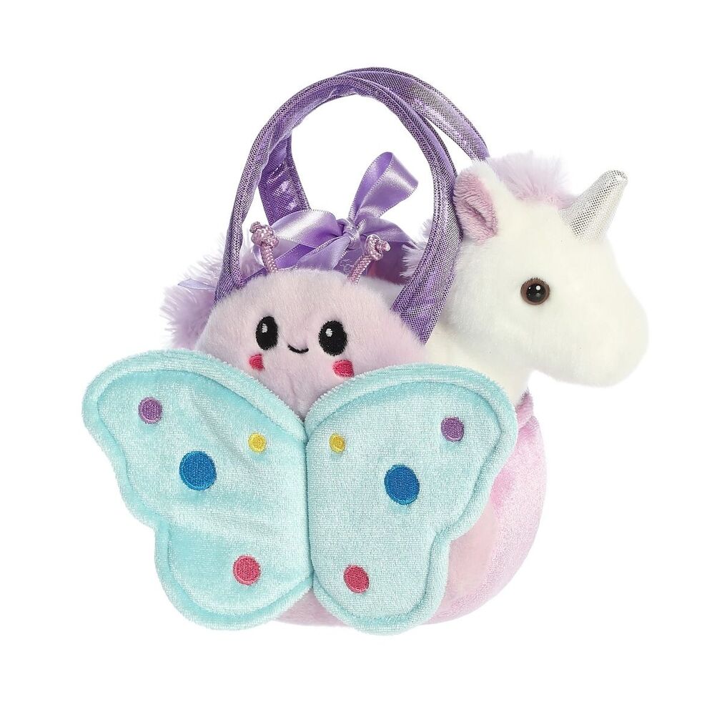 Soft plush toy white Unicorn sitting in a cute soft purple and blue butterfly handbag. Let your pet sit inside and take him everywhere with you, or pull him out and give him cuddles anytime.