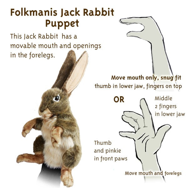 Leap into play with the Folkmanis Jack Rabbit puppet. Movable mouth and forelegs give boundless energy and lend to the lighthearted trickster symbolism of this native American animal.