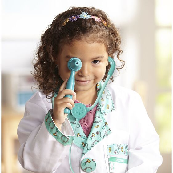 The doctor will see you now. With this set your little doctor will be fully equipped with a jacket and facemask, a stethoscope with sound effects, a reflex hammer, an ear scope, a syringe and a name tag for personalising.