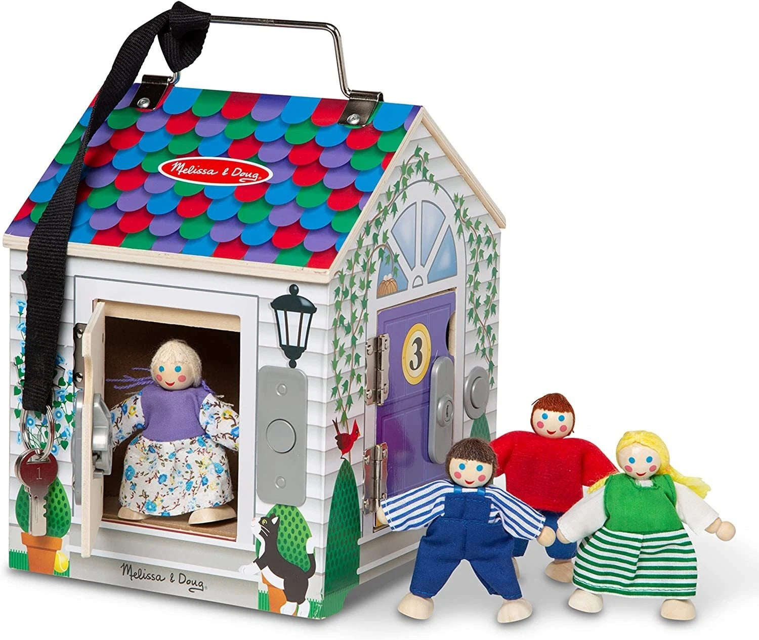 Ding Dong! Fun is at the door of this soundly-built wooden doorbell house. Four electronic doorbell sounds, four unique locks with matching keys, and four pose-able play people are included with this charming cottage! The keys are attached to the house so they won't get lost, and the sturdy handle allows this exciting house party to go wherever children go!