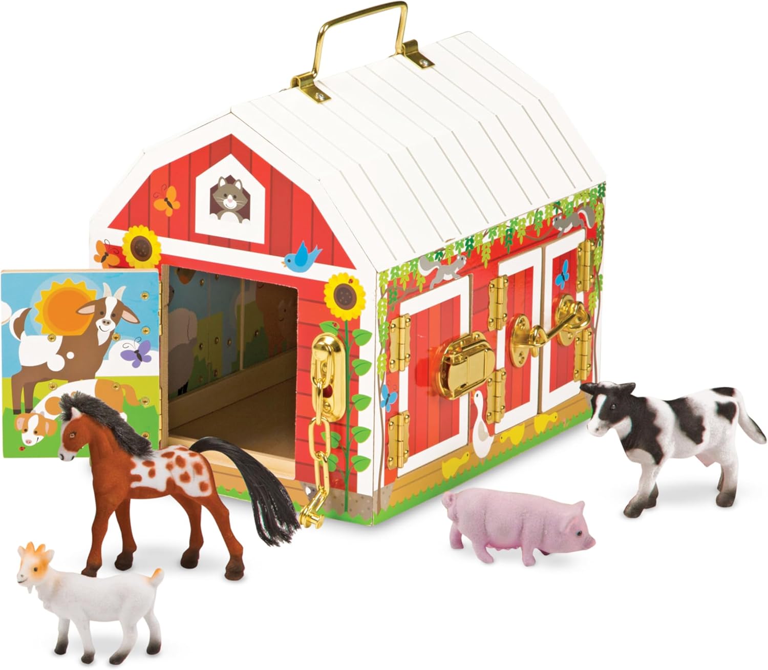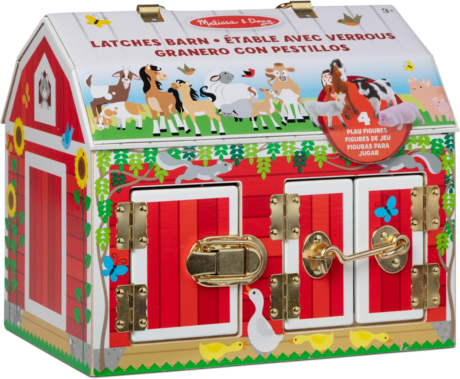 Unhook the latches to open the barn doors and see who is inside, then close the doors and buckle up the barn again! This beautifully crafted sturdy wooden barn is brightly painted both inside and out. It features six brass-hinged doors with working latches and locks, and pictures of farm animals on the inside of each door. There's even a brass handle on top to take the fun wherever kids go!