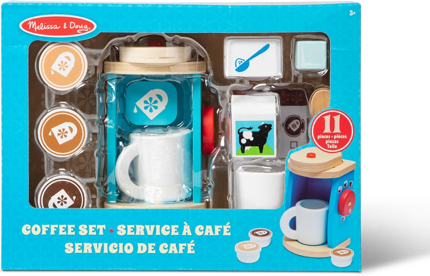 he Melissa & Doug Wooden Brew & Serve Coffee Set provides your child with hours of fun, imaginative roleplaying with their friends and peers, allowing them to foster their social skills and language development. Features a 12-piece set that contains coffee preparation instruments such as 2 wooden mugs, a spoon, and re-usable order card for added excitement and entertainment