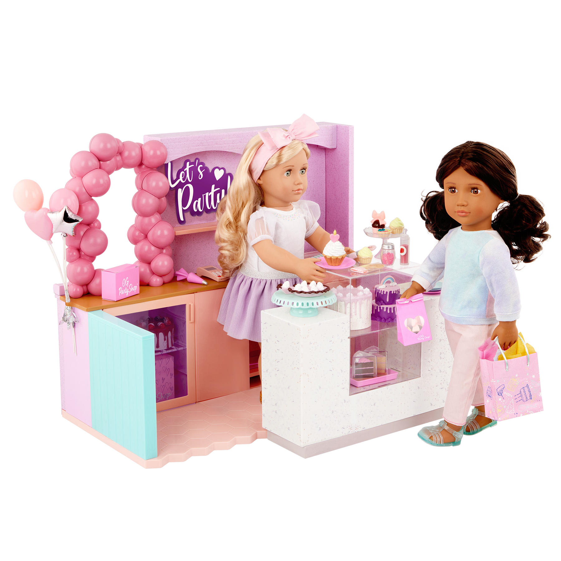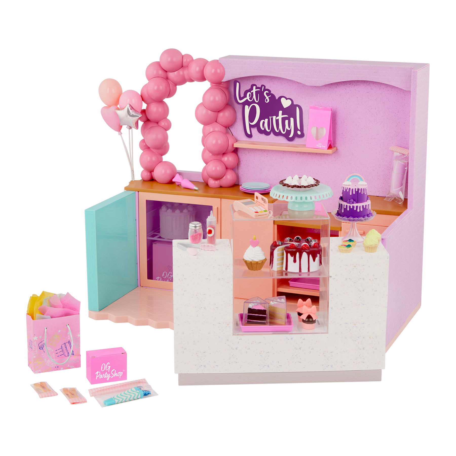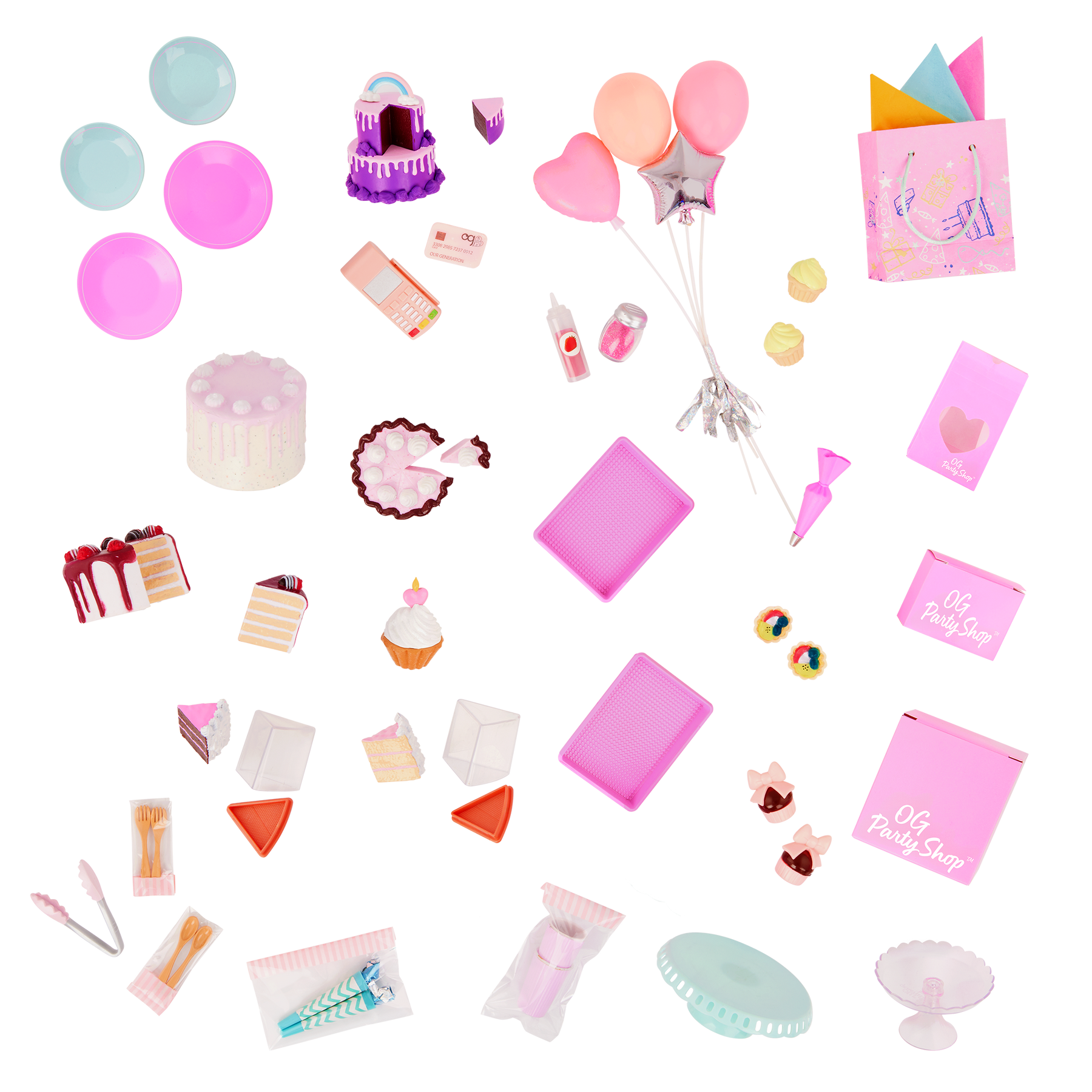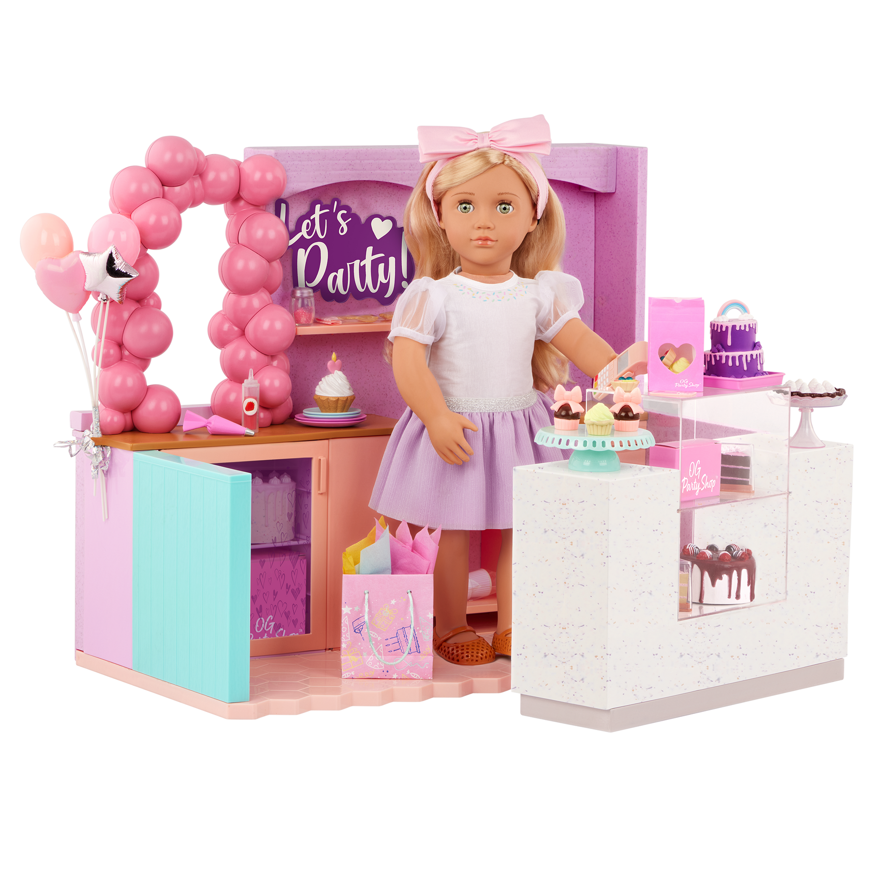 Turn every day into the ultimate surprise celebration with the Our Generation Party Shop playset for 18-inch dolls! Designed in cheerful colors with a striking pink balloon arch, this unique playset has everything kids need to run their own party shop as they prep for birthdays and more fun-filled events. At the heart of this playset is a charming display area with a mini fridge, shelf, and foldout counter to showcase over 15 dessert items. It includes cupcakes, pie, fruit tarts, and a scented cake that really smells like yummy chocolate! Individual slices also mean kids can share each detailed treat with party guests, while the birthday cupcake makes every doll's big day extra special. Plus, pretend decorating and serving is even more engaging with a piping bag, sprinkle shaker, bottle of strawberry syrup, and carryout boxes to bring the fun on the go. Ready to complete your order? A themed gift bag and partyware items like spoons, forks, cups, and plates are neatly packaged to put the finishing touches on every party scene. And it comes with a payment terminal and credit card that add a realistic twist to storytelling. The Our Generation Party Shop playset makes a wonderful gift for kids ages 3+ (small parts), encouraging them to imagine their own unique stories. Compatible with most 18-inch dolls and accessories. Our Generation dolls sold separately.