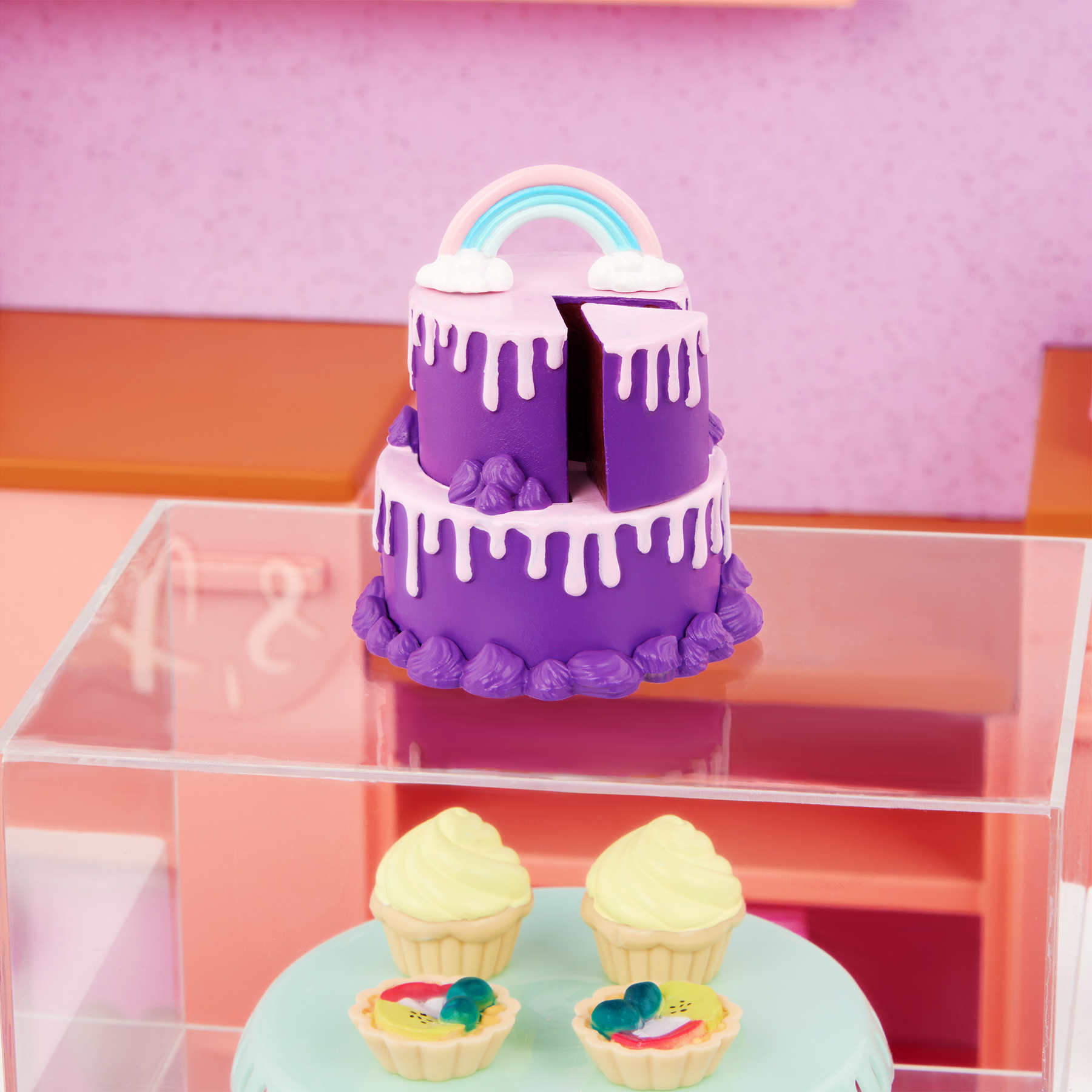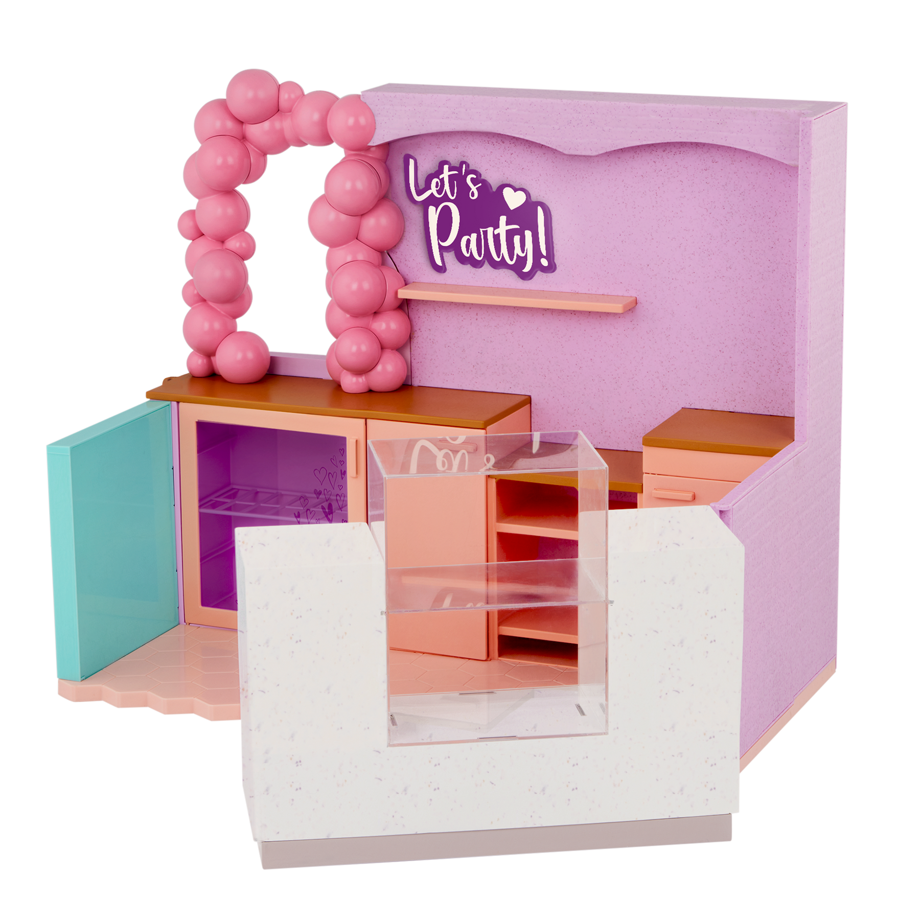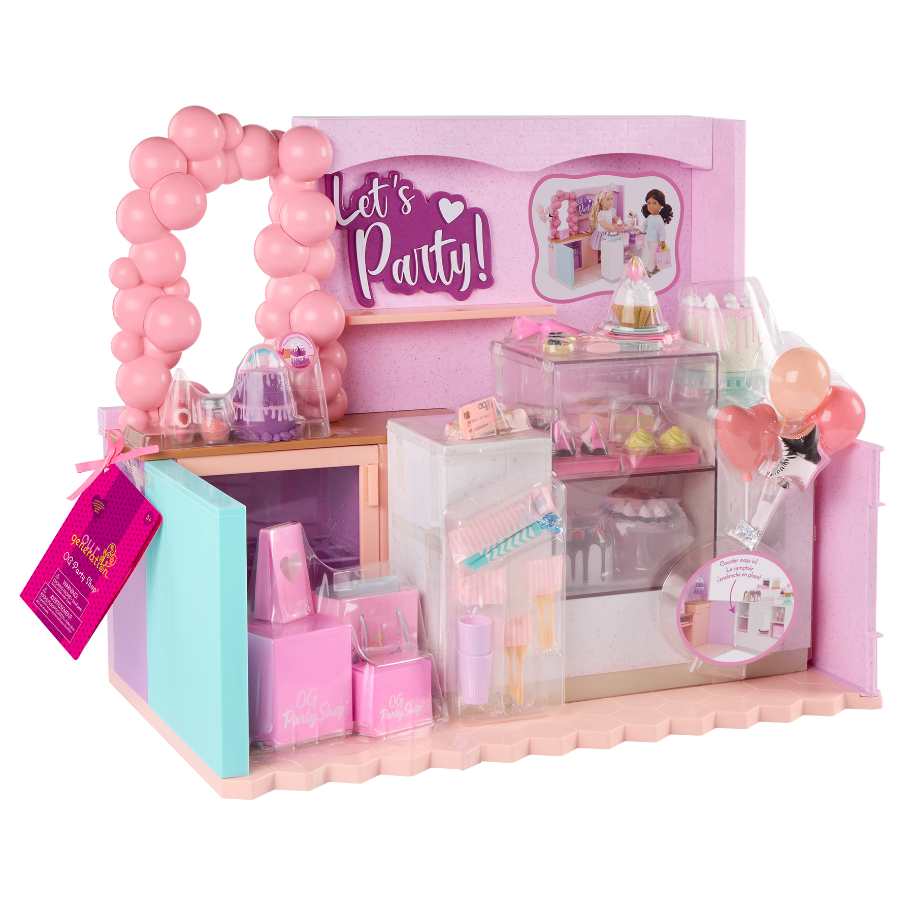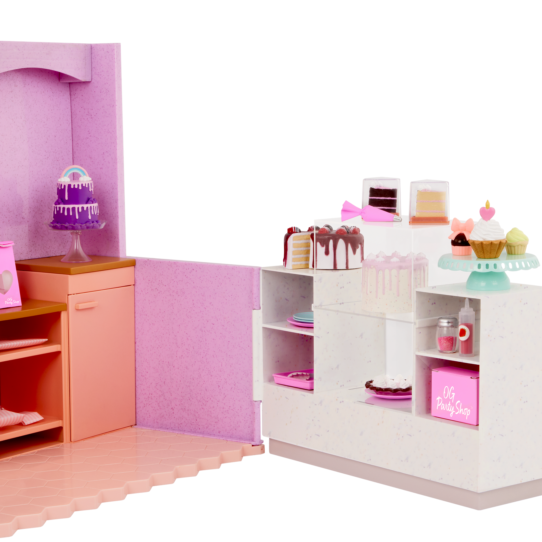 Turn every day into the ultimate surprise celebration with the Our Generation Party Shop playset for 18-inch dolls! Designed in cheerful colors with a striking pink balloon arch, this unique playset has everything kids need to run their own party shop as they prep for birthdays and more fun-filled events. At the heart of this playset is a charming display area with a mini fridge, shelf, and foldout counter to showcase over 15 dessert items. It includes cupcakes, pie, fruit tarts, and a scented cake that really smells like yummy chocolate! Individual slices also mean kids can share each detailed treat with party guests, while the birthday cupcake makes every doll's big day extra special. Plus, pretend decorating and serving is even more engaging with a piping bag, sprinkle shaker, bottle of strawberry syrup, and carryout boxes to bring the fun on the go. Ready to complete your order? A themed gift bag and partyware items like spoons, forks, cups, and plates are neatly packaged to put the finishing touches on every party scene. And it comes with a payment terminal and credit card that add a realistic twist to storytelling. The Our Generation Party Shop playset makes a wonderful gift for kids ages 3+ (small parts), encouraging them to imagine their own unique stories. Compatible with most 18-inch dolls and accessories. Our Generation dolls sold separately.