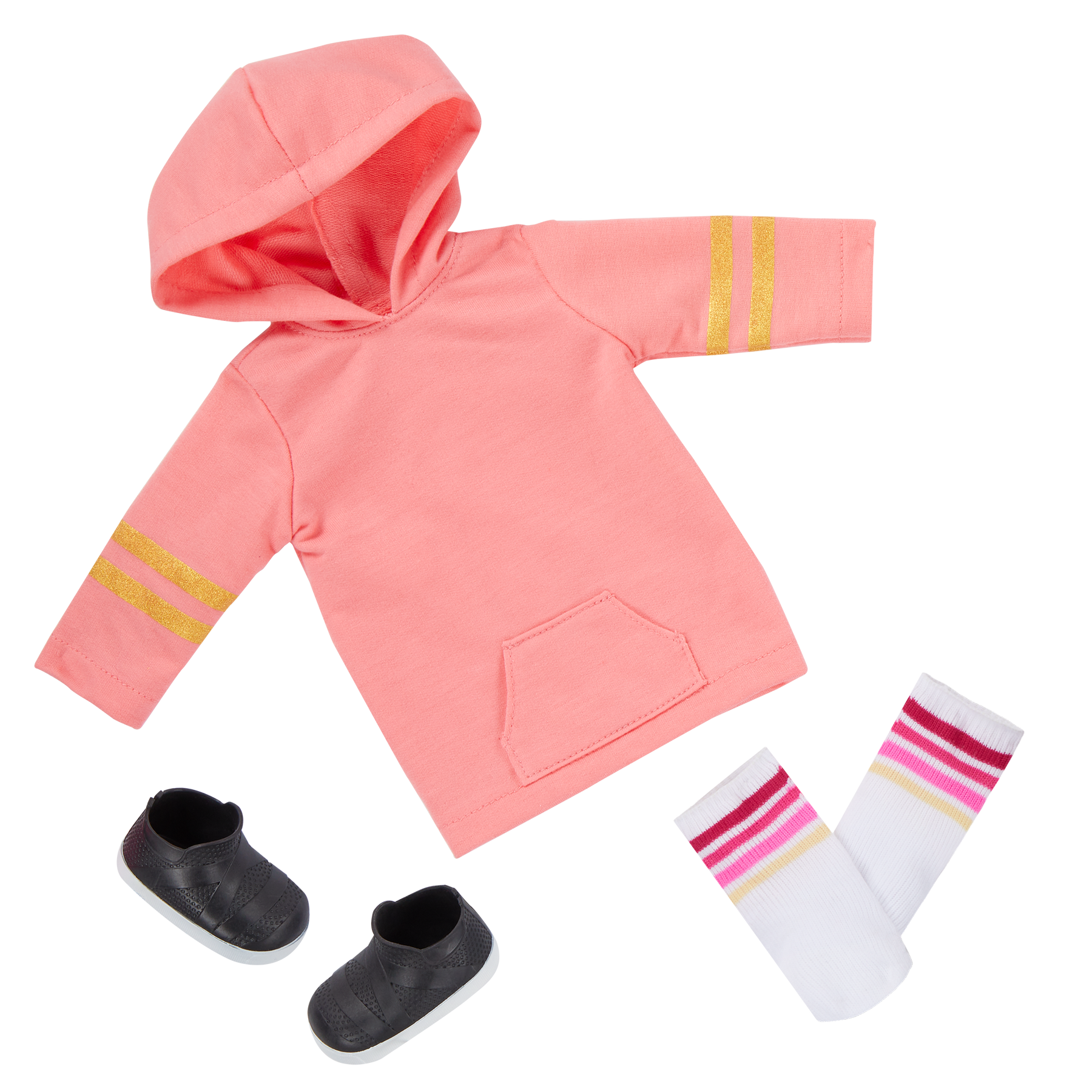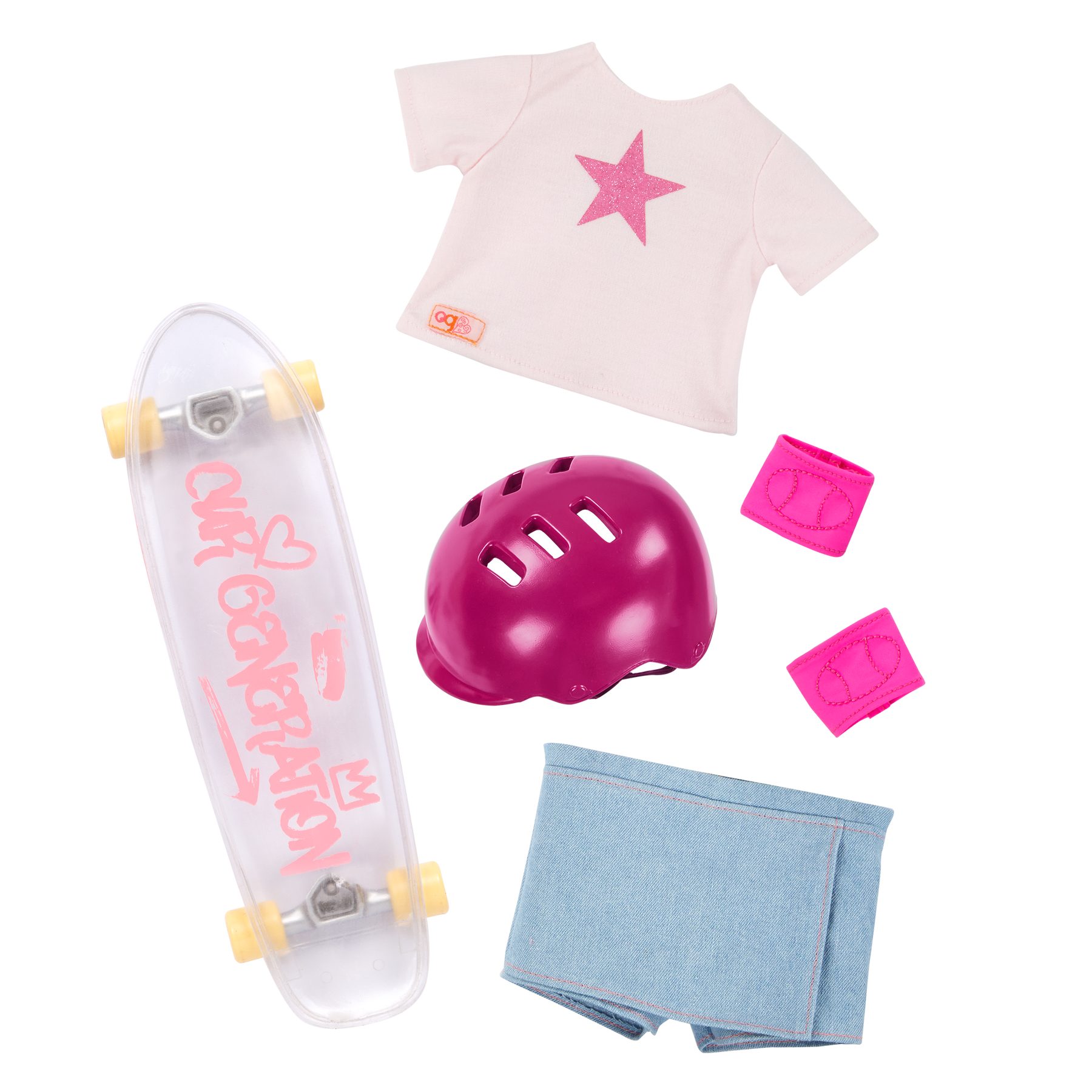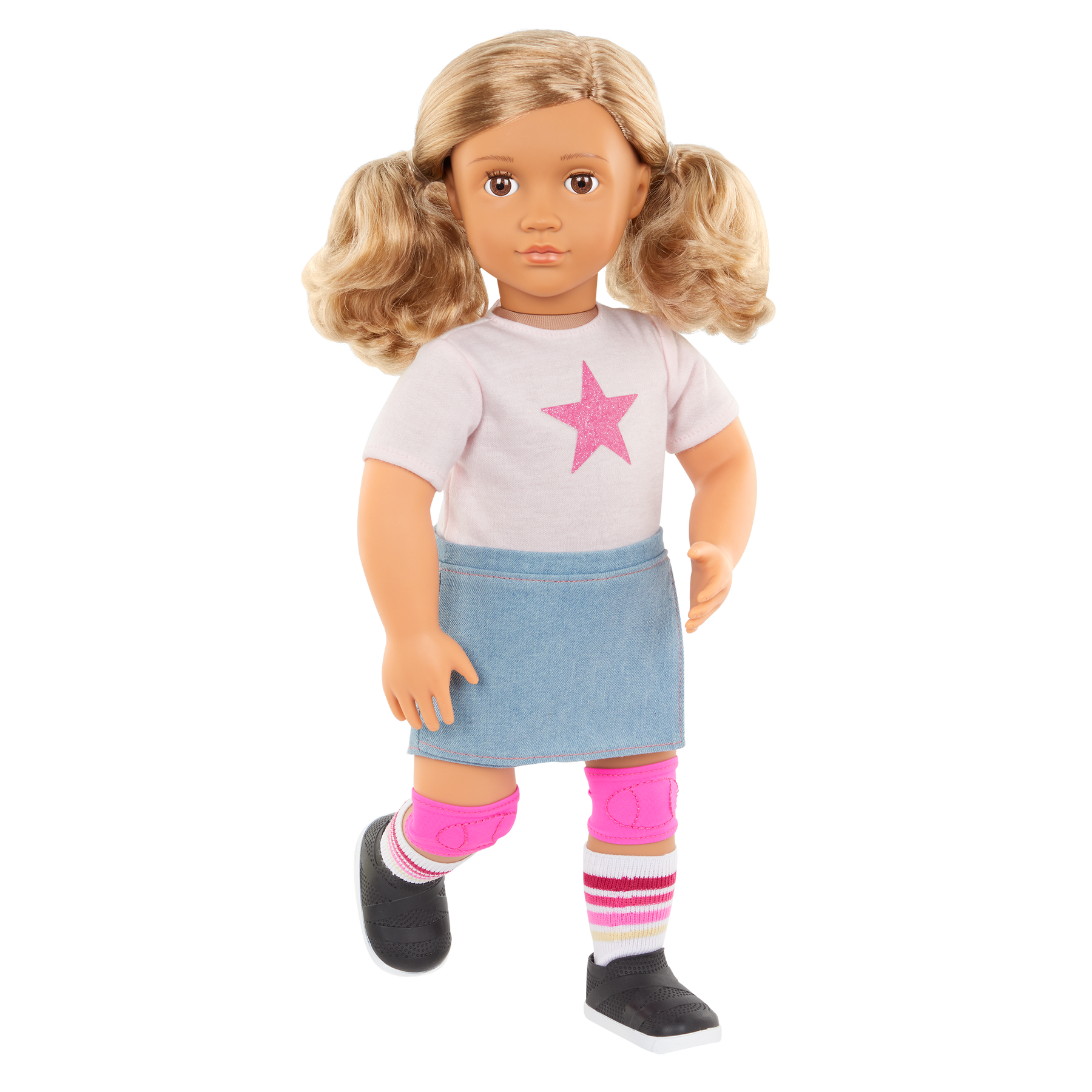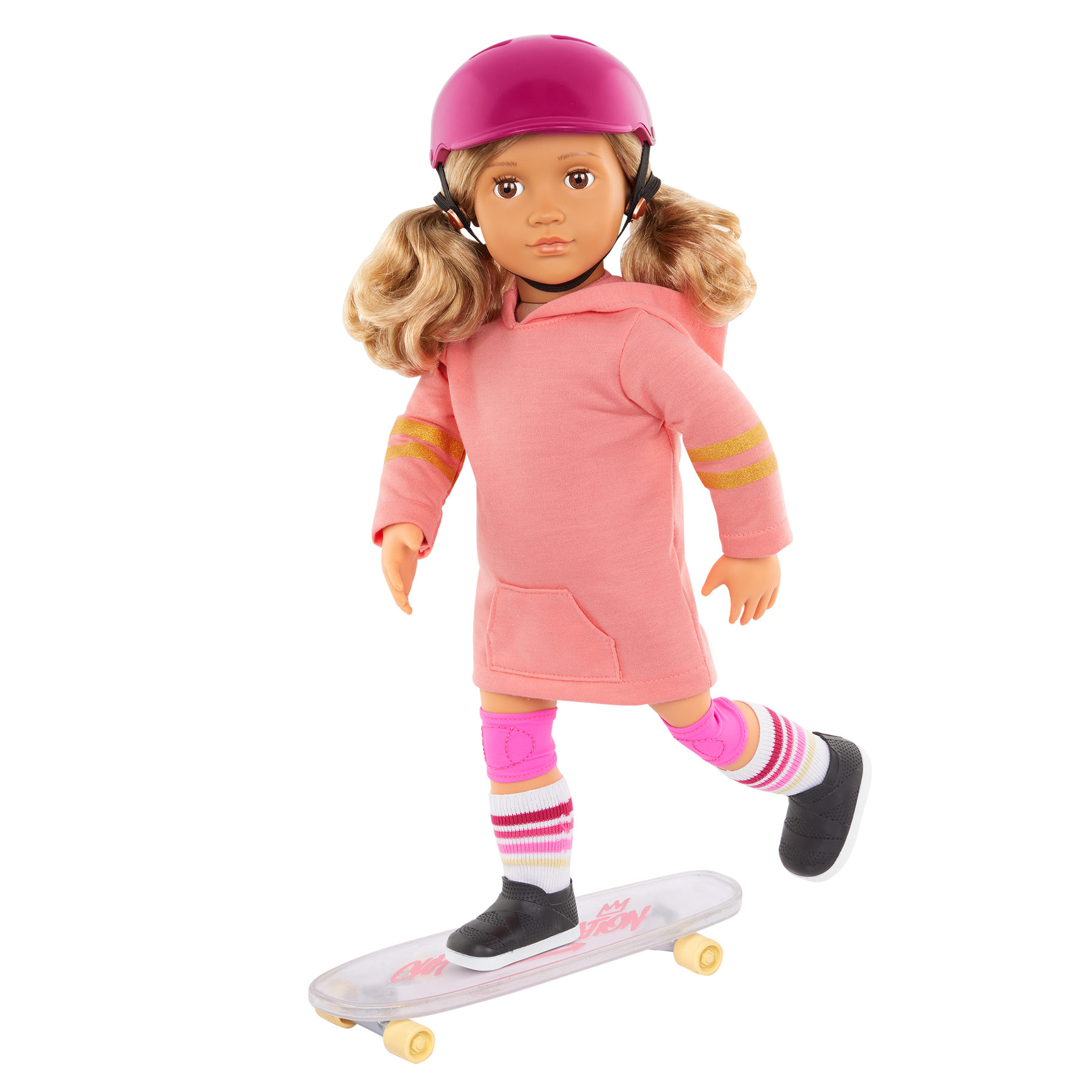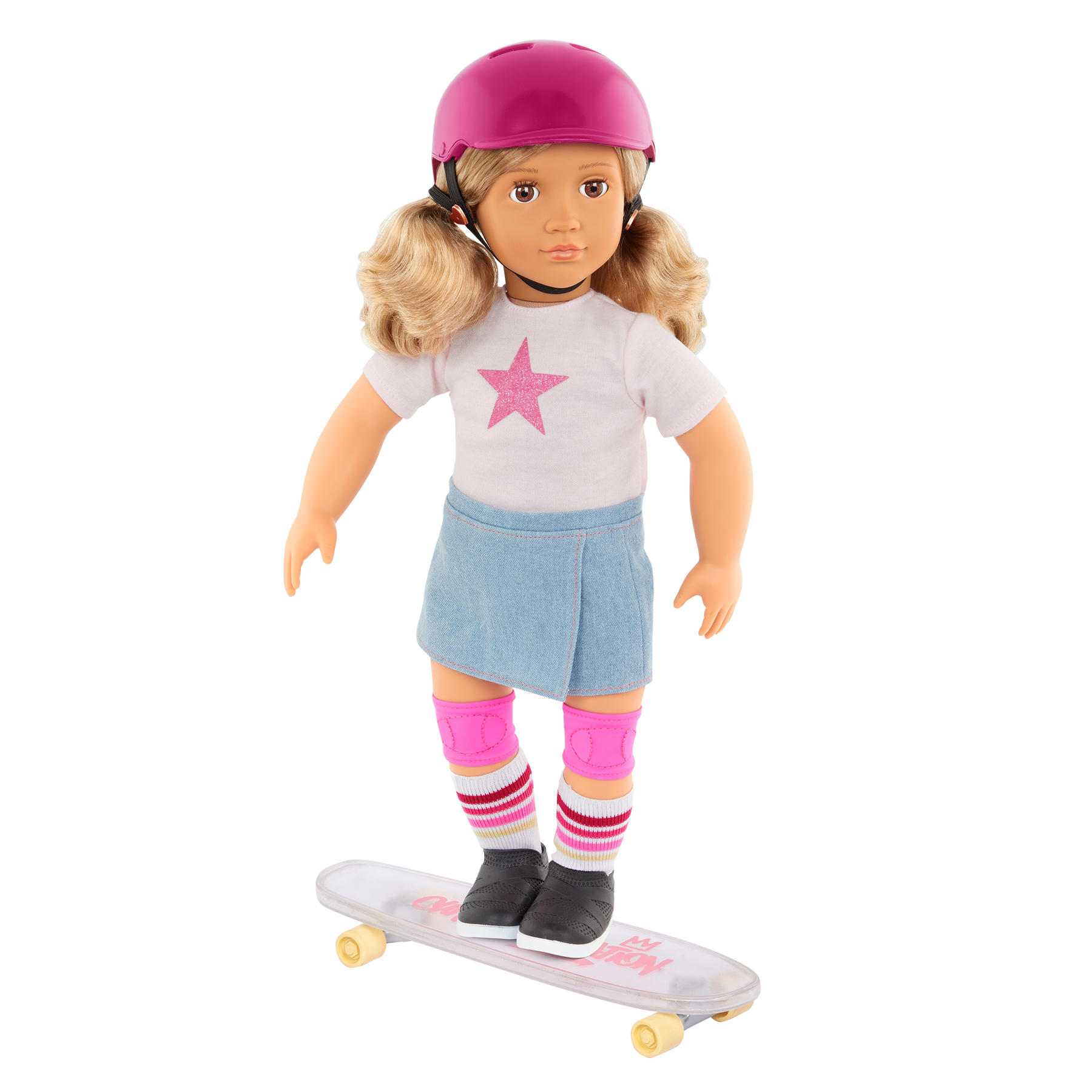 Take skateboarding adventures to ultimate heights with Ollie! This Our Generation 18-inch doll has beautiful brown eyes that open and close, long, brushable blonde hair, and is posable! She can bend her arms and legs to perform the coolest tricks - kickflips and tailslides are her specialties! Her favourite skateboard features a graffiti-style Our Generation print and really rolls, so Ollie can compete on the biggest ramps at the skatepark! She arrives wearing a cute T-shirt with a sparkly star print, a denim-style skort, socks, a pair of running shoes, and a hooded sweater to skateboard on chilly days. She also has a helmet and knee pad accessories to keep her safe!