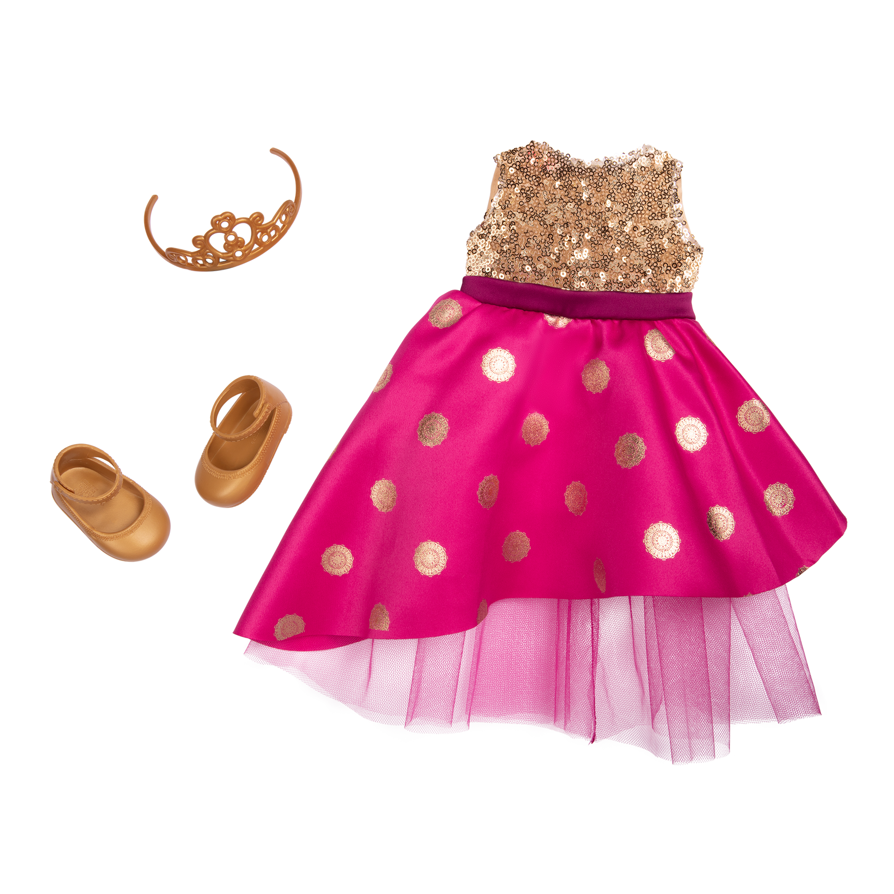 Go on a magical journey with the Our Generation 18-inch doll Sarah! She has warm brown eyes that open and close, and her long blonde hair is lots of fun to brush and style! She has a soft body with plastic arms and legs that rotate, and her outfit features a gold and fuchsia gown with a tulle underlay – she’s even wearing a crown for extra enchanted style! Sarah’s outfit also has easy-open closures that make it fun to mix and match with other colorful Our Generation selections, so she can look and feel her best everywhere she goes! (Additional outfits sold separately)