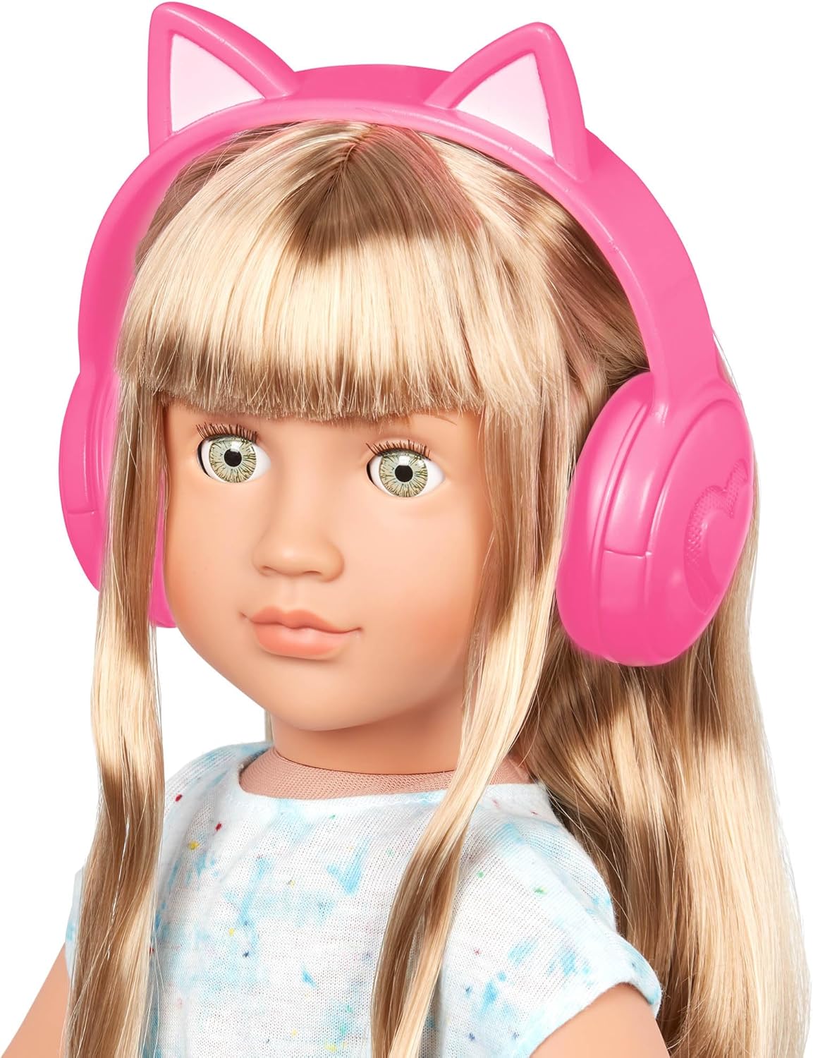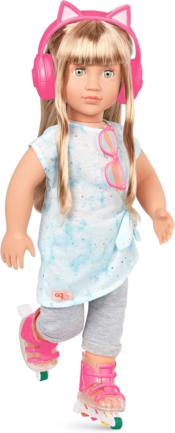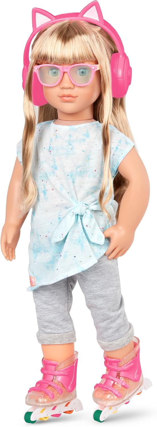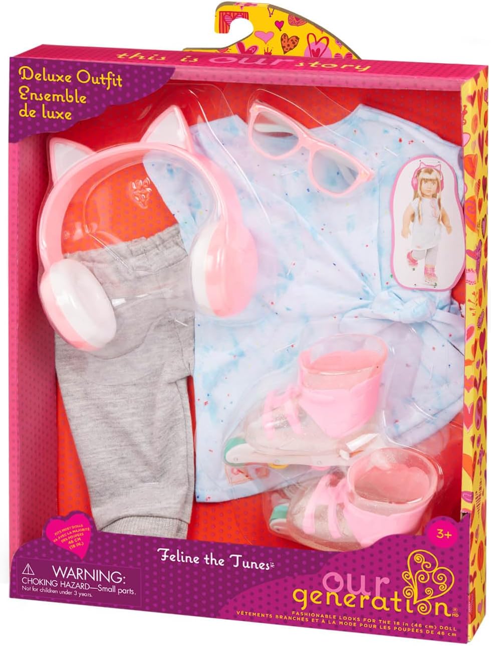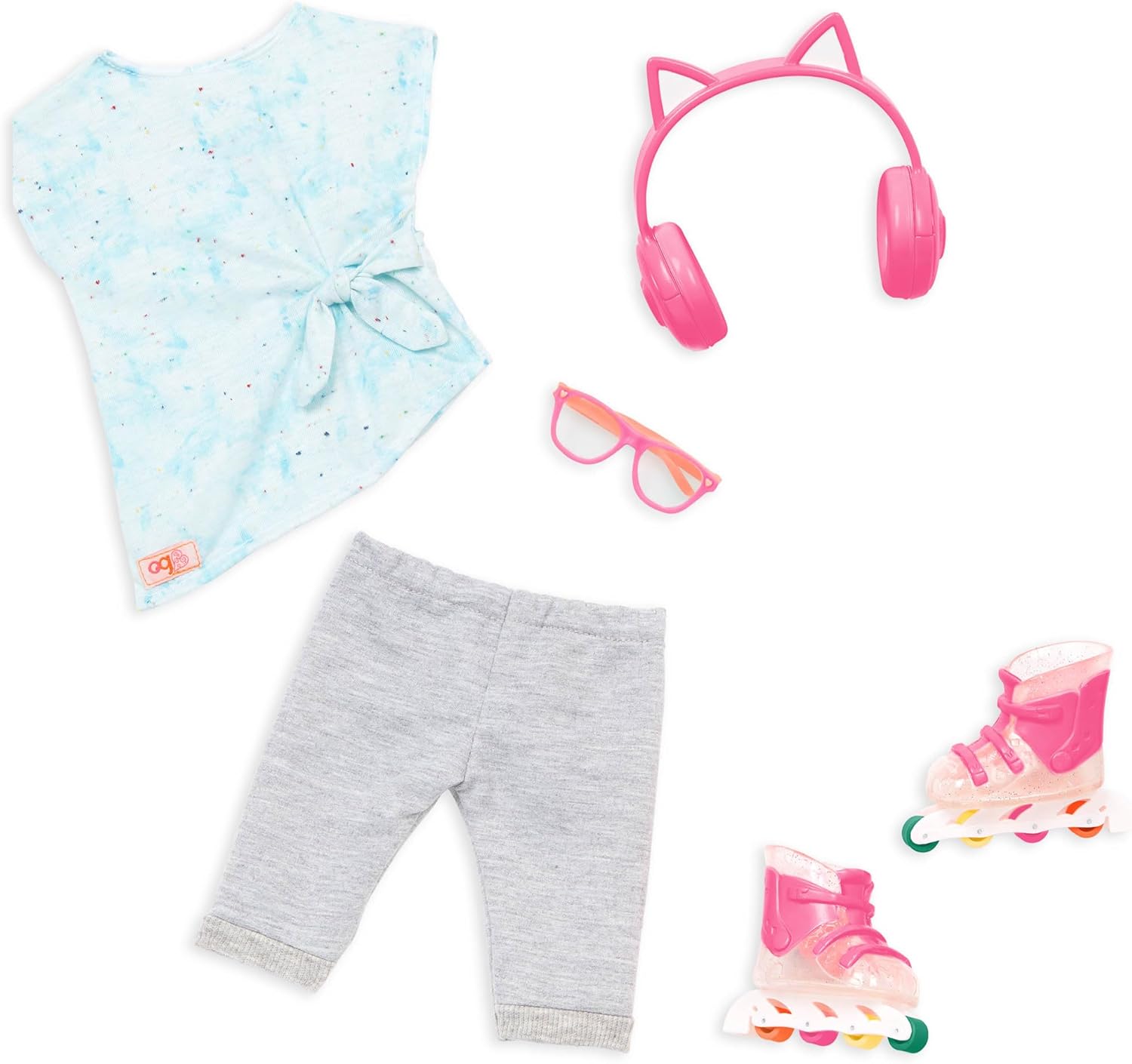 Glide with glee and explore fun fashion with the Our Generation Feline the Tunes outfit for 18-inch dolls! Your doll besties will have a blast rolling around in the super cool rainbow rollerblades. And they’ll look purrfectly stylish in the sporty ensemble along the way! Dress them in the athletic joggers and casual top that features an angle waist and decorative bowknot on the left side. Then add the sunglasses and cute cat-ear headphones so they can rock (and roll!) to their favorite tunes!