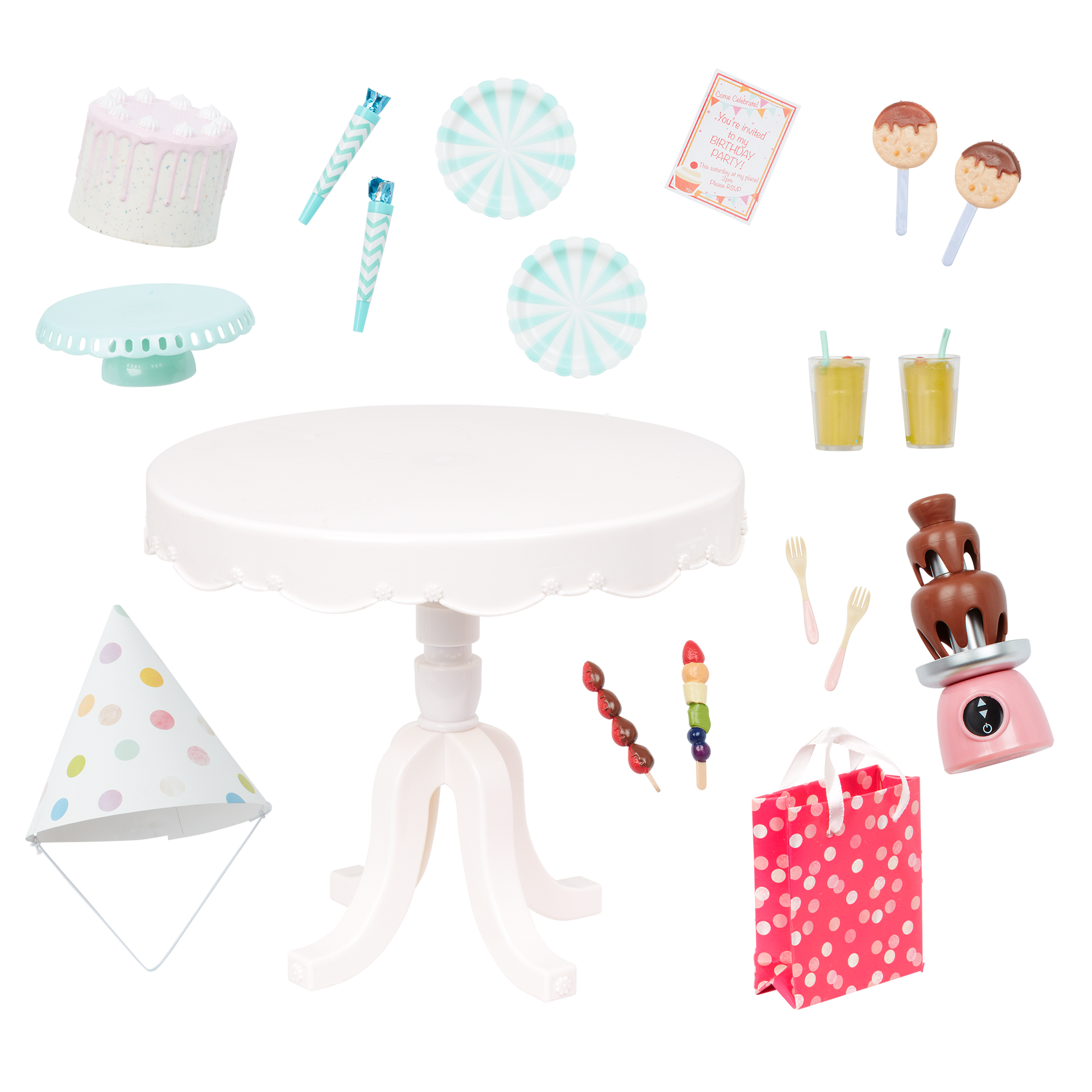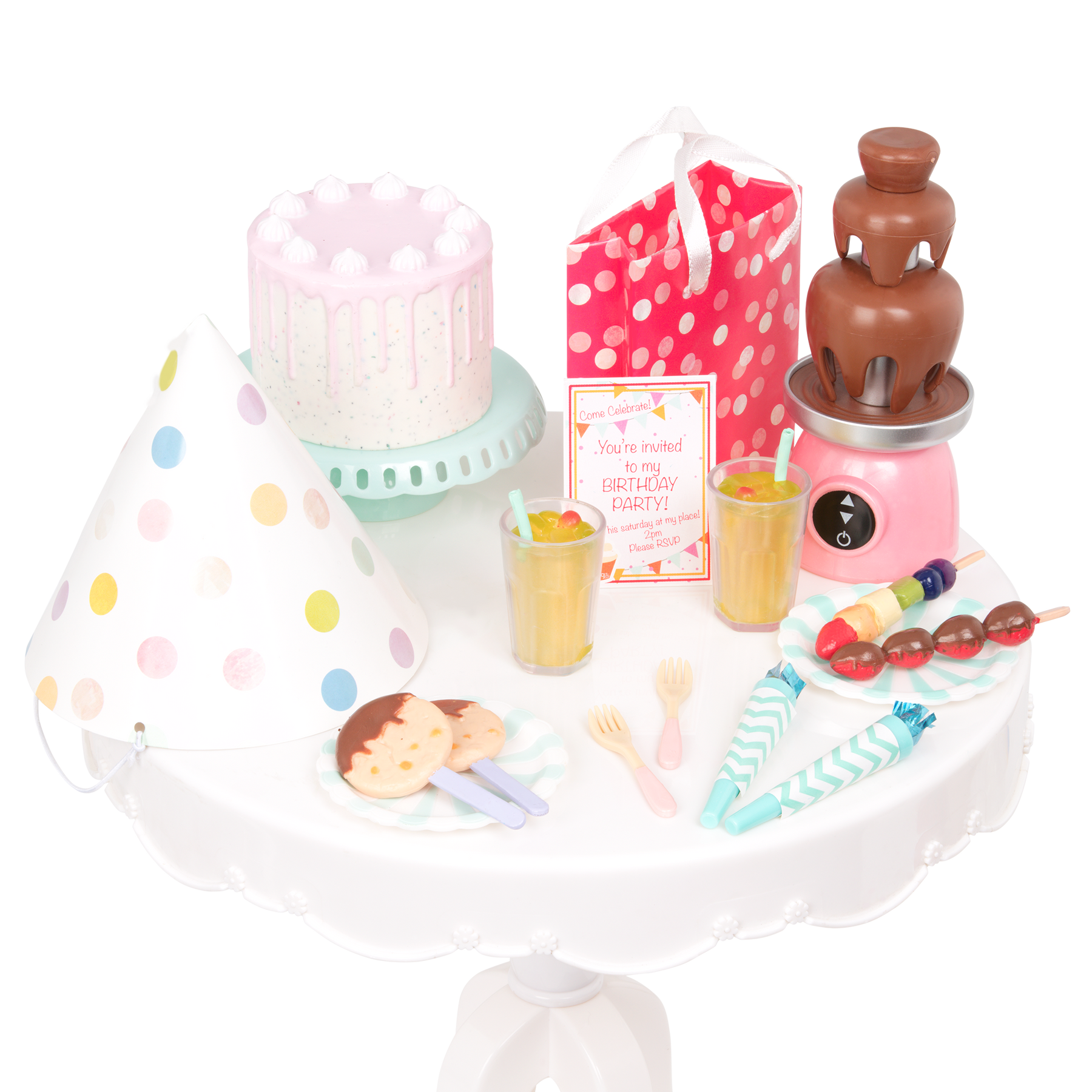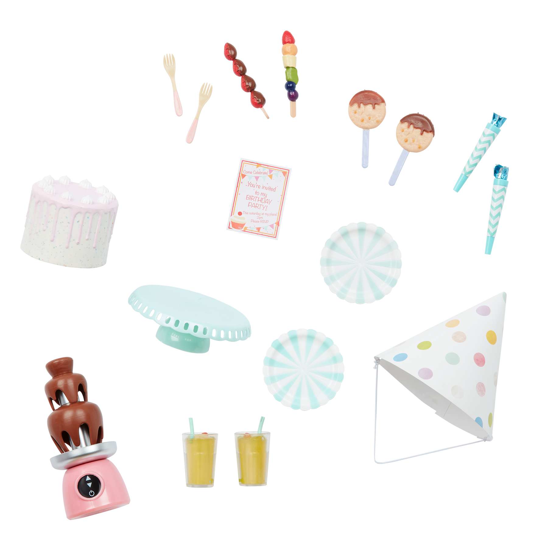 Host birthdays and fun celebrations with the Our Generation Party Time set for 18-inch dolls! Filled with goodies and tasty treats, it will have every guest ready to shout surprise! Prep for the big birthday bash by setting the table with the plates, forks, glasses, and yummy cookies. Then bring out the chocolate fountain to enjoy fondue fun with the fruit skewers - it's the perfect accessory for any sweets table! Is it time to sing Happy Birthday? Put on the birthday hat and cheer with the party horns as you serve the cake. And hand out the gift bag when it's time to open presents! This accessory set also includes an invitation card, so you can invite all your best friends to join in the festivities! (Dolls sold separately)