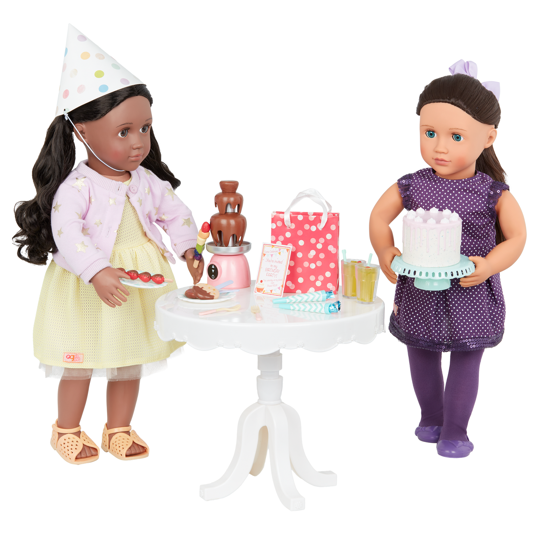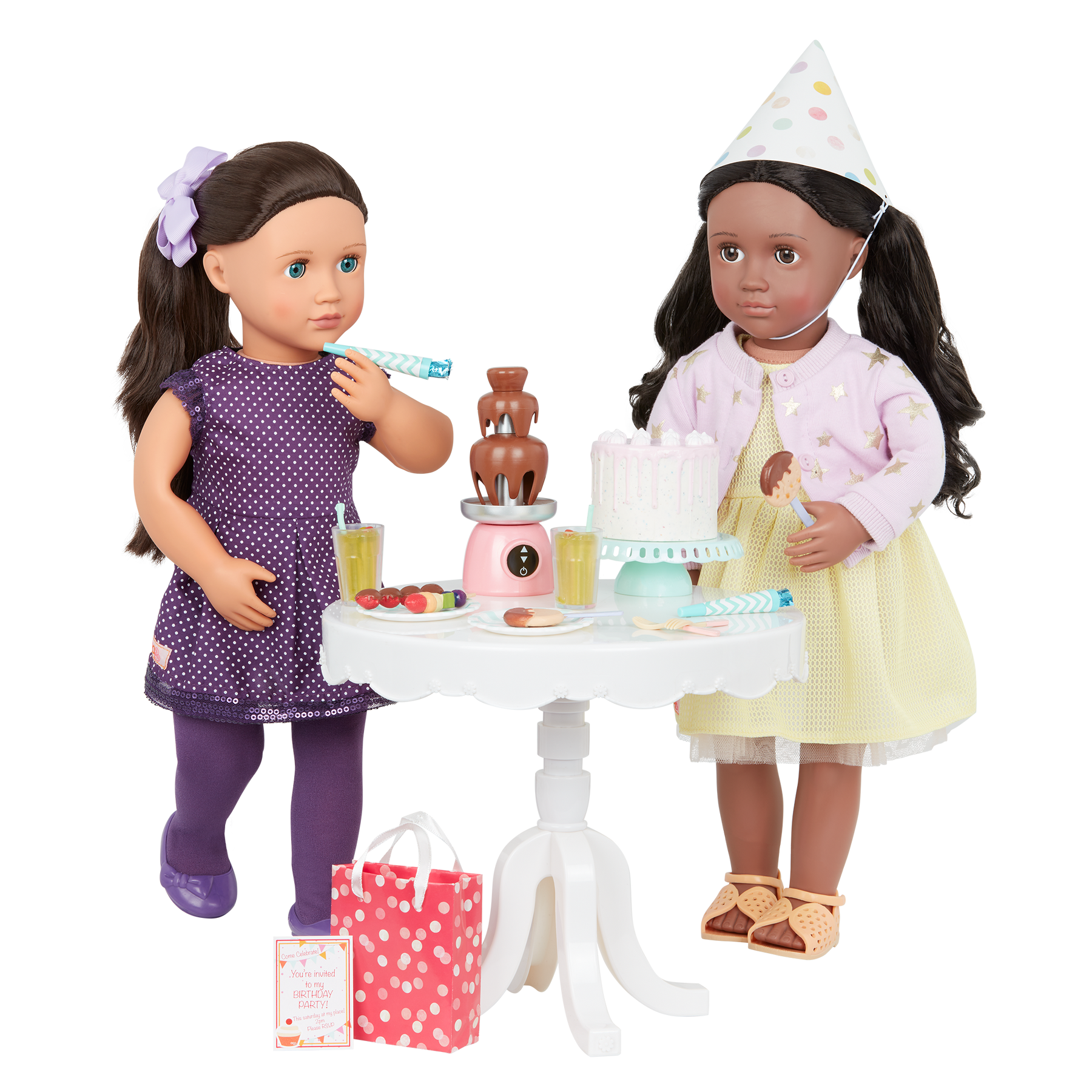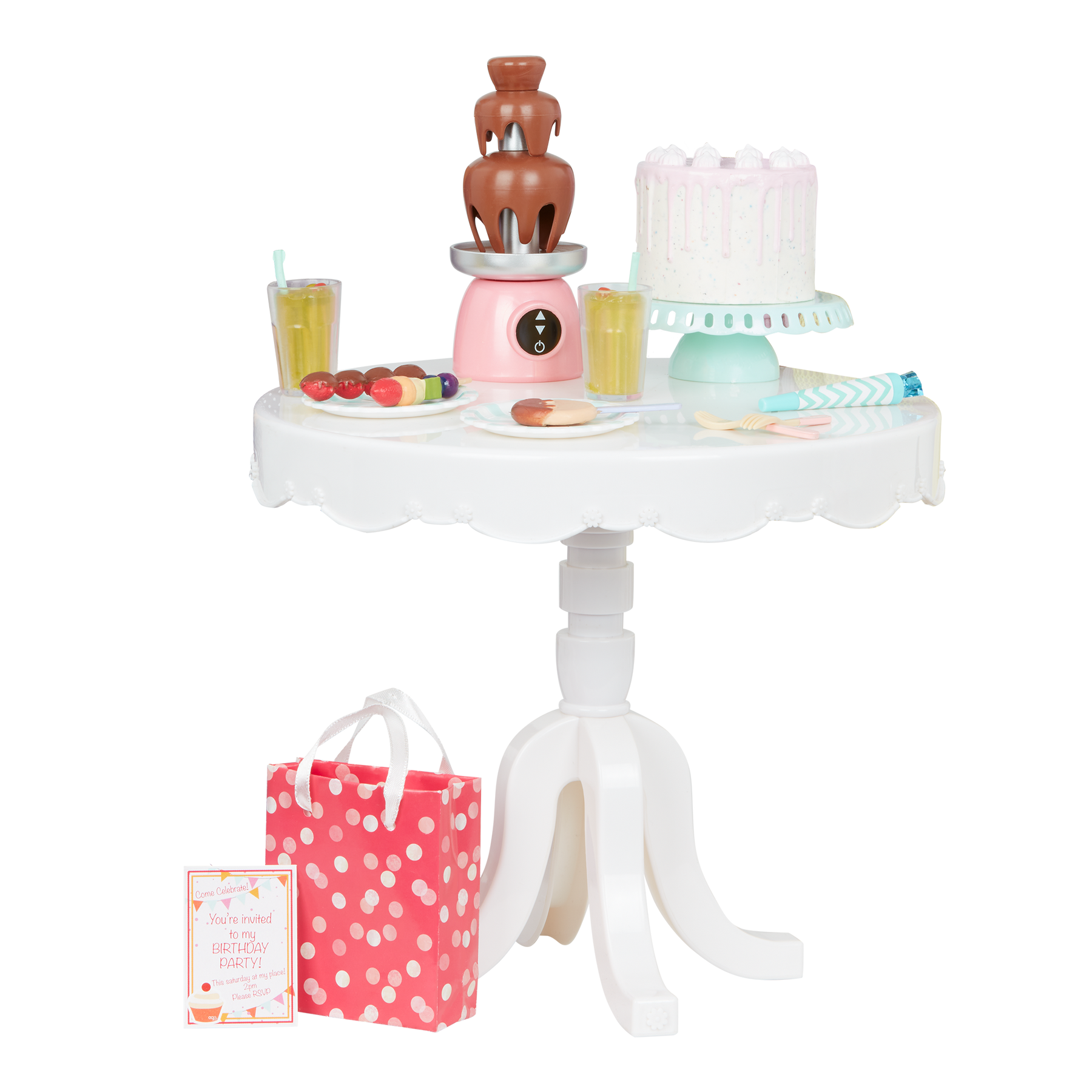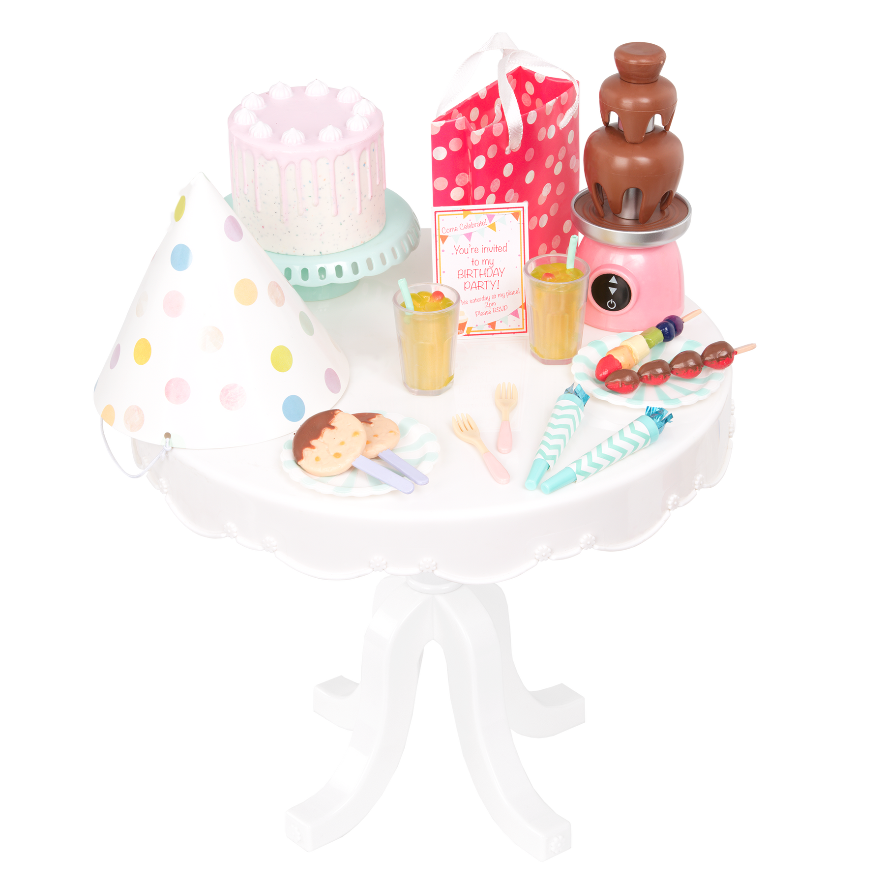 Host birthdays and fun celebrations with the Our Generation Party Time set for 18-inch dolls! Filled with goodies and tasty treats, it will have every guest ready to shout surprise! Prep for the big birthday bash by setting the table with the plates, forks, glasses, and yummy cookies. Then bring out the chocolate fountain to enjoy fondue fun with the fruit skewers - it's the perfect accessory for any sweets table! Is it time to sing Happy Birthday? Put on the birthday hat and cheer with the party horns as you serve the cake. And hand out the gift bag when it's time to open presents! This accessory set also includes an invitation card, so you can invite all your best friends to join in the festivities! (Dolls sold separately)