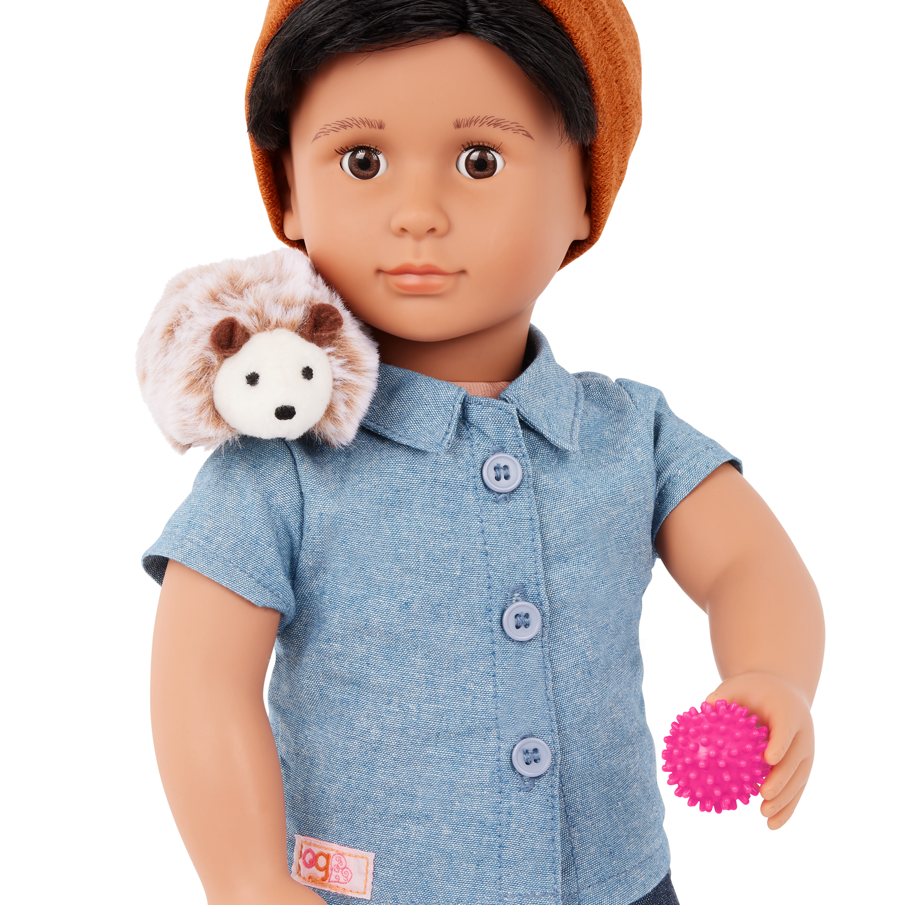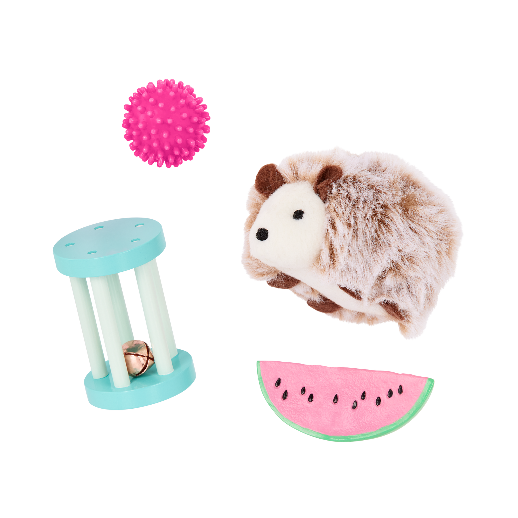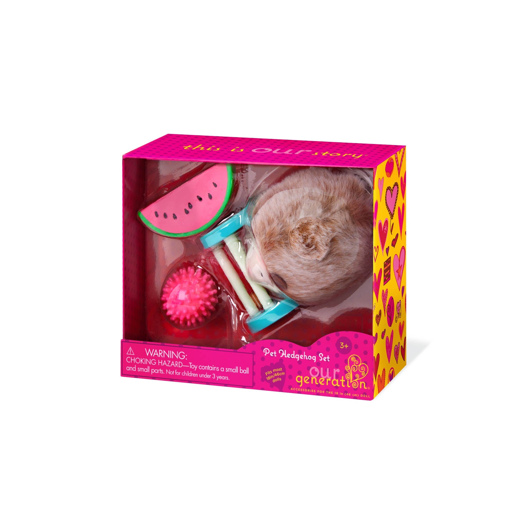 Welcome a cute little critter into their pet collection! This Our Generation pet hedgehog set is perfect for 18-inch dolls and kids who love animals. More snuggly than spiky, the mini hedgehog has ultra-soft plush fur, tiny paws and ears, and measures about 2" (H) x 2.5" (W) for dolls to hold in their hands! Added accessories include a bell roller, toy ball, and watermelon slice to explore story-filled fun. And its adorable design is sure to delight animal lovers on every adventure. Compatible with most 18-inch dolls and stuffed animal toys. Our Generation pets make a great gift for kids ages 3+ (small parts), encouraging them to create their own unique stories. Miniature packaging is perfect for Easter baskets, stocking stuffers, party favors, and more. Dolls sold separately.