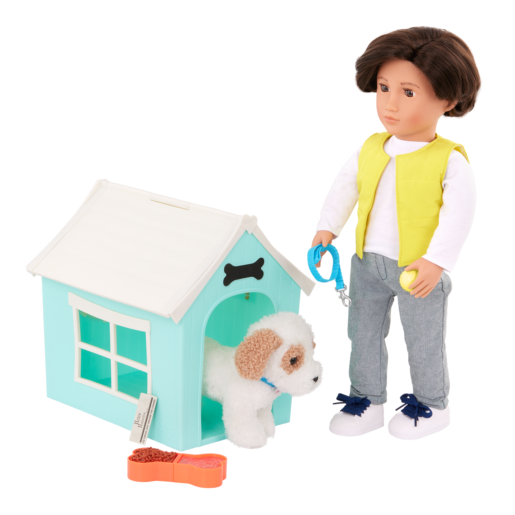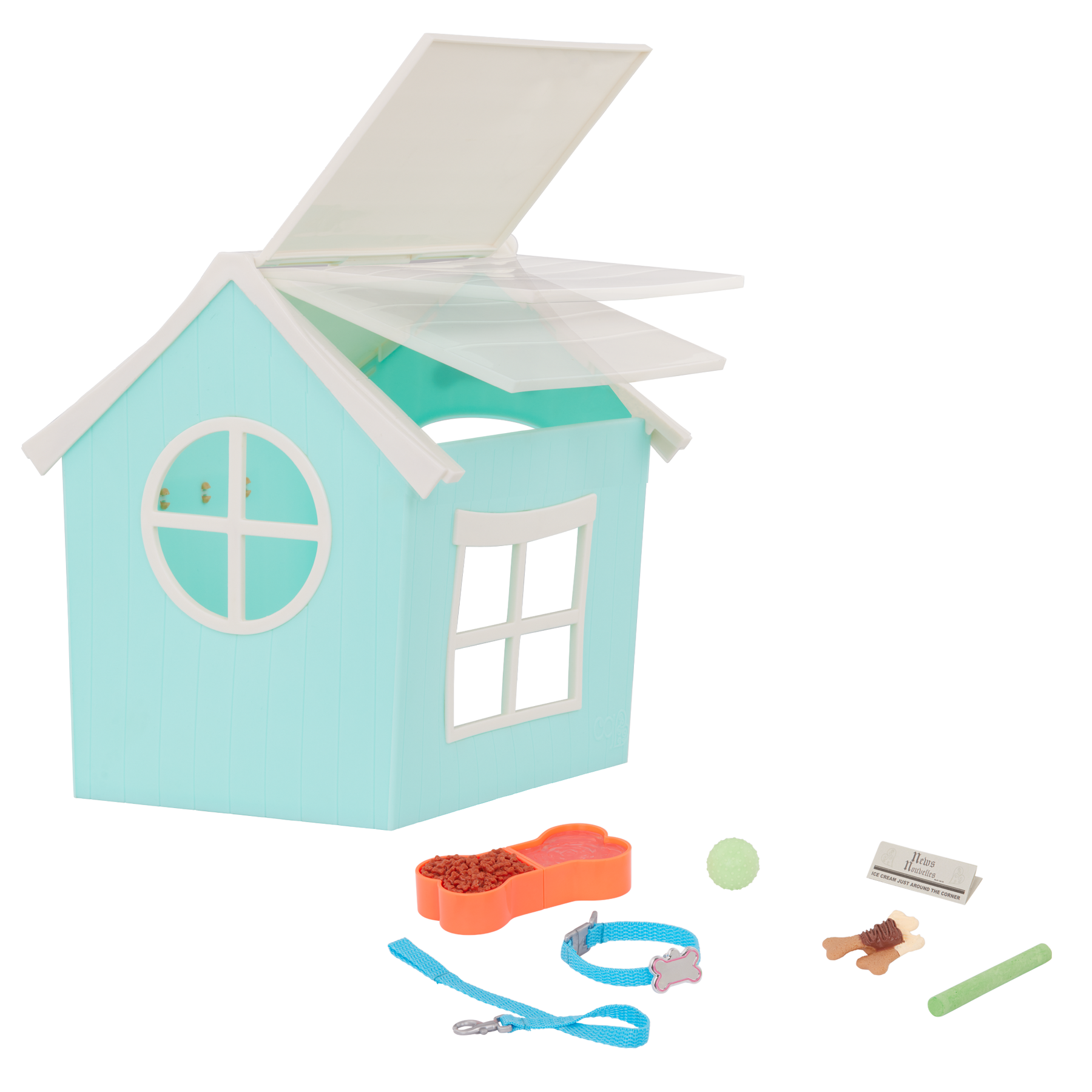 Give animal fans an awesome playhouse to care for their pets with the Our Generation Puppy Place accessory, including a 6-inch pup to welcome into their collection! This bright blue dog house has cool details like an opening roof, multiple lookout windows, storage hooks, and a real chalkboard sign for kids to write their puppy's name! Plus, it comes with bonus play pieces like a dog collar, an attachable leash, food and water bowls, a newspaper, a dog treat, a toy ball, and chalk. Our Generation doll accessories make a wonderful gift for kids ages 3+ (small parts), encouraging them to imagine their own unique stories. Compatible with most 18-inch dolls, 6-inch stuffed animal toys, and makes a fun addition to dollhouse playsets. Dolls sold separately.