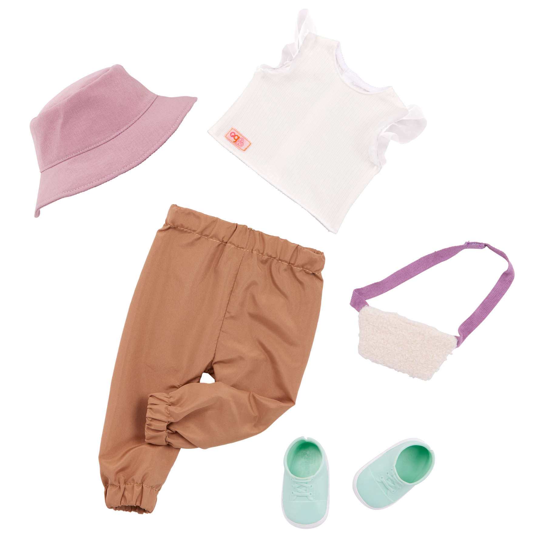 Explore cute styles and fun fashion with the Our Generation Ready to Roam outfit! This 18-inch doll clothing set includes a top, casual pants, and running shoes for a complete outdoorsy look. Plus, it also comes with stylish accessories for dolls to add to their collection, like a cute bucket hat and a faux-fur crossbody bag! When it's time for dress-up, this 18-inch doll outfit has easy-open closures to quickly put on and remove. So kids can mix, match, and create more stylish looks as they explore imagination and self-expression. Our Generation 18-inch doll clothes make a great gift for kids ages 3+ (small parts), encouraging them to create their own unique stories. Compatible with most 18-inch dolls, doll clothes, and accessories. Dolls sold separately.