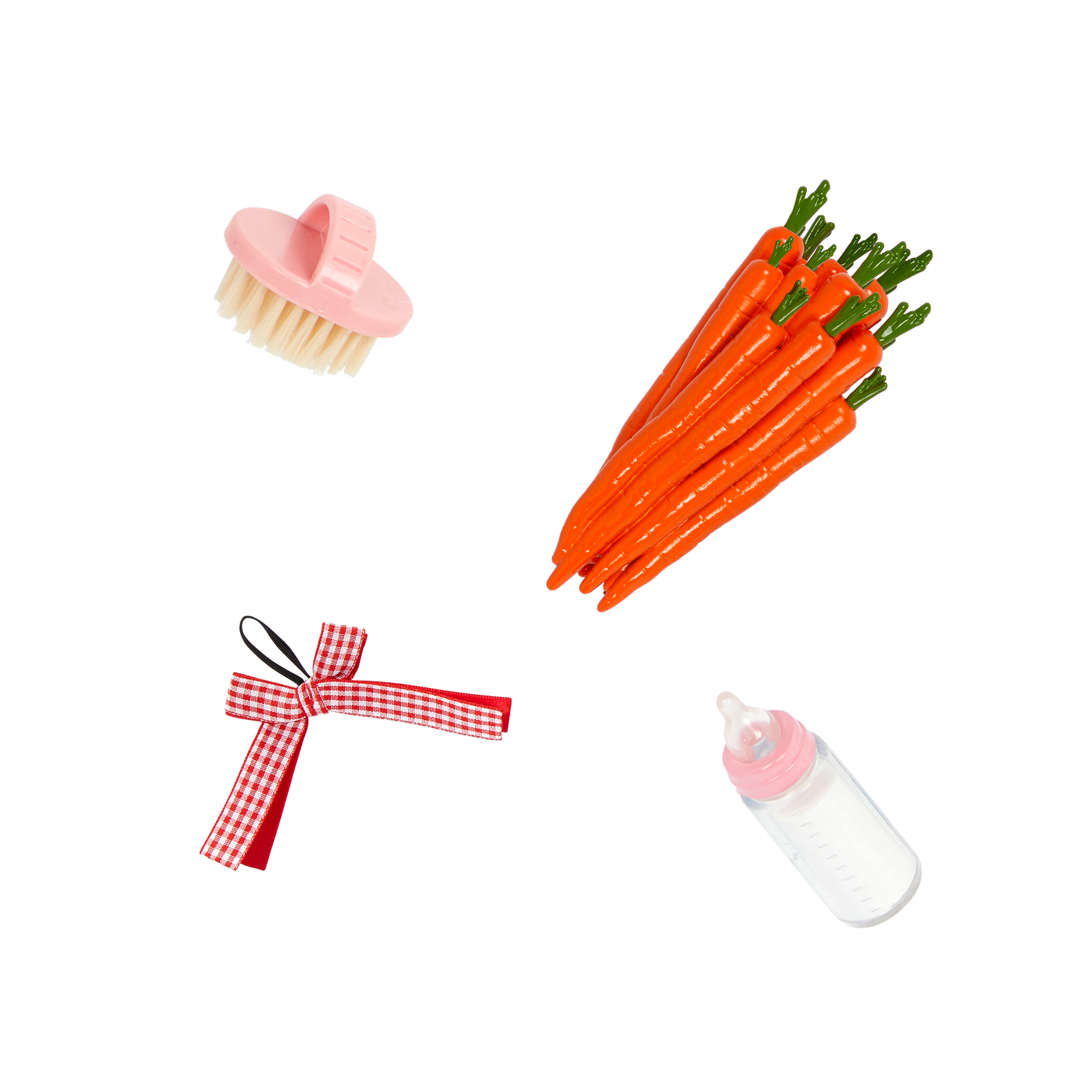 Grow your ranch and learn how to care for a newborn foal with Shelley! This Our Generation 18-inch equestrian doll has a passion for horses. Keep her foal healthy with the feeding bottle, carrots, and grooming brush. Then add a taste of fun fashion with the cute bow - her 12-inch baby horse has a sparkly coat with a silky soft mane and tail to style! Shelley has beautiful brown eyes that open and close with long, wavy blonde hair that's fun to style. She arrives wearing a cute western-inspired dress with denim accents in a polka dot pattern and a pair of riding boots. She also wears a bright red hair bow to match her foal! Her outfit has easy-open closures to quickly put on and remove, so you can mix, match, and create more fun looks for Shelley's galloping adventures!