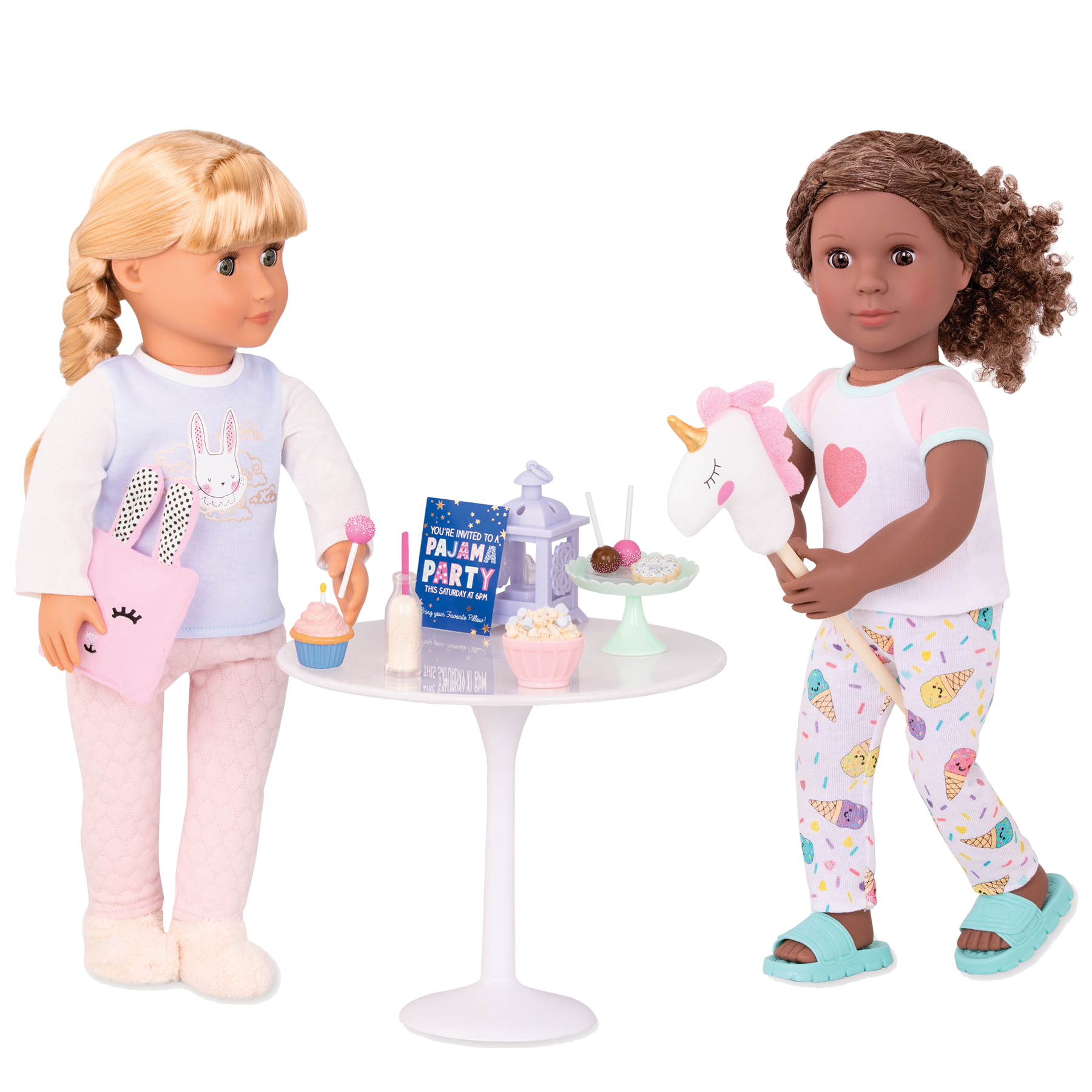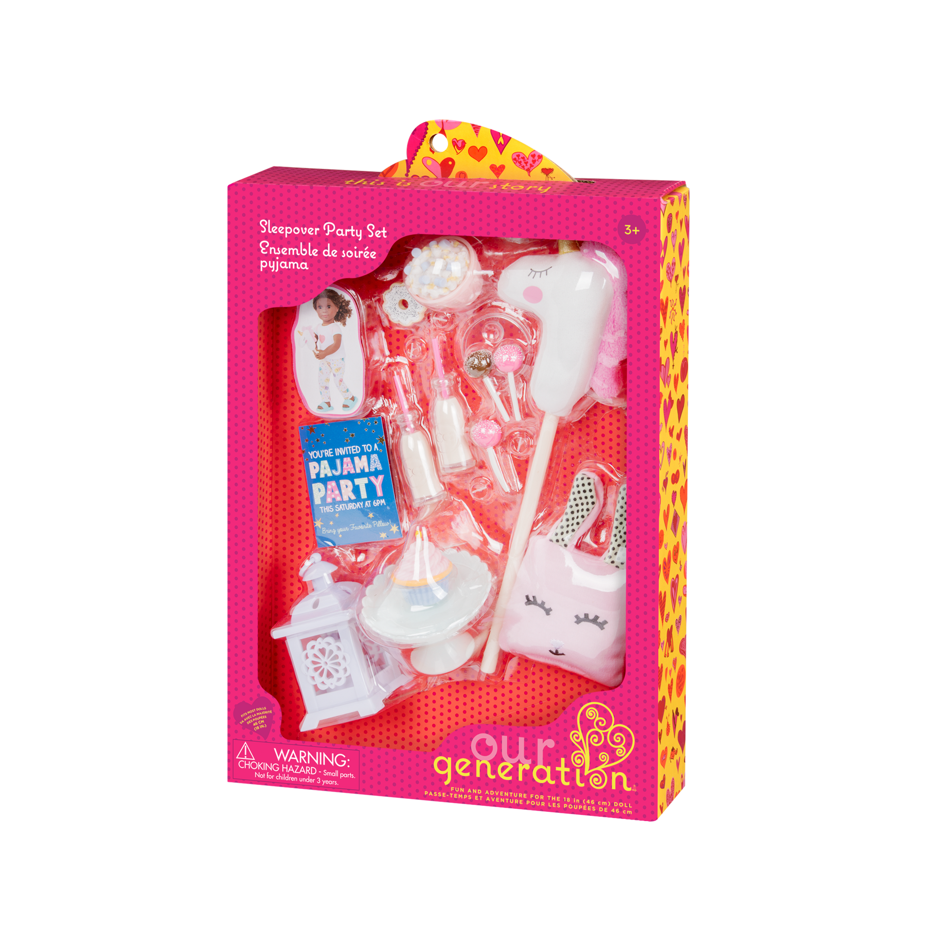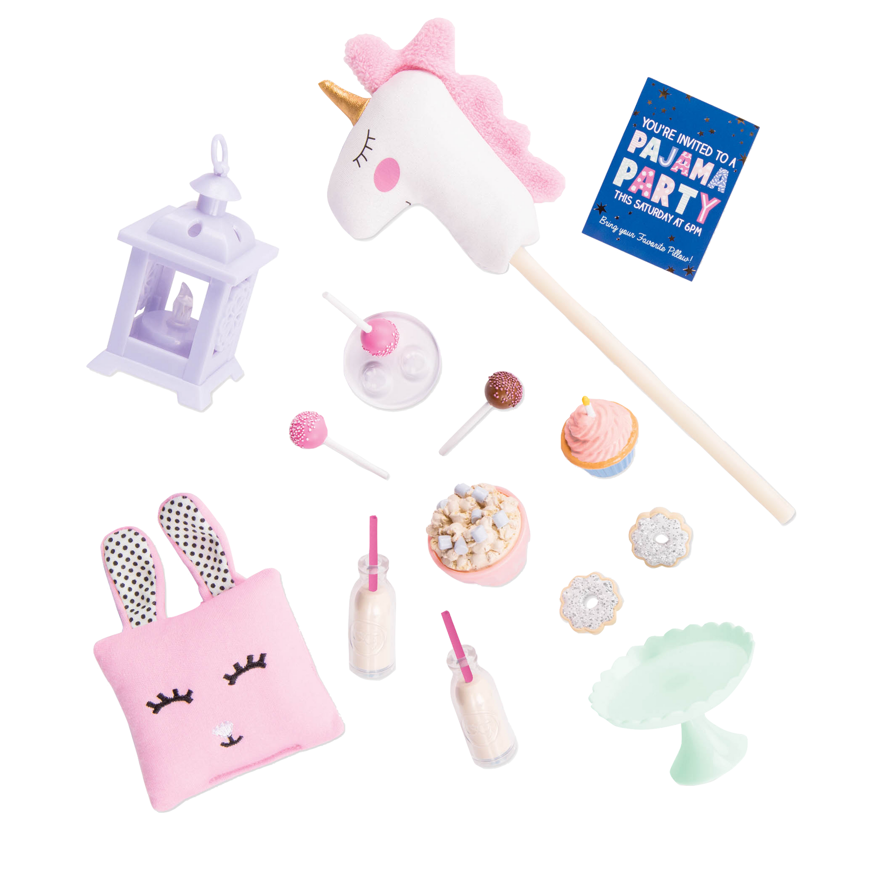 Sleepover fun with your doll best friends is even more fun with the Our Generation Sleepover Set in Unicorn! Your 18-inch dolls will have an incredible night full of giggles and dreams with these awesome doll sleepover accessories! Send out the invitation to invite guests to your slumber party. Set up a cozy area for your dolls with the lantern and the adorable pillow shaped like a cute bunny. Take turns playing with the doll-sized unicorn hobby horse - maybe your dolls can race! Serve up sweet treats for your guests, like cake pops in a stand and popcorn. Wash it all down with the bottles of milk. The pretty dessert stand can display the cupcakes and cookies! Discover all the great bedtime and sleepover accessories from Our Generation for sweet dreams and hours of fun!