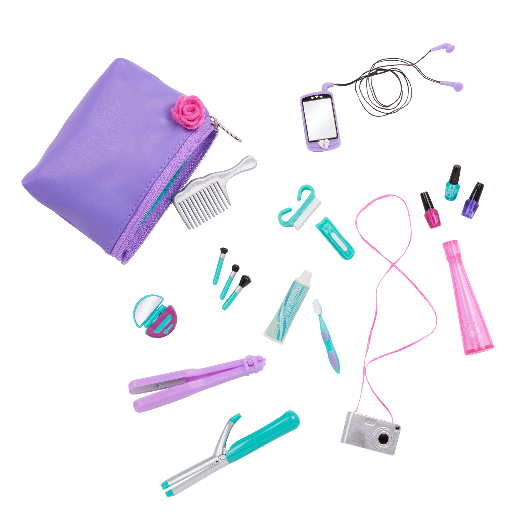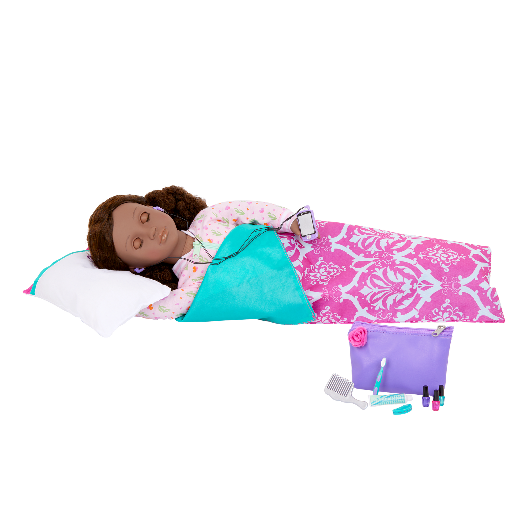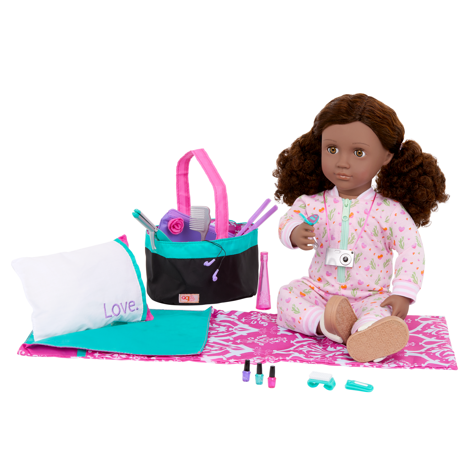Sleepover fun with your doll best friends is even more fun with the Our Generation Sleepover Set in Unicorn! Your 18-inch dolls will have an incredible night full of giggles and dreams with these awesome doll sleepover accessories! Send out the invitation to invite guests to your slumber party. Set up a cozy area for your dolls with the lantern and the adorable pillow shaped like a cute bunny. Take turns playing with the doll-sized unicorn hobby horse - maybe your dolls can race! Serve up sweet treats for your guests, like cake pops in a stand and popcorn. Wash it all down with the bottles of milk. The pretty dessert stand can display the cupcakes and cookies! Discover all the great bedtime and sleepover accessories from Our Generation for sweet dreams and hours of fun!
