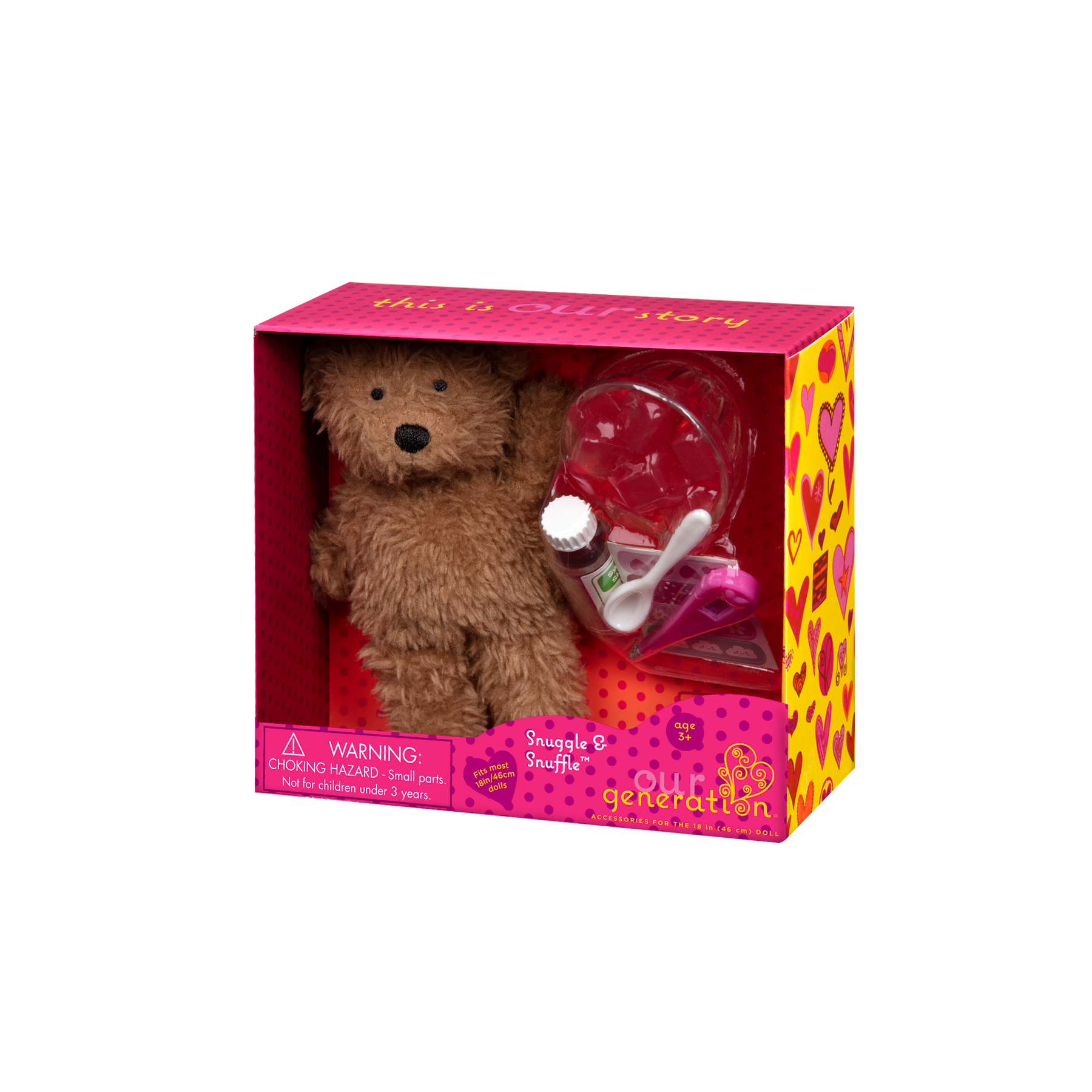 Help your doll friends get back to happy health with a fluffy recovery pal from the Our Generation Snuggle & Snuffle set! These 18-inch doll accessories will have your besties feeling better in no time. Take your doll's temperature with the thermometer by placing it under her arm, then snuggle with the super soft Teddy Bear stuffed animal when it's time to rest! The medicine bottle will help give your bestie a speedy recovery, and you can use the 4 sticker bands on your doll's legs and arms for more fun healing! Is it time for a sweet dessert? Enjoy a treat with the gelatin bowl once your dolls wake up from their nap – yummy! Feeling better always starts with a friendly pal by your side! (Dolls sold separately)