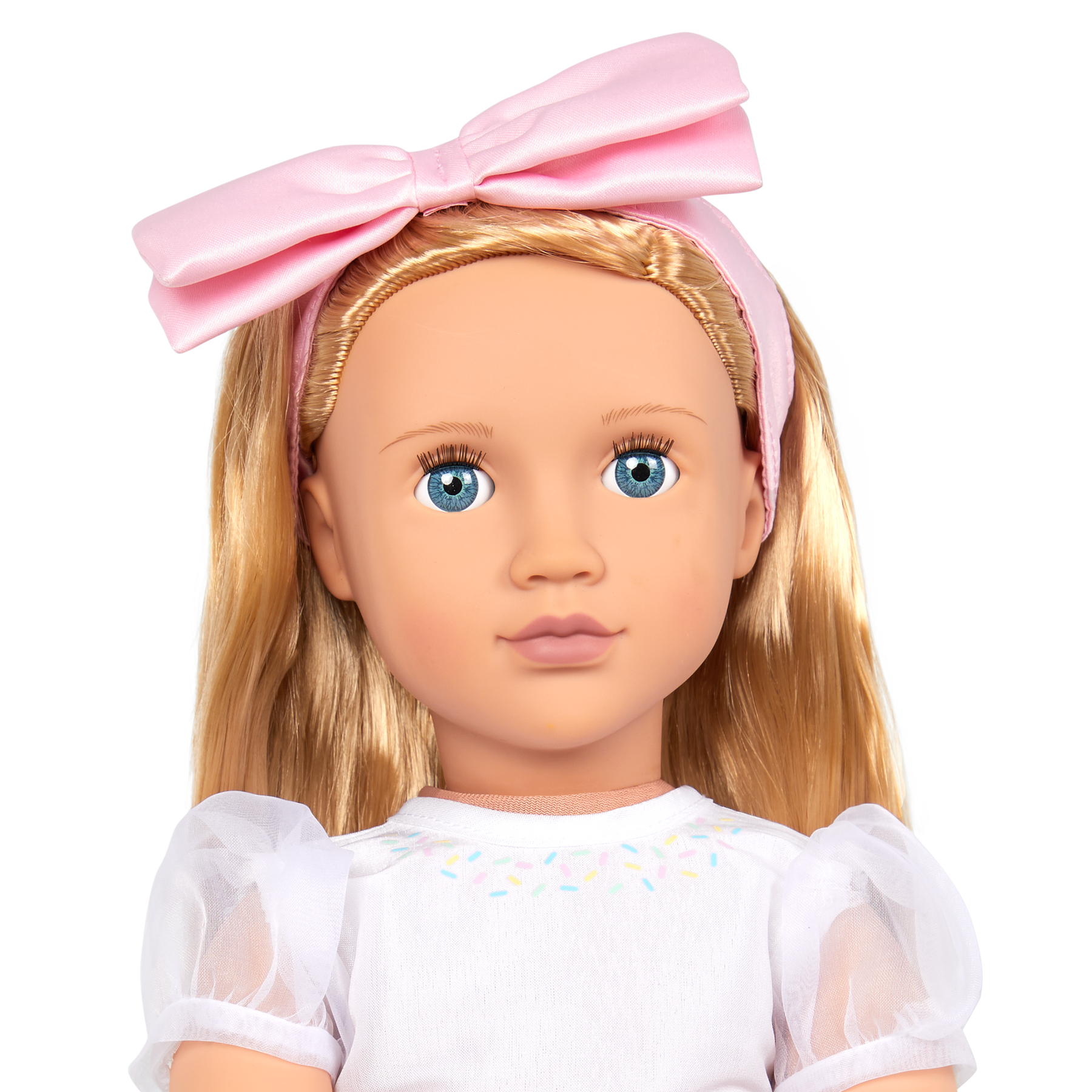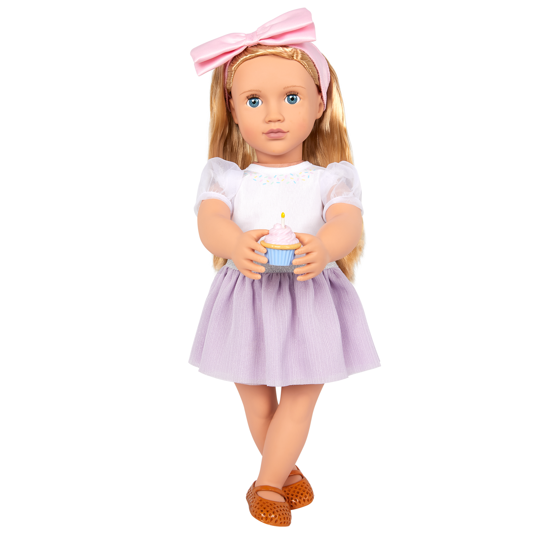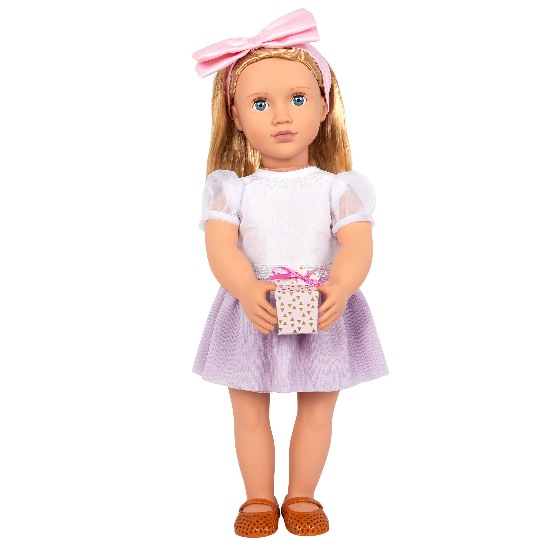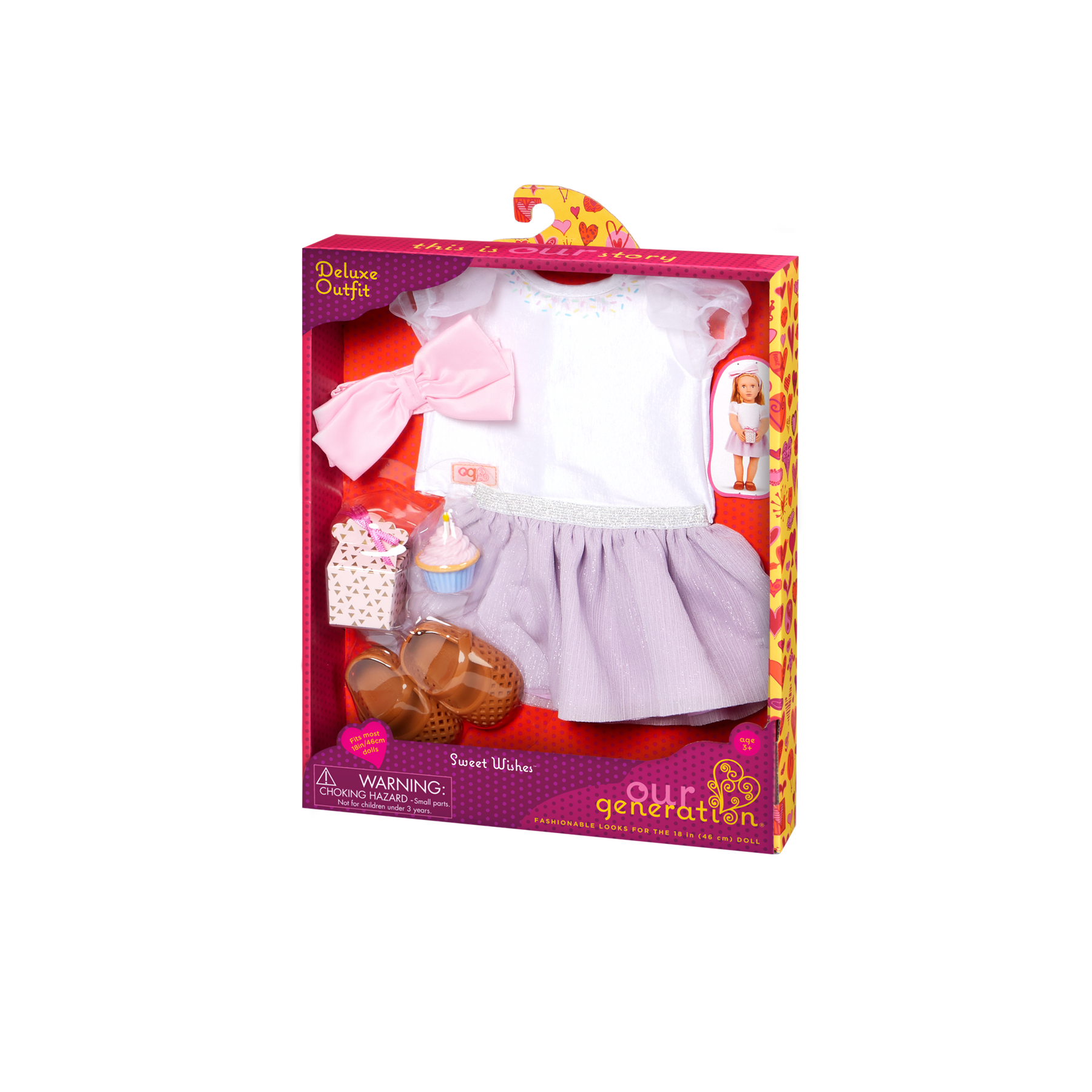 Celebrate your 18-inch doll's special day in fun fashion with the Our Generation Sweet Wishes outfit! Featuring a cute and casual top with cap sleeves and colorful sprinkles on the collar, a pleated lilac skirt, and a large bright pink headband, your doll bestie will look as cute as a cupcake once the festivities begin! When it's time to make a wish, hand out the cupcake and get ready to blow out the candle. Then open up the gift box for a birthday surprise - it holds mini items that your party guests can hide inside! This outfit has easy-open closures to quickly put on and remove and is compatible with most 18-inch dolls and accessories. (Dolls sold separately)