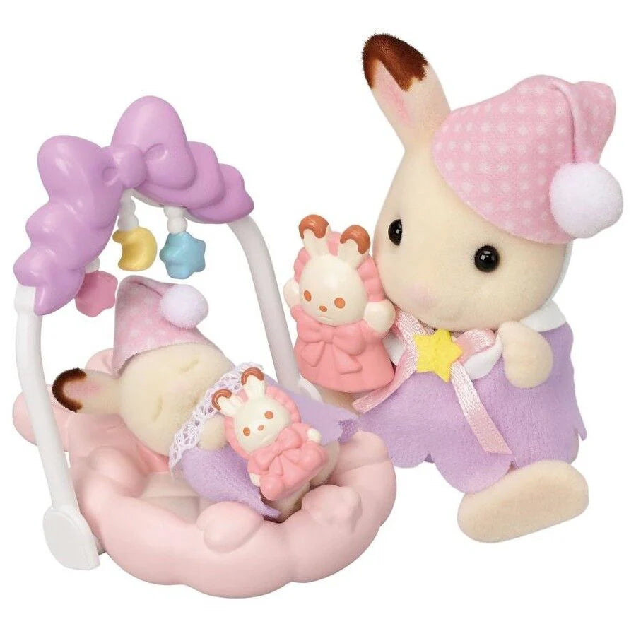 Bedtime is fun with Freya the Chocolate Rabbit girl and Flora the cradled baby, with a baby gym and matching accessories.