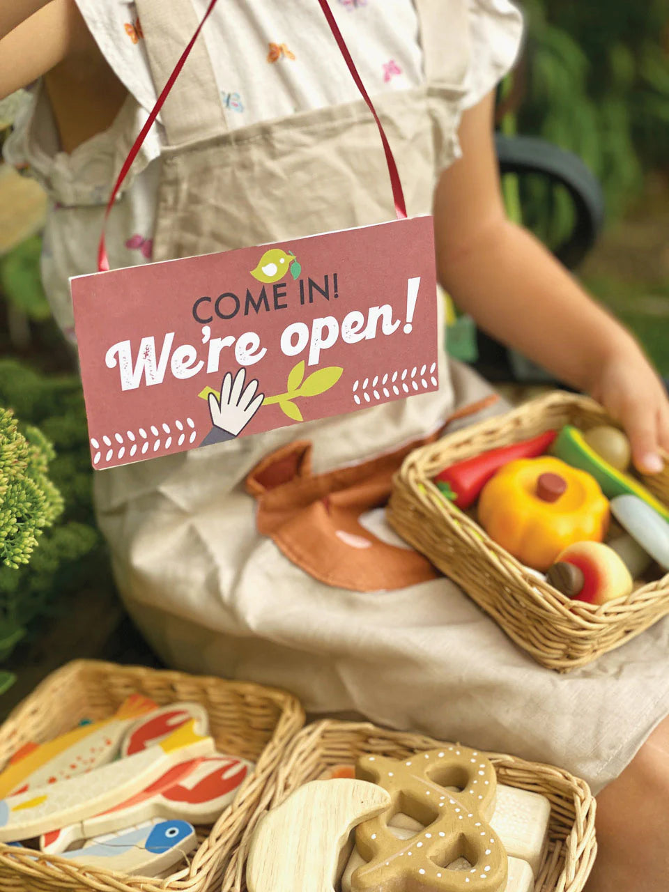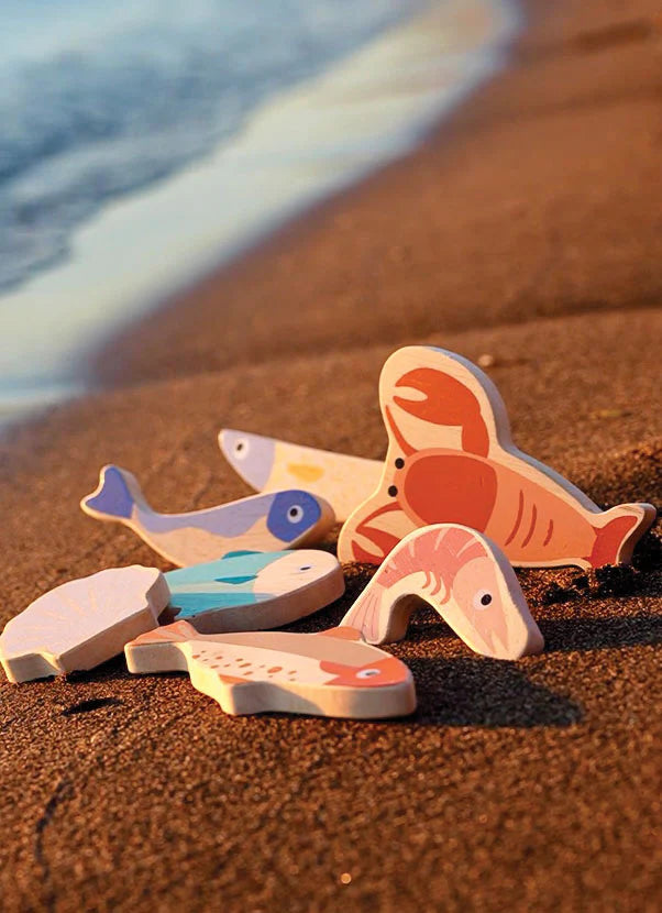 A handcrafted wicker basket with wooden lobster, butterfish, mackerel, herring, whitebait, prawn and scallop.
