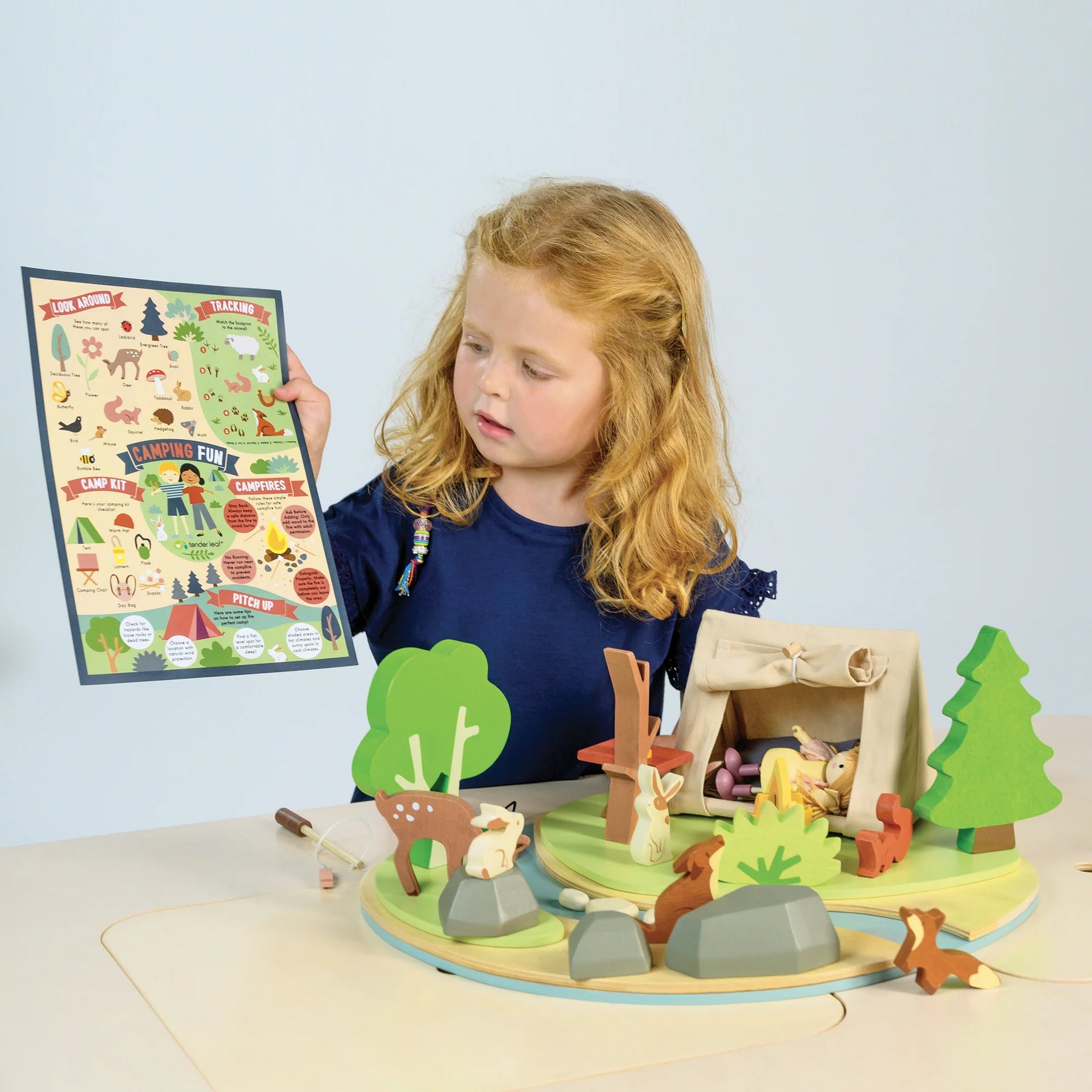 Scaled for dolls house world, this set takes our dollies on an adventure into the wild! Set up camp near a mountain stream and watch the wild forest animals come and play. A cosy sleeping bag, lamp, water bottle and fishing rod are all essential as well as building a small campfire for the evening! Included is a camping poster with real tips and advice for camping trips. Good for imaginative play. Good for storytelling.