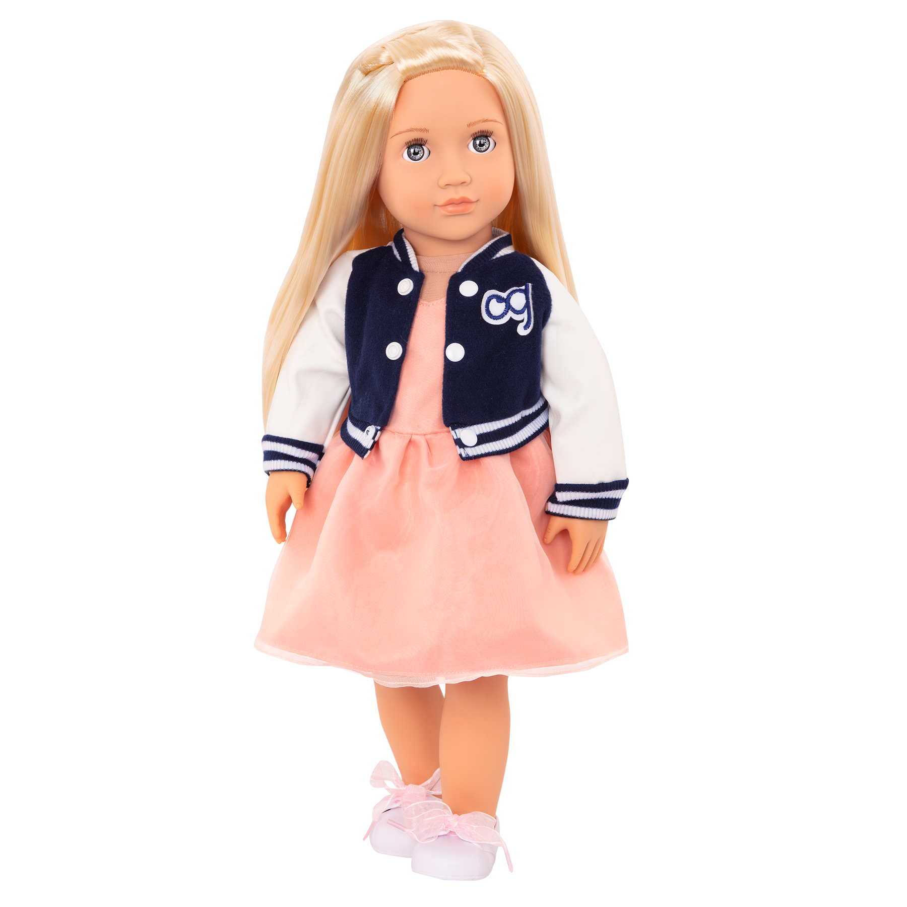 Explore cute fashion and fun styles with Our Generation doll Terry! This 18-inch fashion doll has a huggable soft body and lifelike features that will delight doll fans during playtime. Her beautiful blue eyes open and close, and her long blonde hair is fun to style in many ways! Terry shows her OG spirit in a trendy blue and white varsity jacket over top of a sweet pink dress and shoes with real laces to tie. When it's time for dress-up, her outfit has easy-open closures to quickly put on and remove. So you can mix, match, and create even more styles on any adventure! Our Generation dolls make a great gift for kids ages 3+ (small parts), encouraging them to imagine their own unique stories.