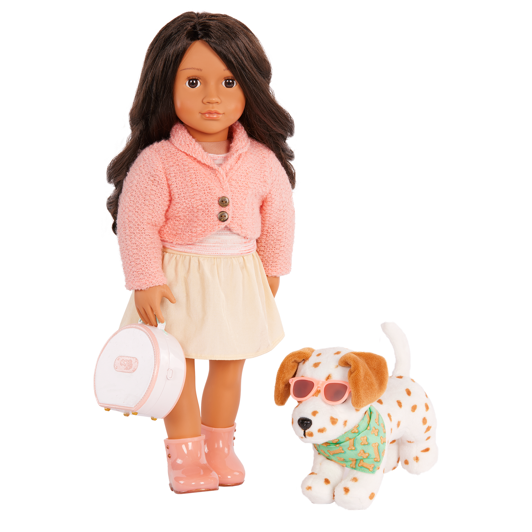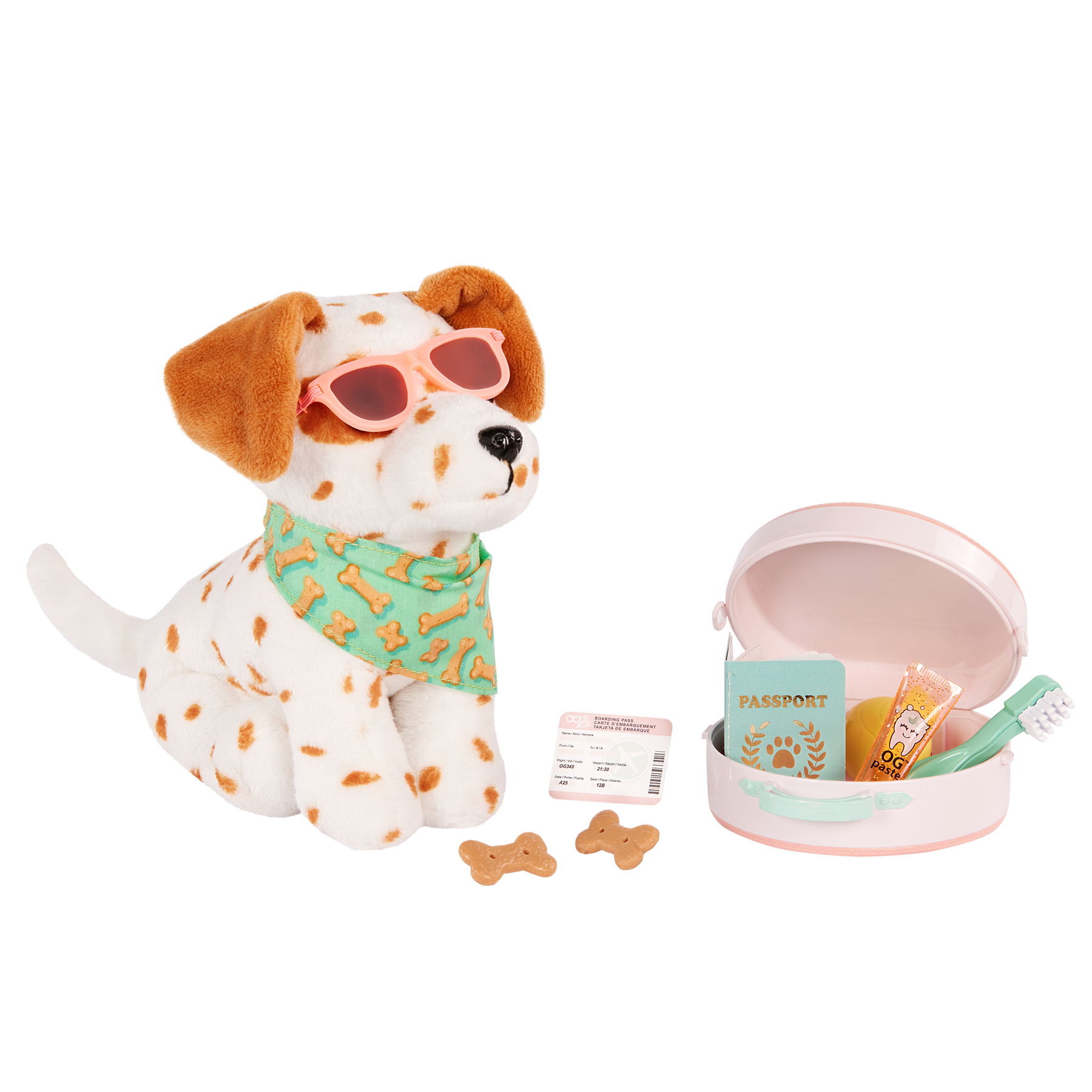 Explore the world and create happy tails with the Our Generation Vacay Pup! This 6-inch Lemon Dalmatian dog plush has soft, spotted-plush fur and is posable. So kids can bend its legs to sit, shake paws, and more to fit their playing style. Ready for vacay mode? This pup comes with cute styling accessories like a pet bandana with dog bone prints and a pair of sunglasses. Plus, it includes bonus play pieces like a carry-on luggage, a passport, a boarding pass, a toothbrush, toothpaste, 2 dog treats, and a toy ball. Animal fans can even open up the luggage to pack puppy's essentials and treats on every trip! Compatible with most 18-inch dolls, 6-inch stuffed animal toys, and accessories. Our Generation pets make a great gift for kids ages 3+ (small parts), encouraging them to create their own unique stories. Our Generation dolls sold separately.