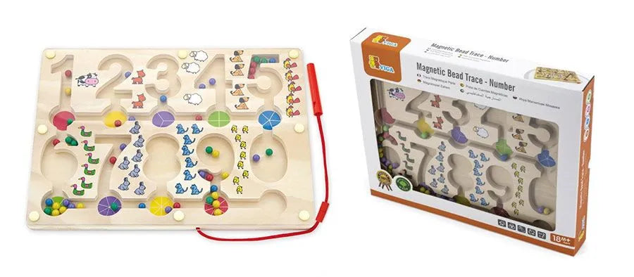 This wooden magnetic board promotes number recognition and fine motor skills.