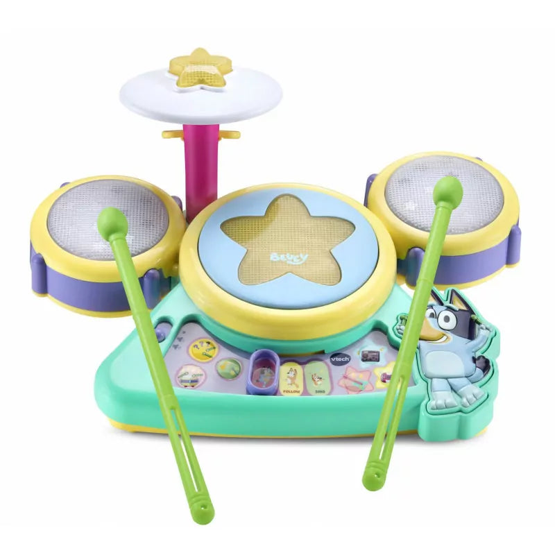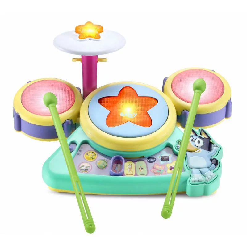 Drum up fun with Bluey! Play along to favorite tunes from the show in different music styles or have a drum solo with acoustic, electronic, silly or animal sounds and effects. The drum pads and cymbal light up when tapped. Listen to a beat and repeat it in an exciting memory game. Sing along to songs from the show and dance like the grannies with Bluey and Bingo in Dance Party mode. Press the Bluey button to hear her voice and the show's theme song. When it's time to take five, place the drumsticks in the holder for safekeeping. Hooray!
