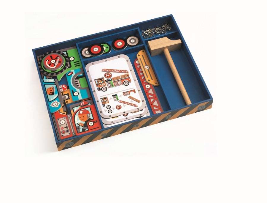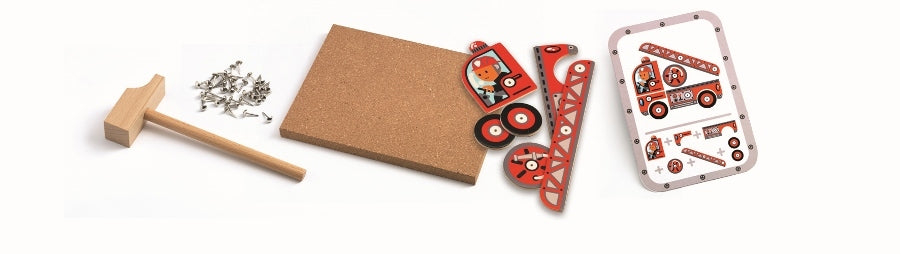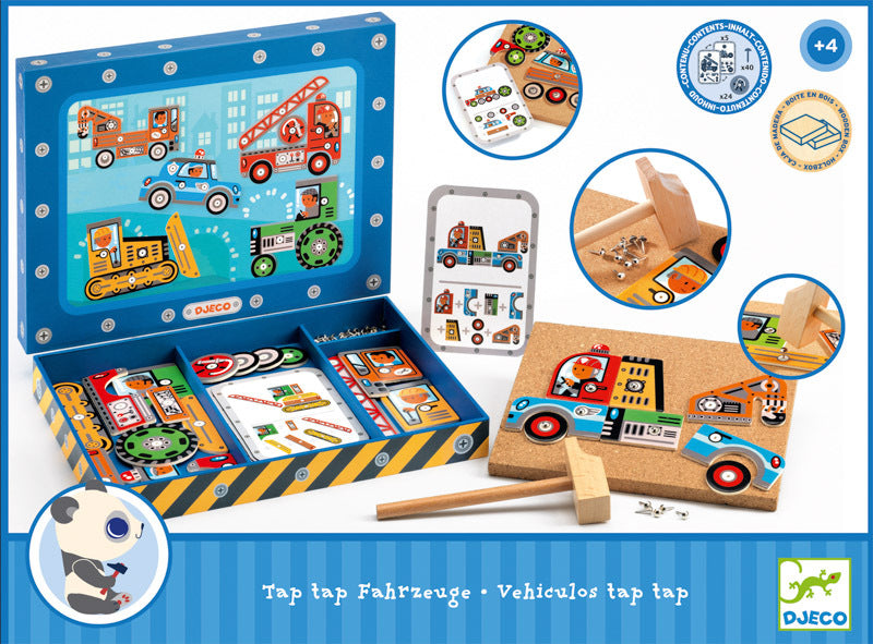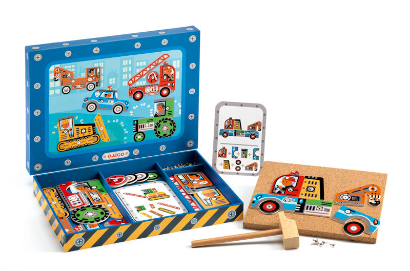 This Djeco Tap Tap Vehicles creative play set will keep little vehicle lovers happy for hours of innovative construction play. Kids will love creating their very own vehicles by following the designs displayed on the cards, or by making their own unique combinations. Just choose your wooden vehicle pieces and tap-tap it into place on the cork board using the supplied tacks. Adult supervision is recommended.