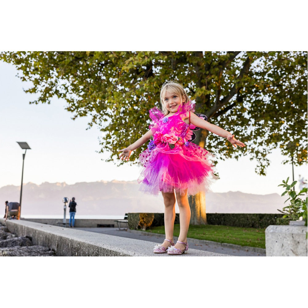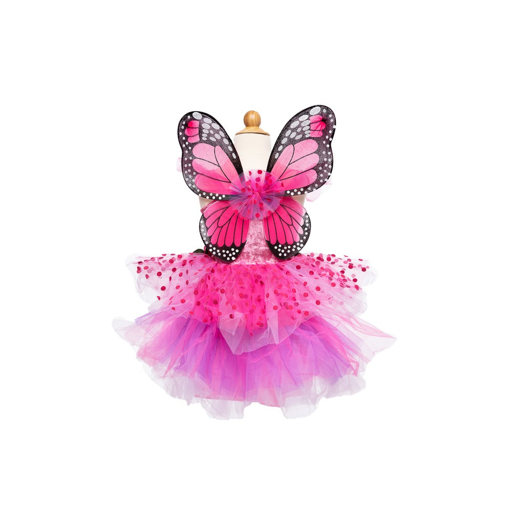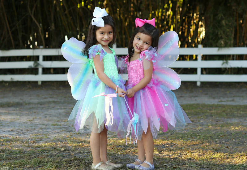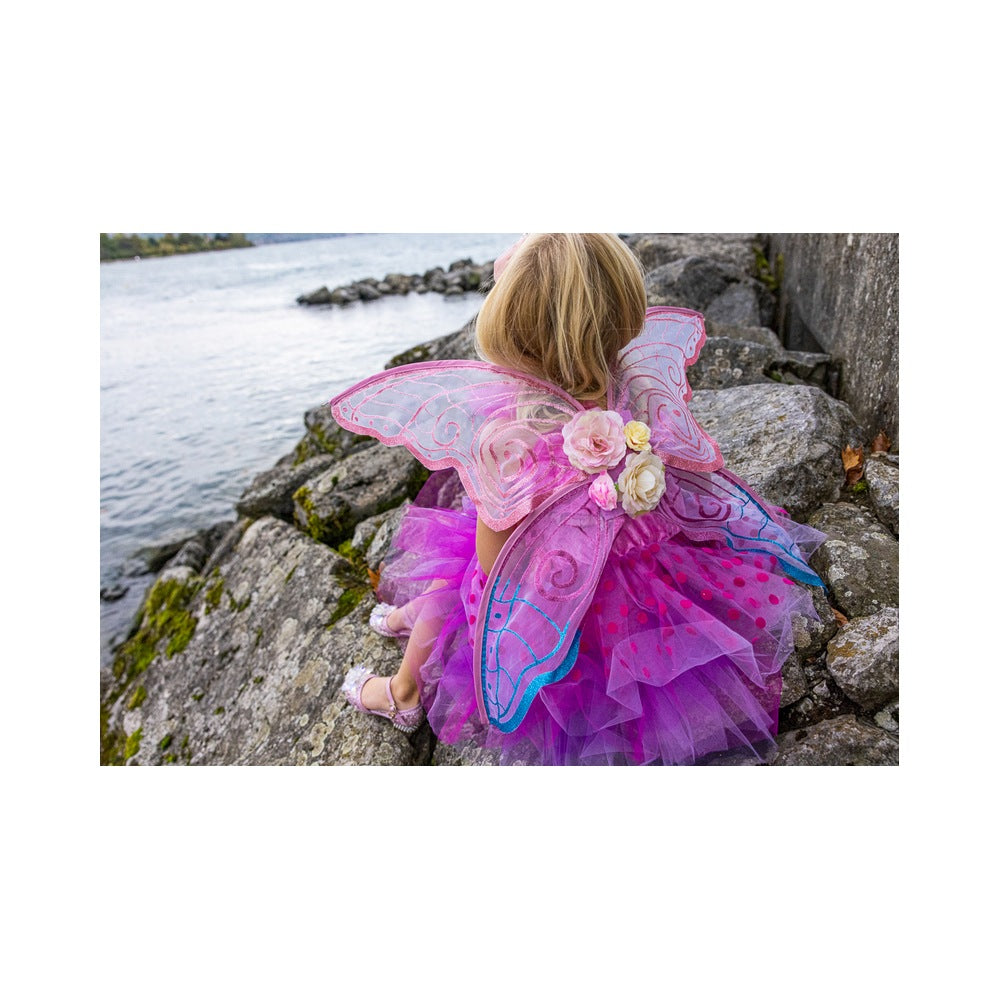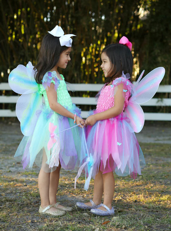 Designed for delightful twirls and spins, the scalloped-cut skirt adds a whimsical flair to every movement. What truly sets this dress apart is the addition of attached butterfly wings. Crafted from beautifully printed mesh, these wings feature finger loops that flutter and flap, bringing an extra dose of magic and wonder to your child's day.