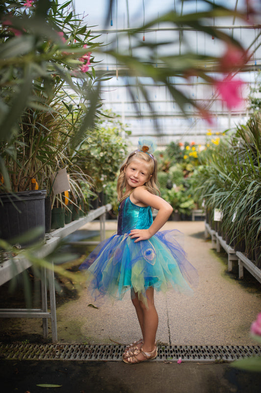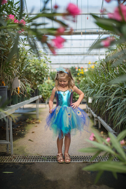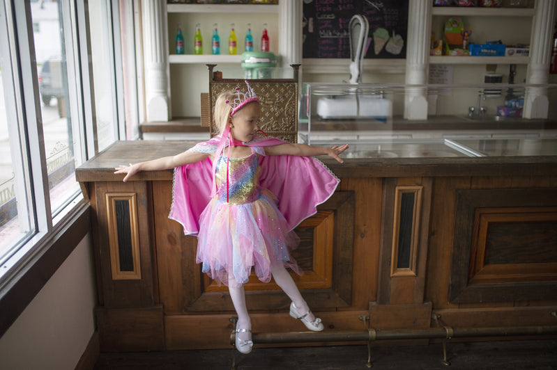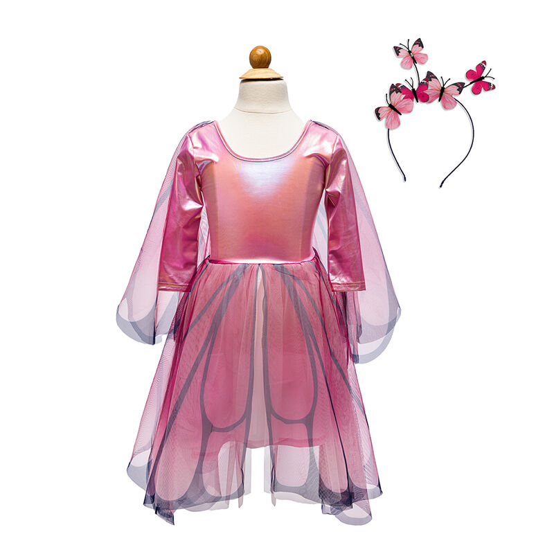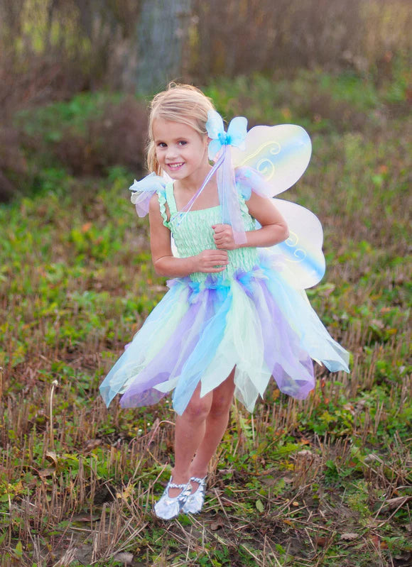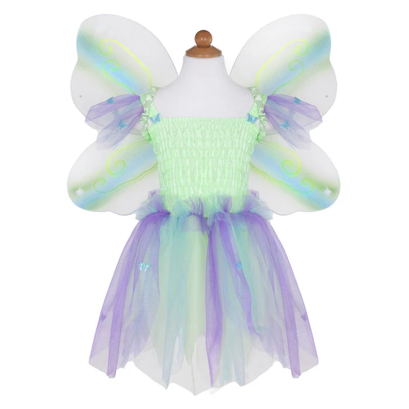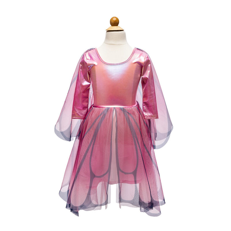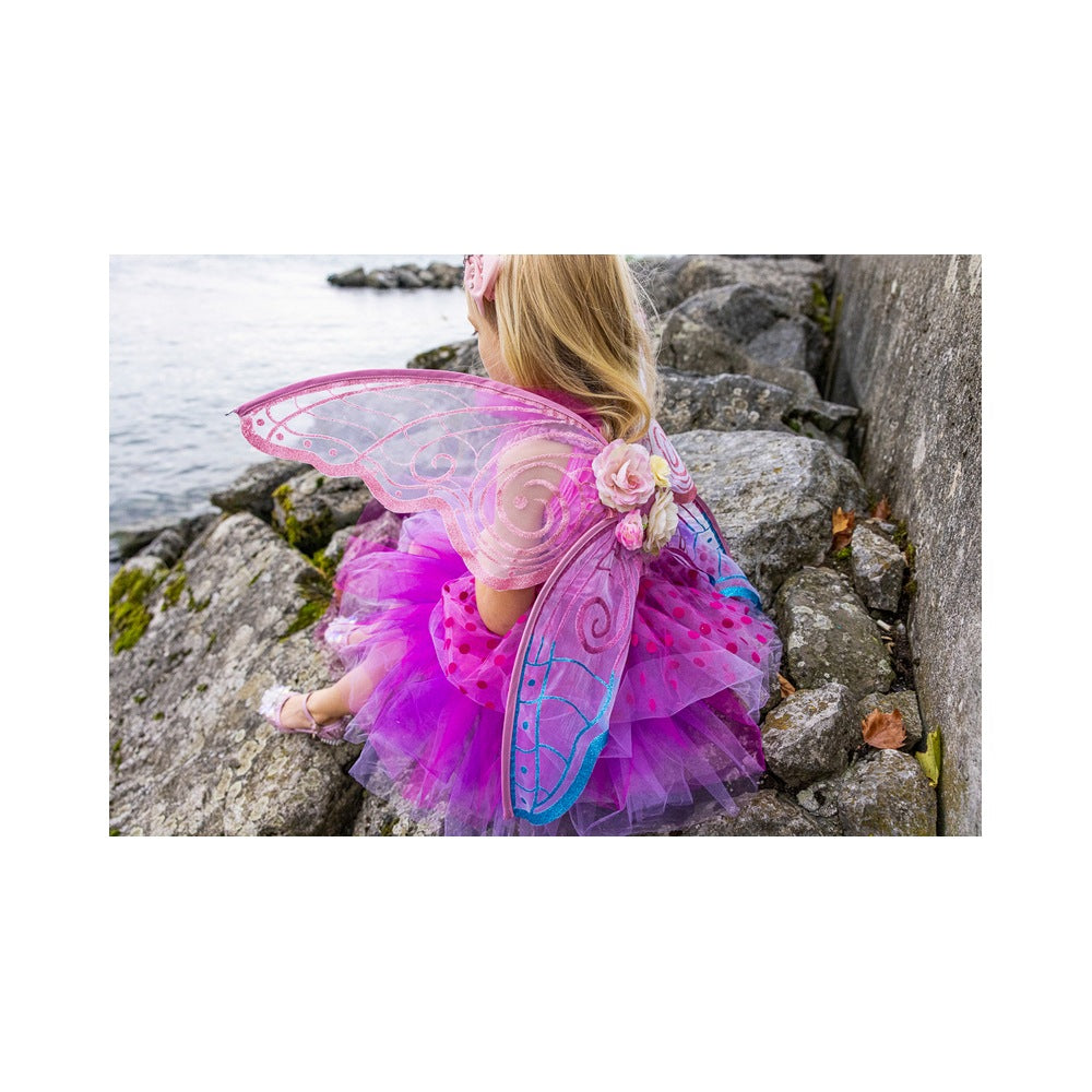 Designed for delightful twirls and spins, the scalloped-cut skirt adds a whimsical flair to every movement. What truly sets this dress apart is the addition of attached butterfly wings. Crafted from beautifully printed mesh, these wings feature finger loops that flutter and flap, bringing an extra dose of magic and wonder to your child's day.
