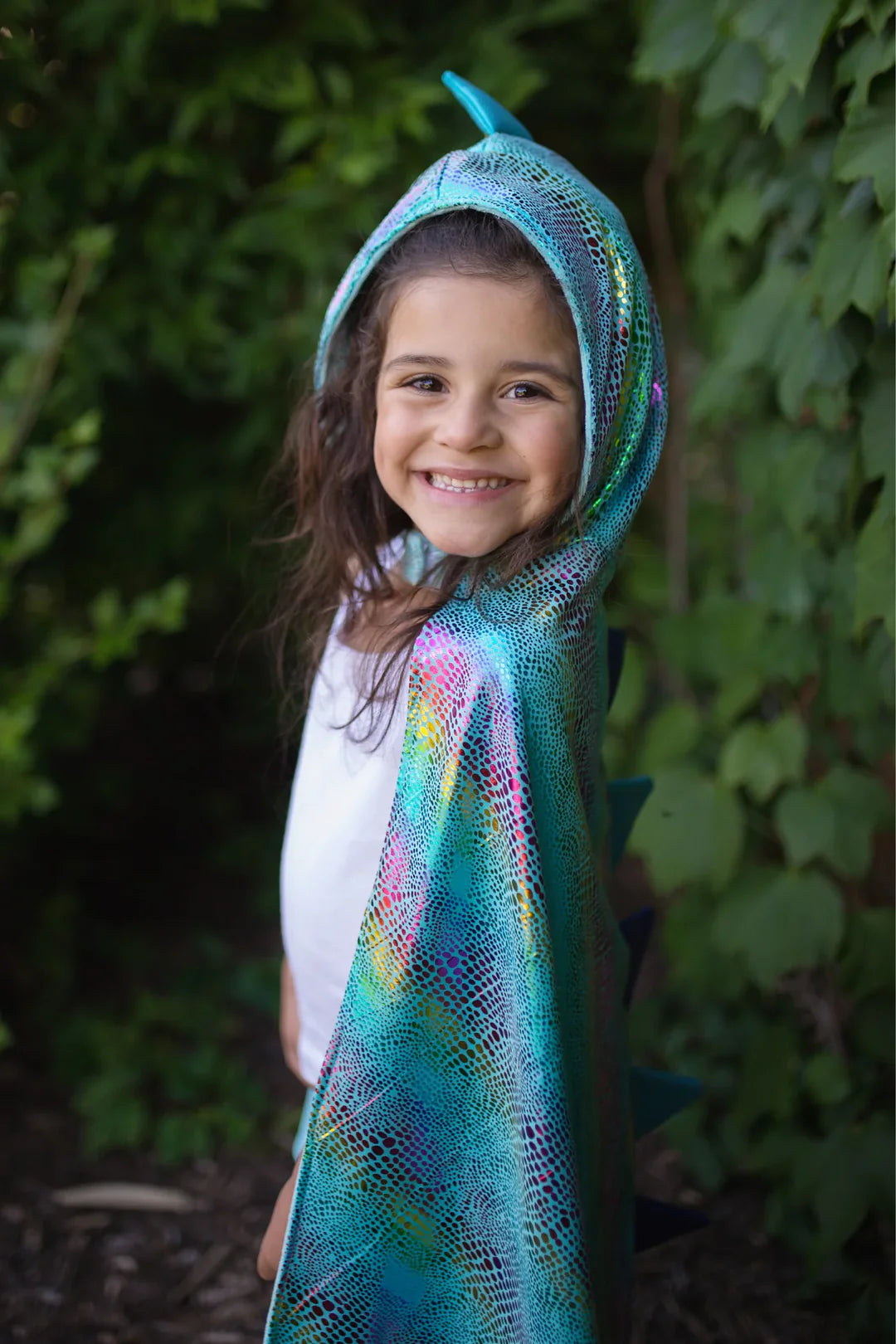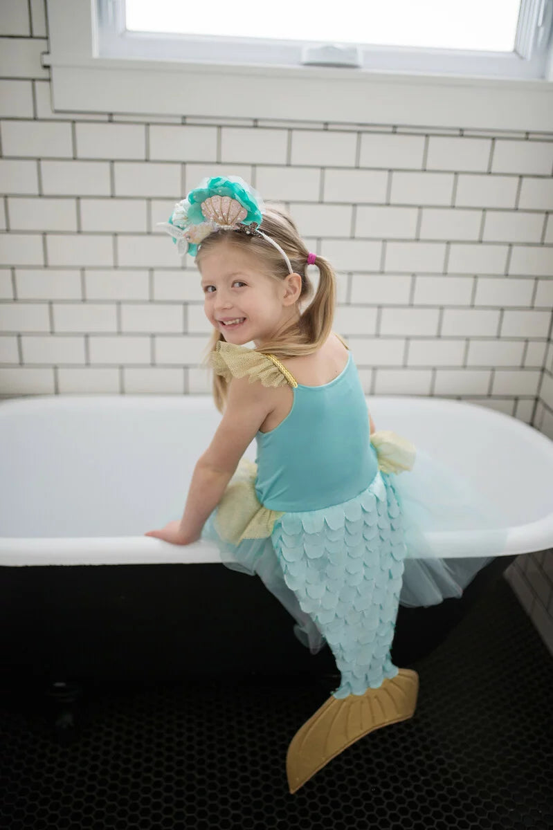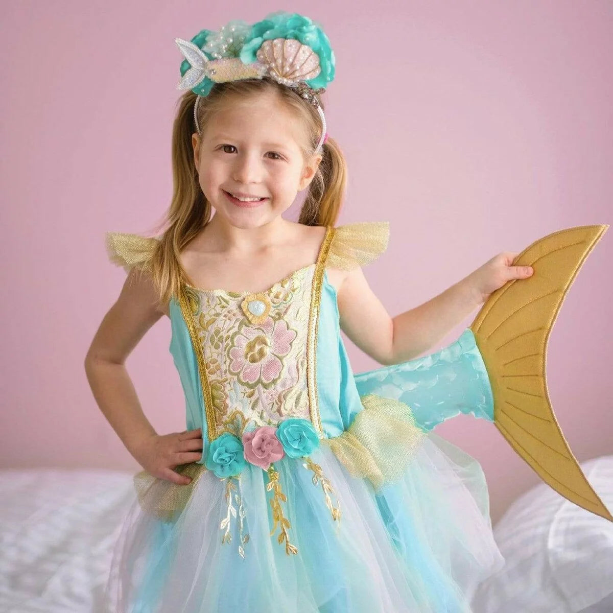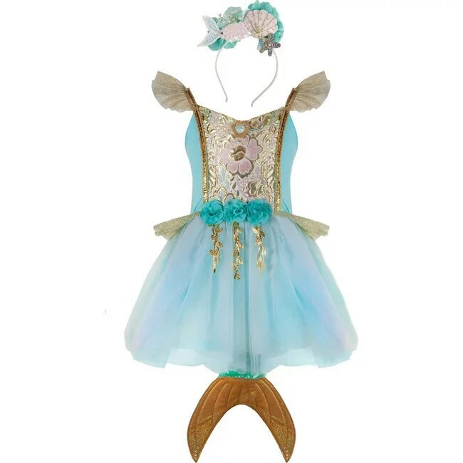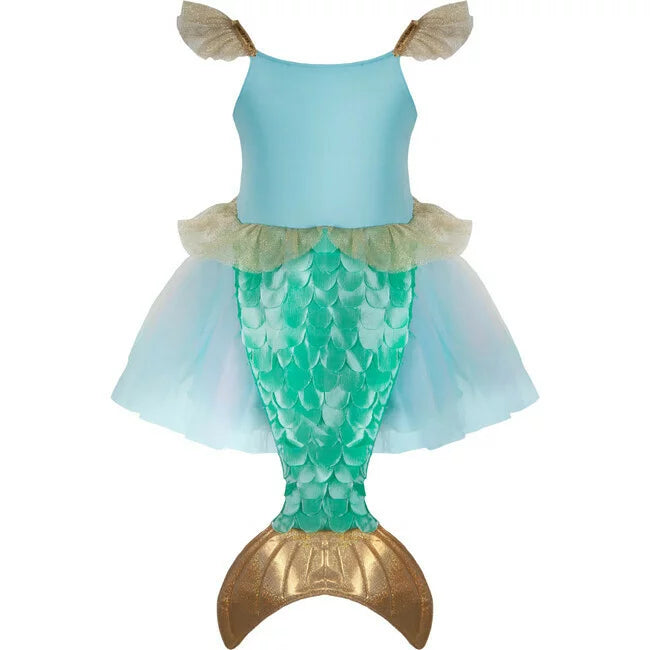 Designed for delightful twirls and spins, the scalloped-cut skirt adds a whimsical flair to every movement. What truly sets this dress apart is the addition of attached butterfly wings. Crafted from beautifully printed mesh, these wings feature finger loops that flutter and flap, bringing an extra dose of magic and wonder to your child's day.