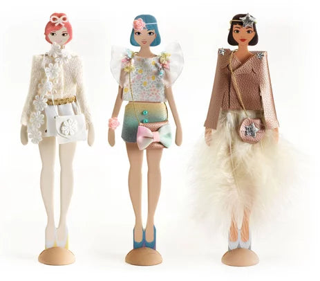An ideal set for budding young stylists without needing to know how to hold a needle, while still offering a step up from paper creations! With real fabrics, use the instructions as a guide, follow the patterns and simply assemble the parts without sewing. Now all you need to do is decorate the outfits with the many accessories provided and display your designs on the standing dolls!