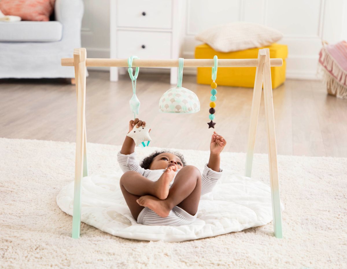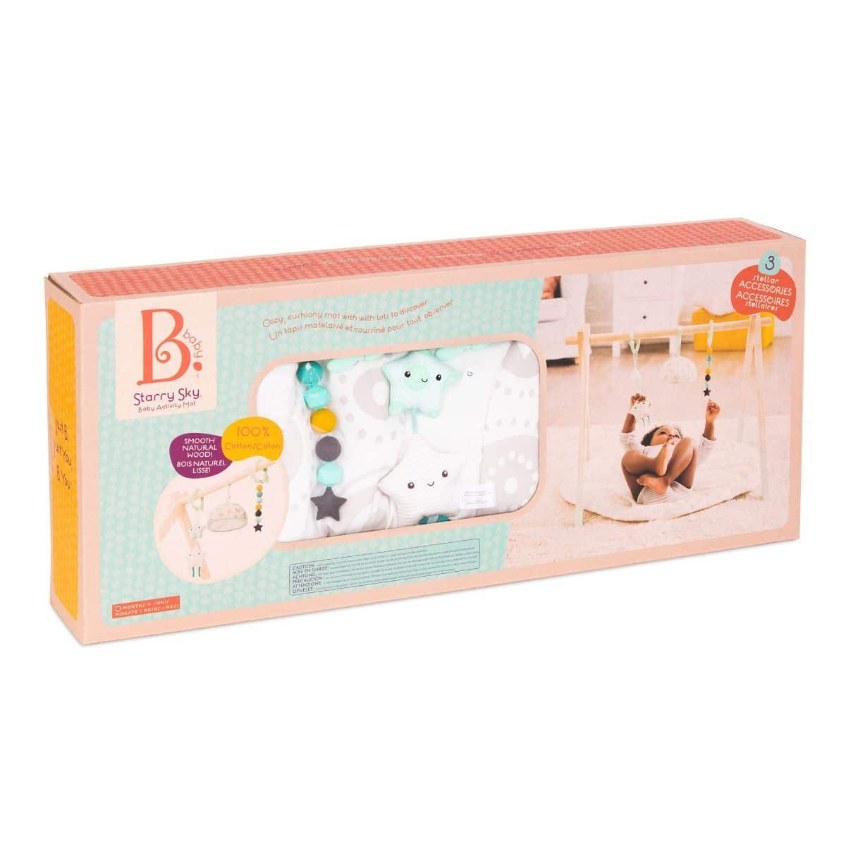 Settle in for a dreamy time with the Starry Sky baby gym from B. baby! Little ones can get cozy on the comfy mat and explore 3 sensory toys hanging above – a cloud-shaped mirror, squishy stars, and differently-shaped beads. Made of natural wood, this developmental baby gym is great for giggles, games, naps, and dreams – no matter where you are. Assembling and disassembling this activity gym is as easy as 1-2-3 and the cozy cotton mat is machine-washable, just like your baby’s clothes! Not to mention that the hanging toys are detachable – simply pop them off and hook them on the crib, stroller, or car seat to improve motor skills and hand-eye coordination on-the-go. Recommended for newborns and over.