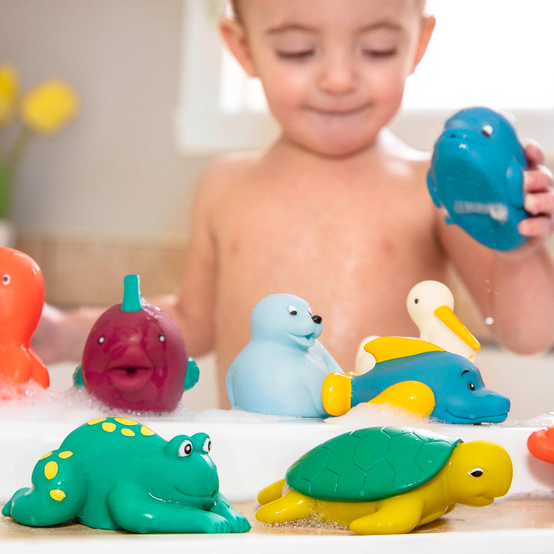 • Ocean Friends: 12 toy sea animals to squeeze and squirt in the tub!