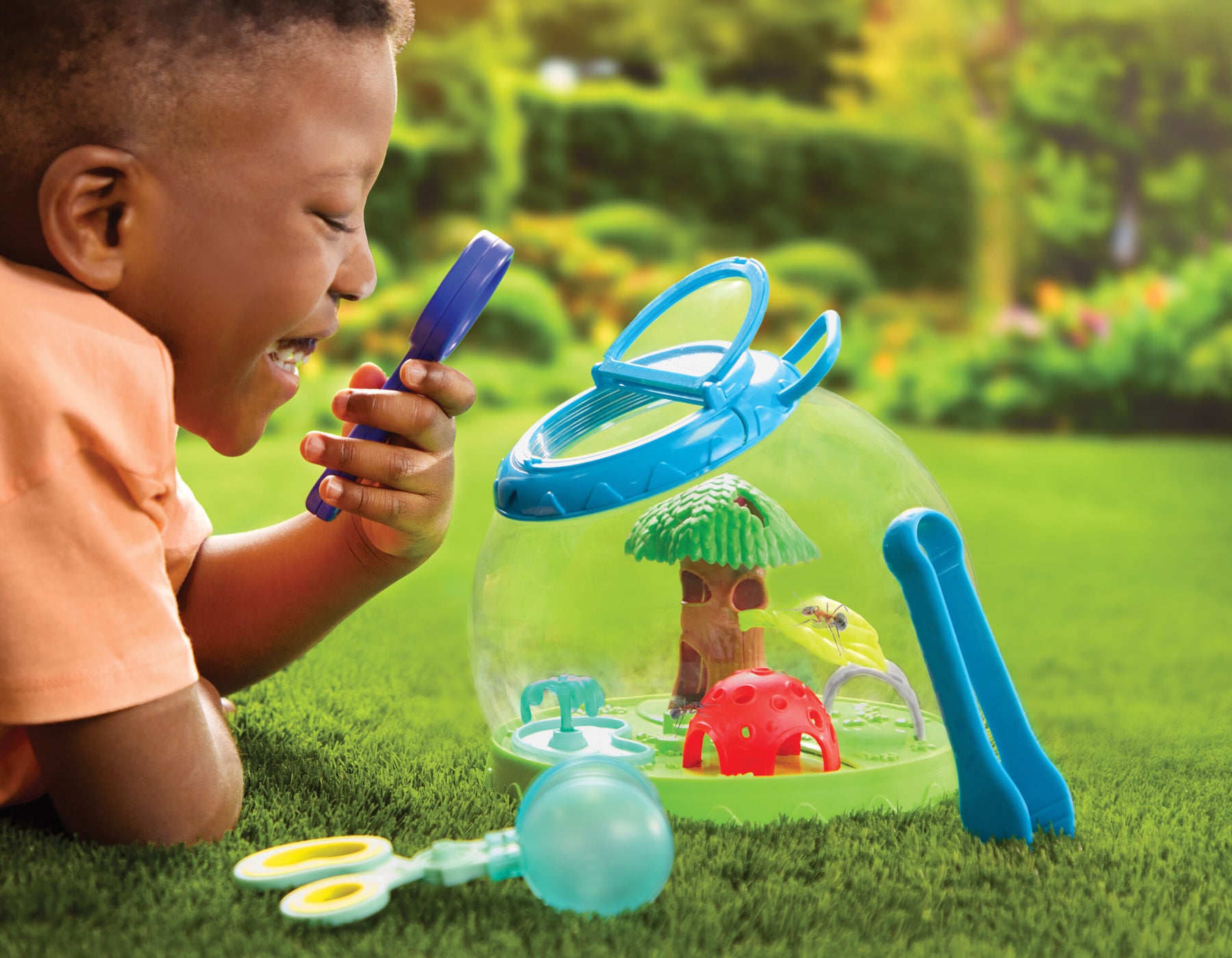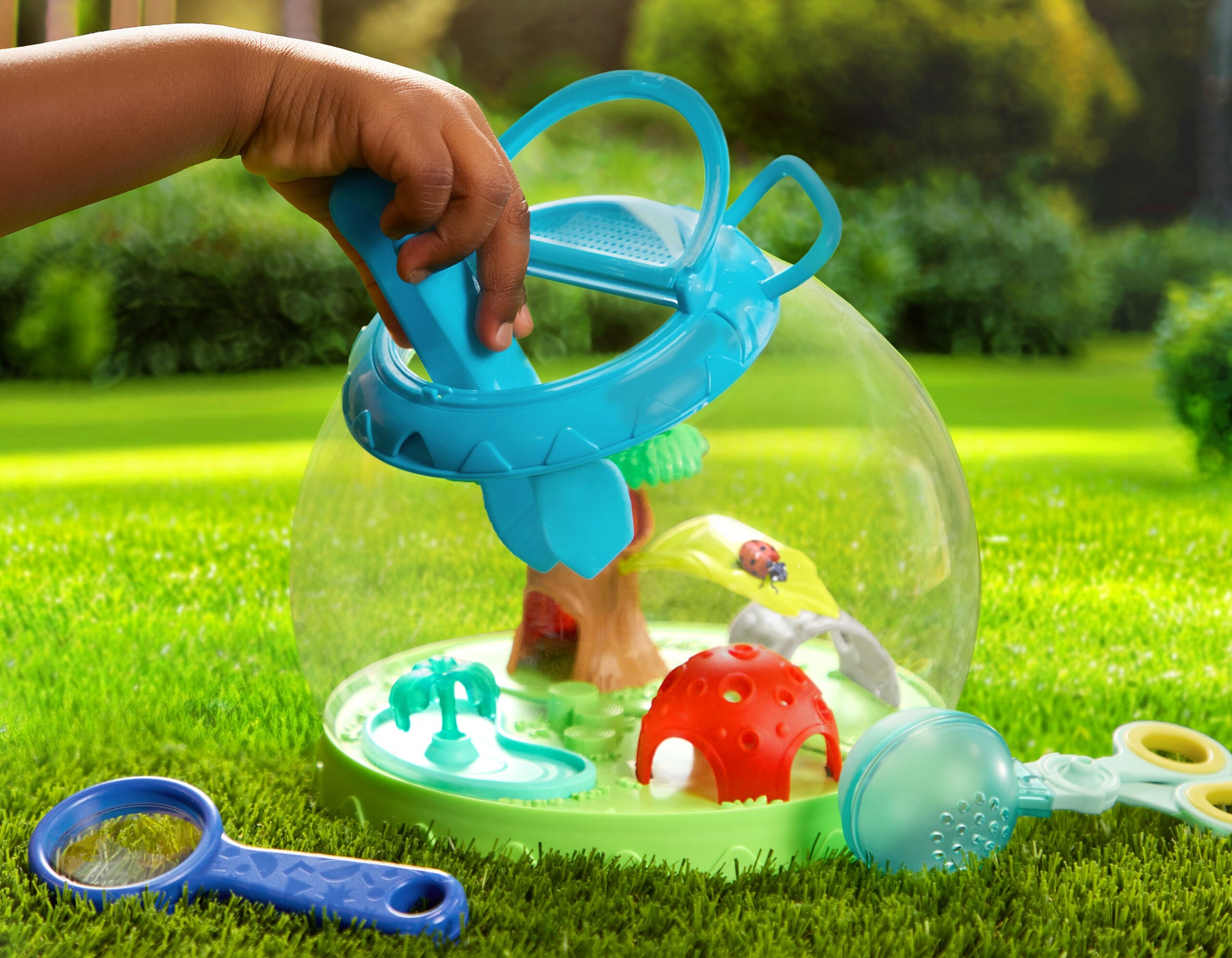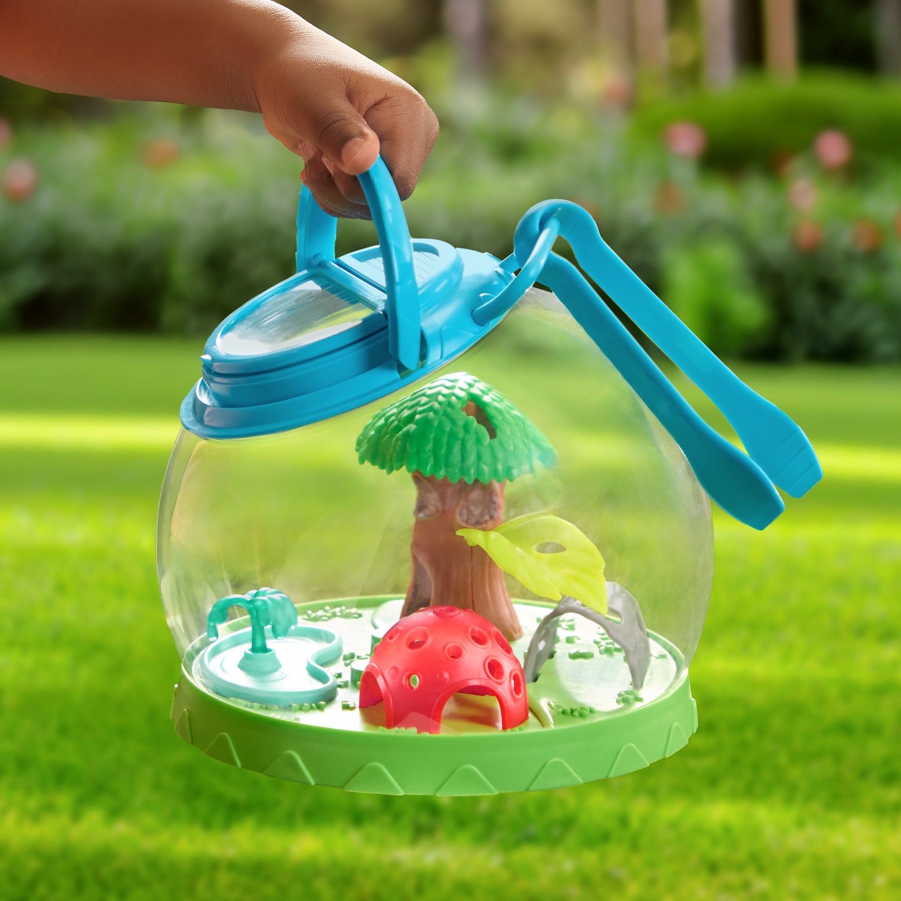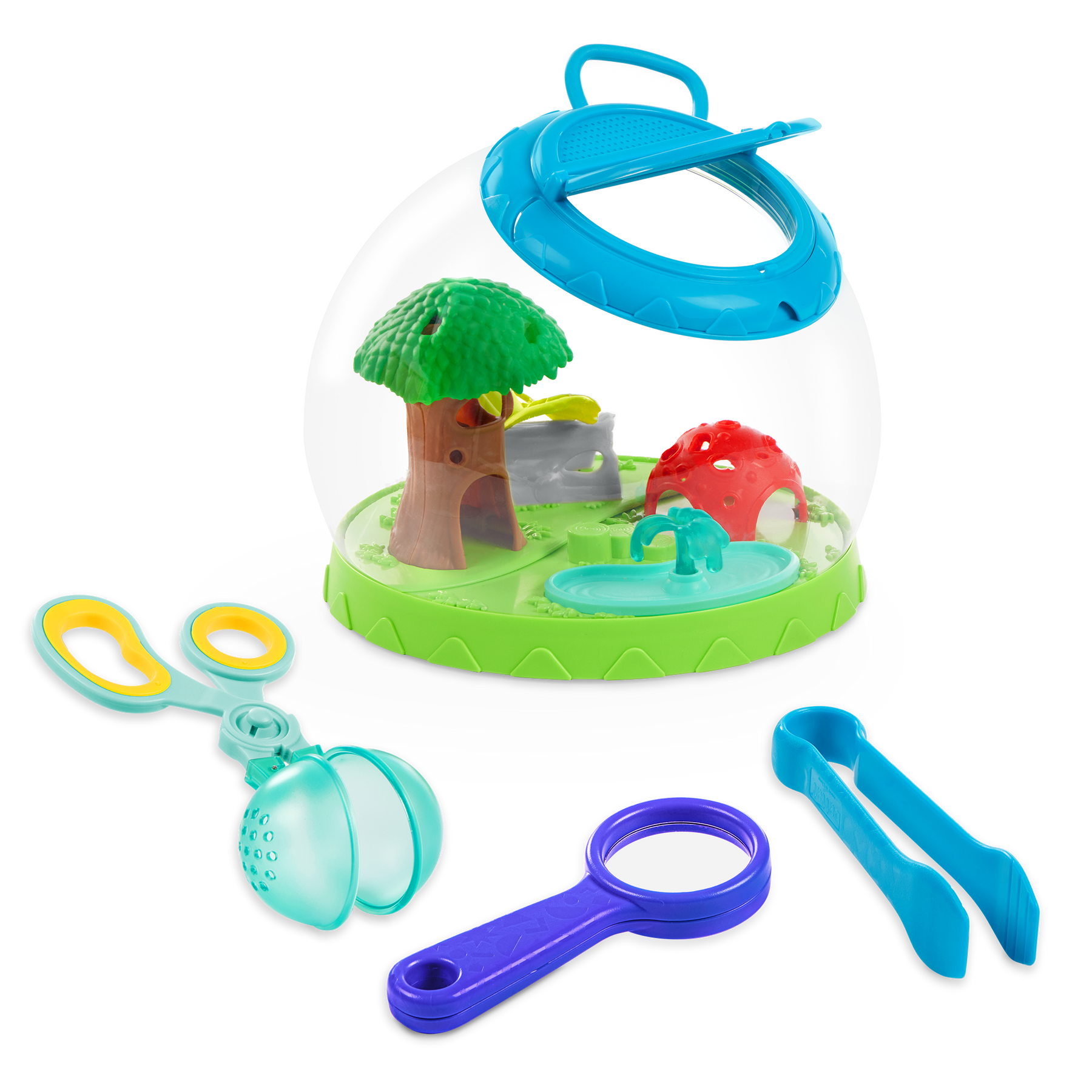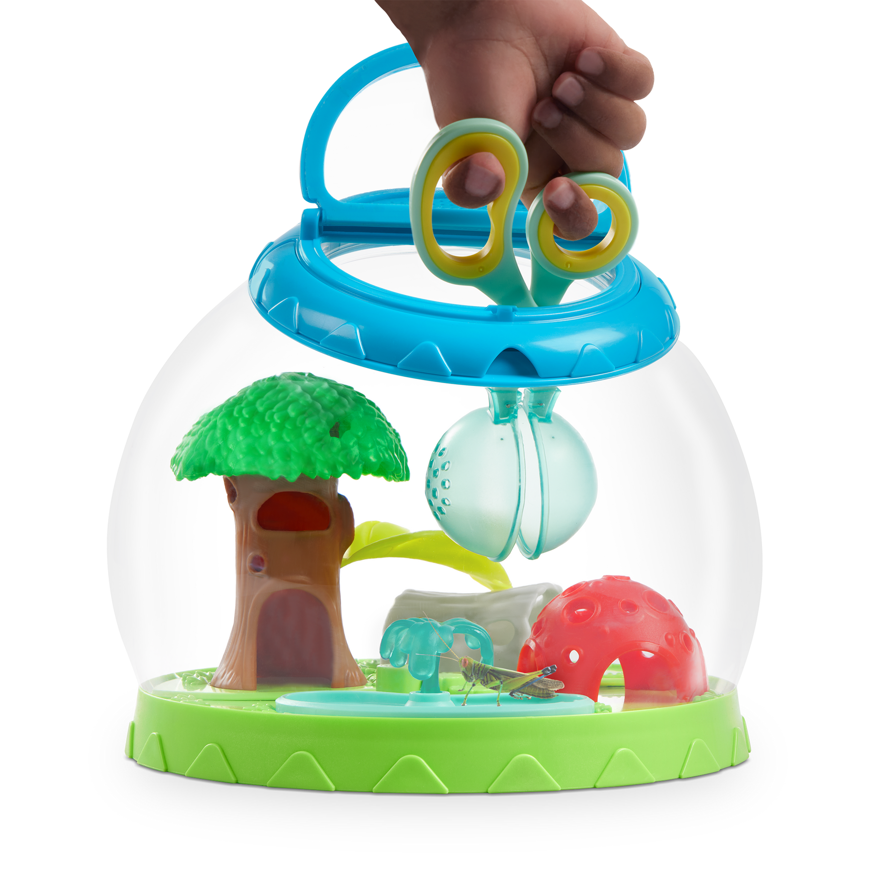 This 5-piece set lets little explorers safely observe their favorite critters inside a dome with a ventilated lid. The included magnifier helps kids get an up-close view, while the scooper and tweezers make catching bugs easy. Plus, leafy branches, a treehouse, and a log give tiny guests a natural hideaway! Add a splash of water to the fillable oasis and let the bug-friendly fun begin!