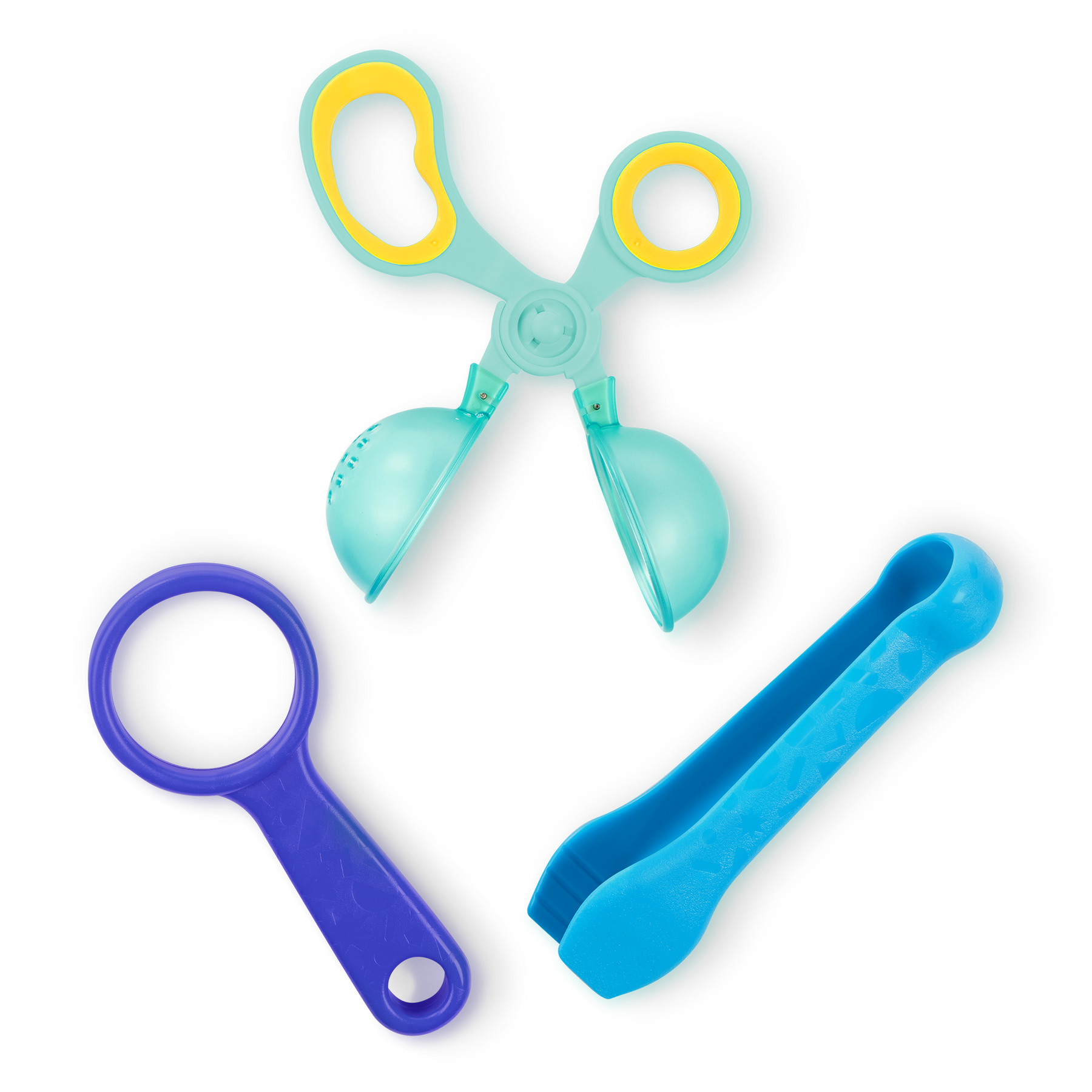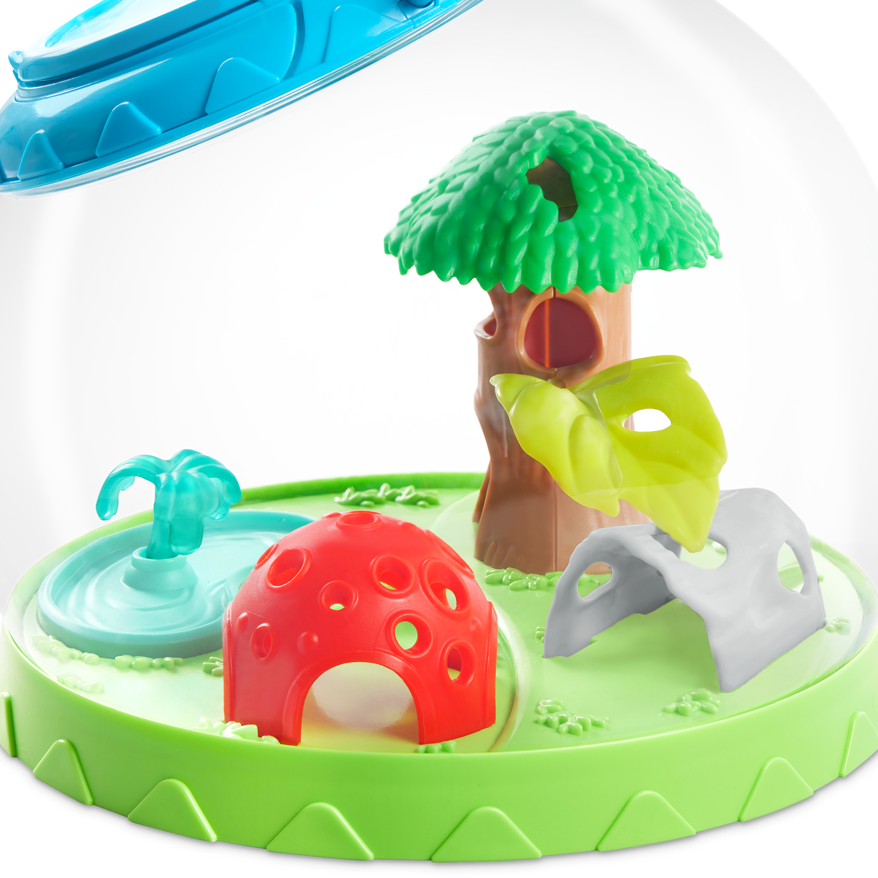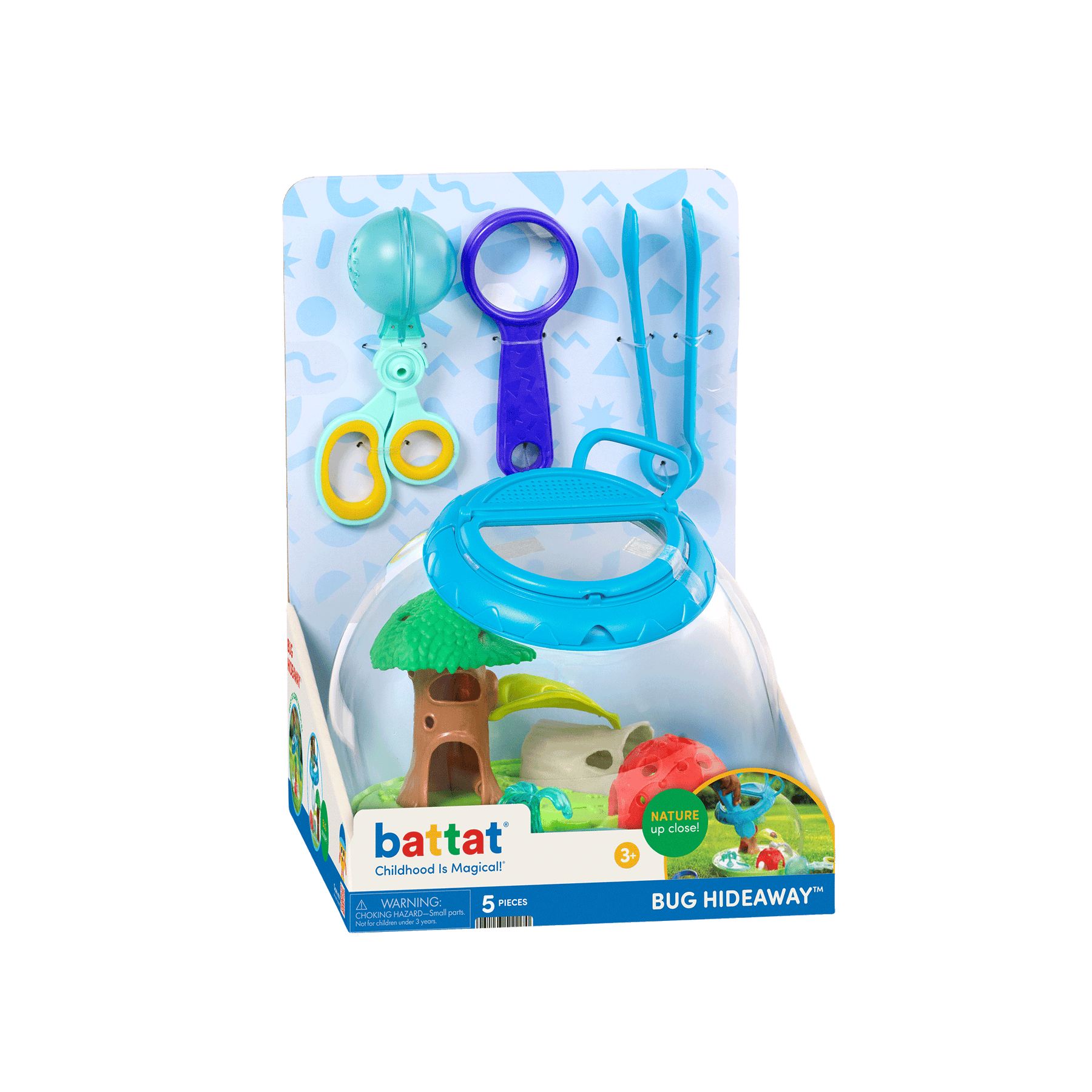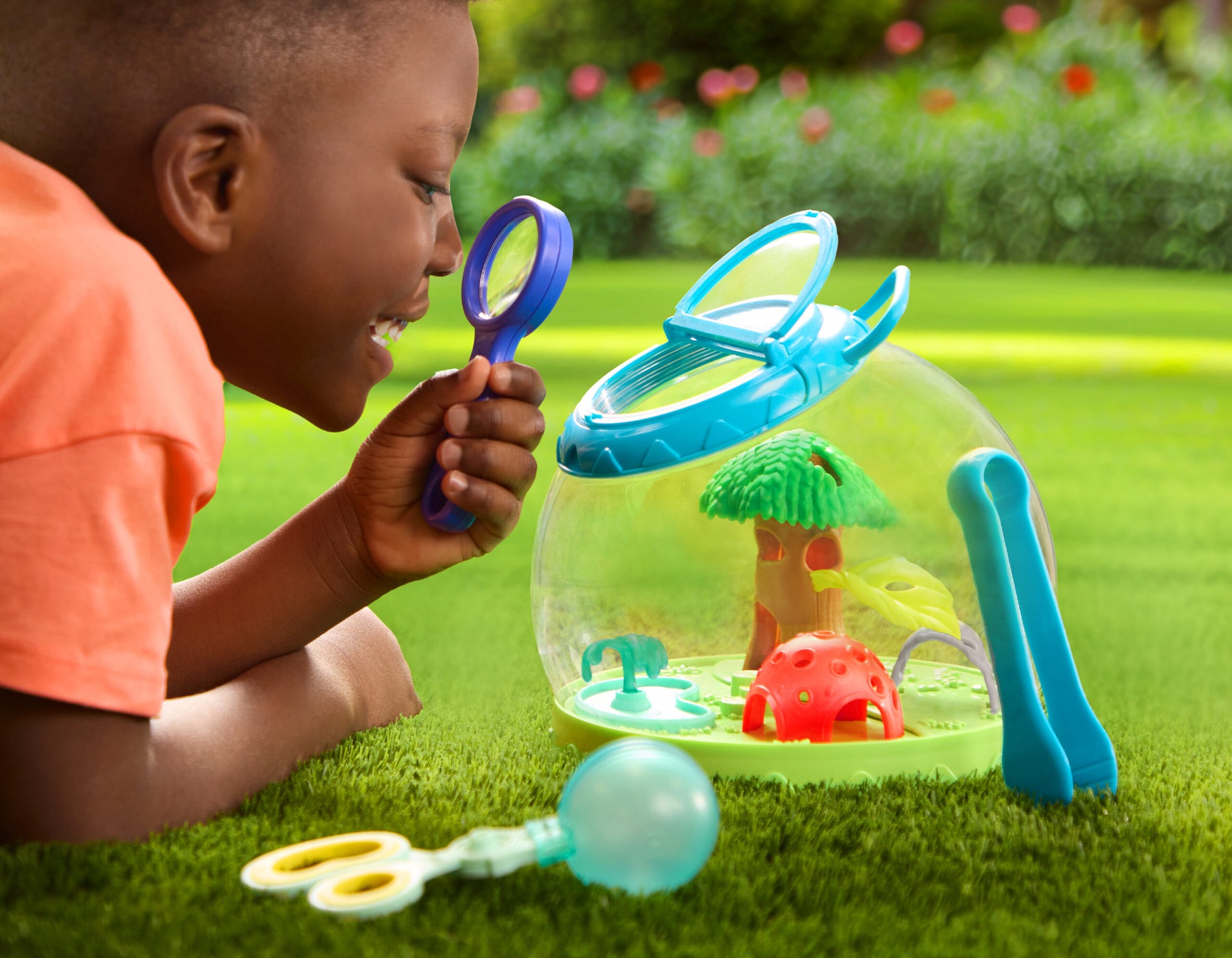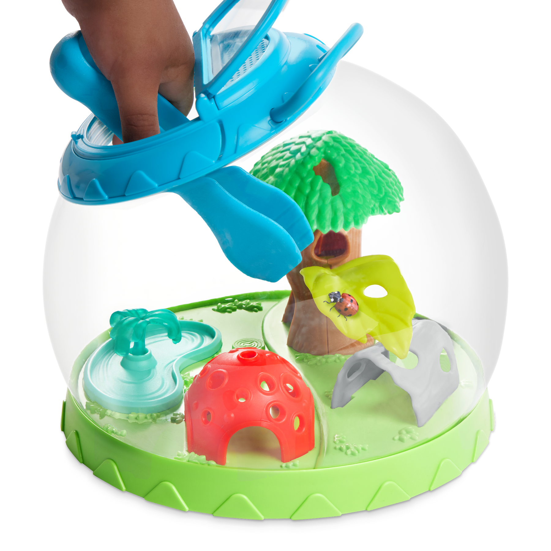 This 5-piece set lets little explorers safely observe their favorite critters inside a dome with a ventilated lid. The included magnifier helps kids get an up-close view, while the scooper and tweezers make catching bugs easy. Plus, leafy branches, a treehouse, and a log give tiny guests a natural hideaway! Add a splash of water to the fillable oasis and let the bug-friendly fun begin!