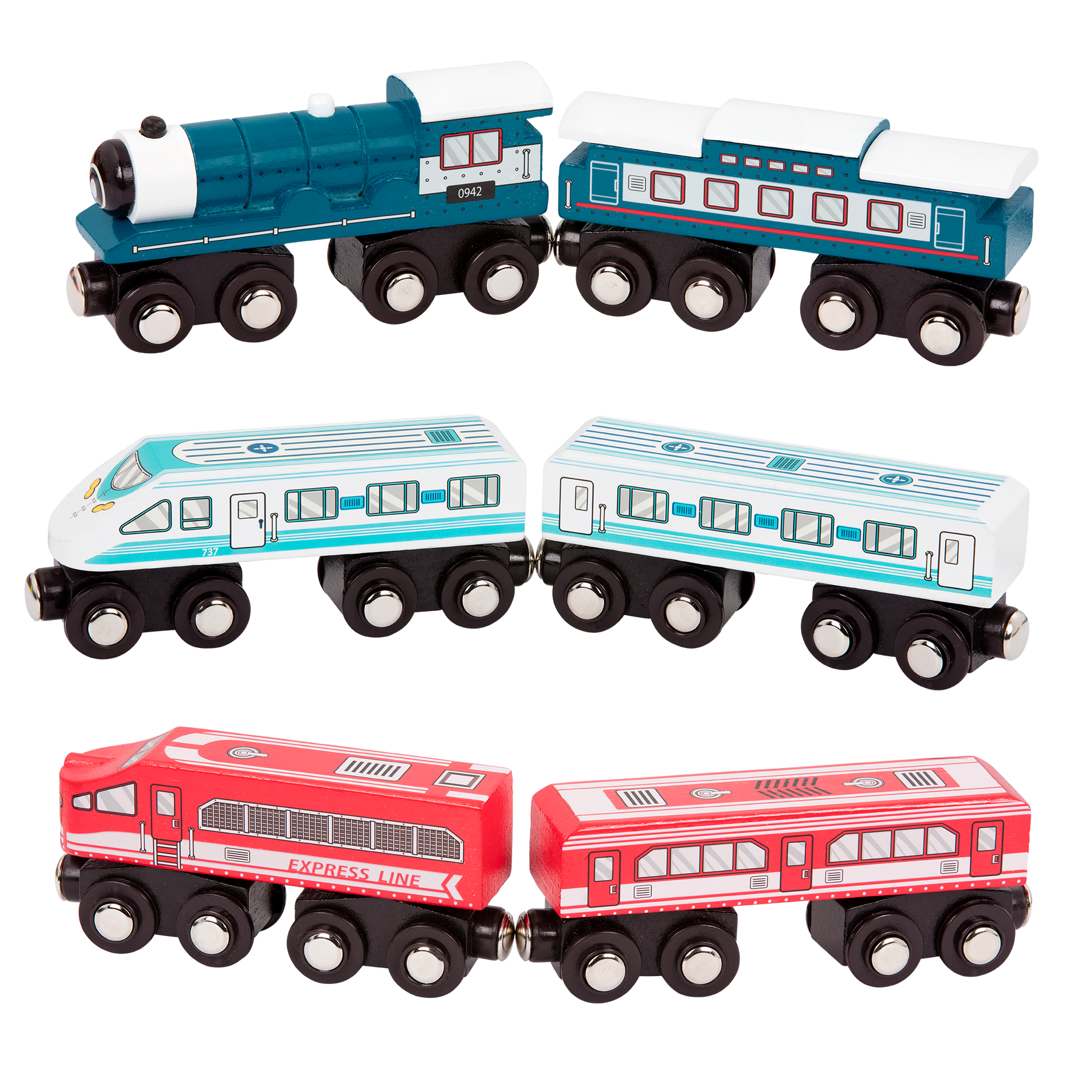 Choo-choo! Full steam ahead! All aboard the Battat express! This timeless wooden train set comes with 3 locomotives and 3 passenger vehicles in blue, white, and red. These tiny hands-friendly pieces are connectable by magnet – try linking them all together to create one looooong train! As your kiddo matches them up, they’ll also be improving their hand-eye coordination and fine motor skills. These retro-style toys are also great for pretend play! With your little one’s bright imagination, your living room could turn into a beautiful landscape to journey through. Made out of durable wood, these classic train toys can be passed from one generation to the next.