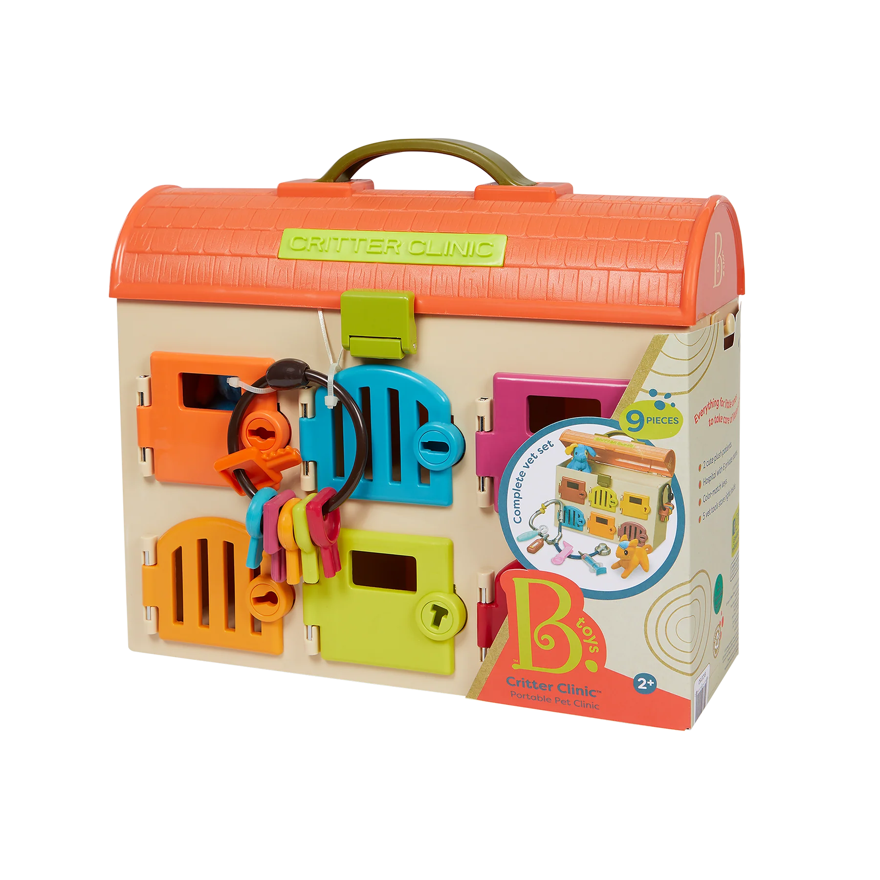 Keep kids busy for 9 lives or 7 dog years with the Critter Clinic from B. toys! This colorful animal hospital comes with 6 private rooms and 6 matching keys. Your vet in the making can play a color matching game, then treat a kitten or puppy with 5 kid-friendly tools – a stethoscope, mirror, syringe, tweezers and a thermometer. Not to mention, this vet kit doubles as storage and is easily portable, thanks to the handy handle on the roof! Playing pretend and caring for these plush patients can also develop a child’s sense of empathy and teach them about the importance of care. And because we at B. keep the environment in mind, parents will be happy to know that our packaging is 100% recyclable!