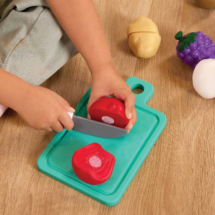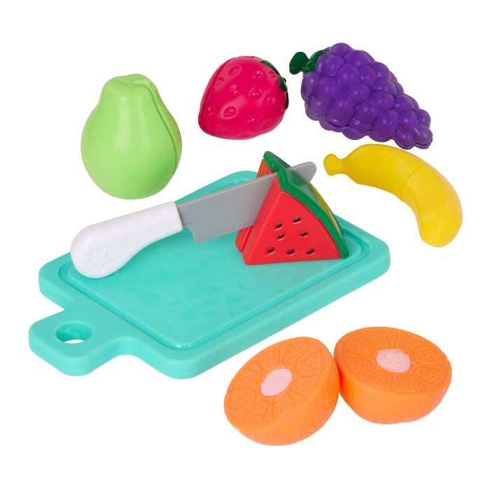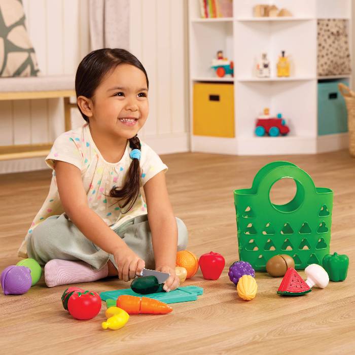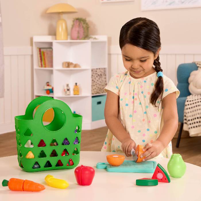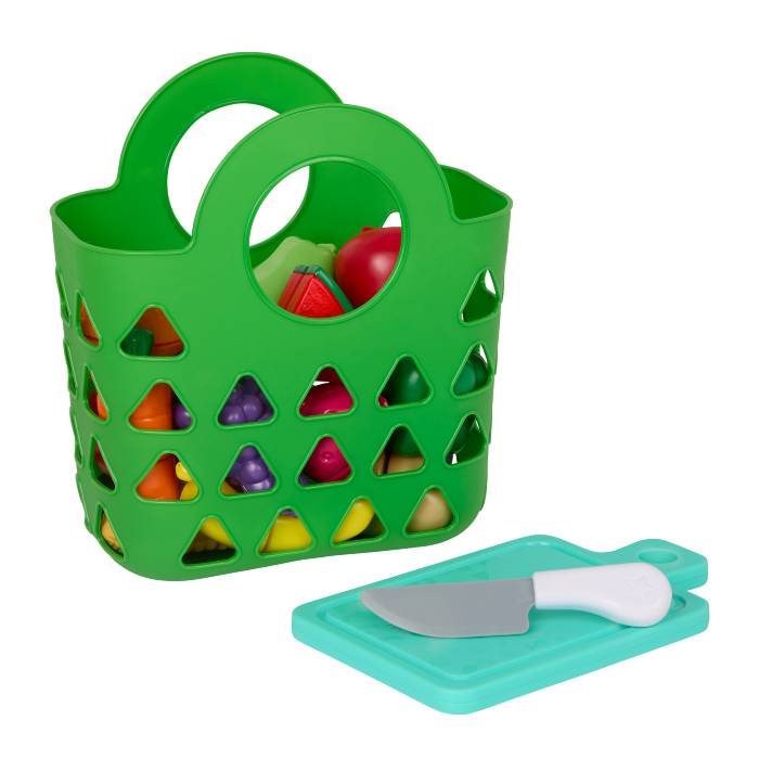 Battat Food Play Set, Chop, chop, chop with the Market Chop & Prep set from Battat! This 35-piece set of toy food for kids includes 16 colorful fruits and veggies that can be sliced in half with the kid-safe knife and cutting board. Just chop ’em up and stick them back together again! Also included is a green tote bag to go pretend shopping with. As little foodies chop, prep, and play, they’ll be developing their hand-eye coordination and fine motor skills along the way.